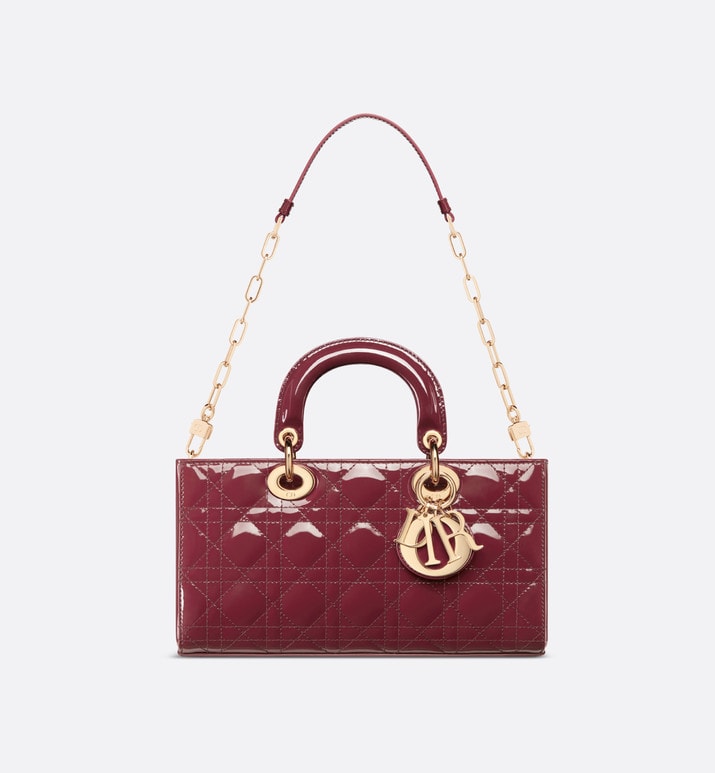 The Lady D-Joy bag captures the House's vision of elegance and beauty by showcasing the iconic streamlined aesthetic of the Lady Dior line. Crafted in deep fuchsia patent calfskin with Cannage stitching, the refined and timeless style is enhanced by pale gold-finish metal D.I.O.R. charms elegantly embellishing its silhouette. Featuring one removable chain strap and another adjustable and removable leather strap, the medium Lady D-Joy bag can be carried by hand, worn over the shoulder or crossbody as a daily companion.