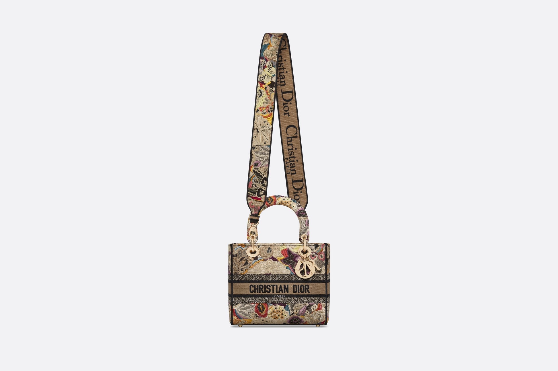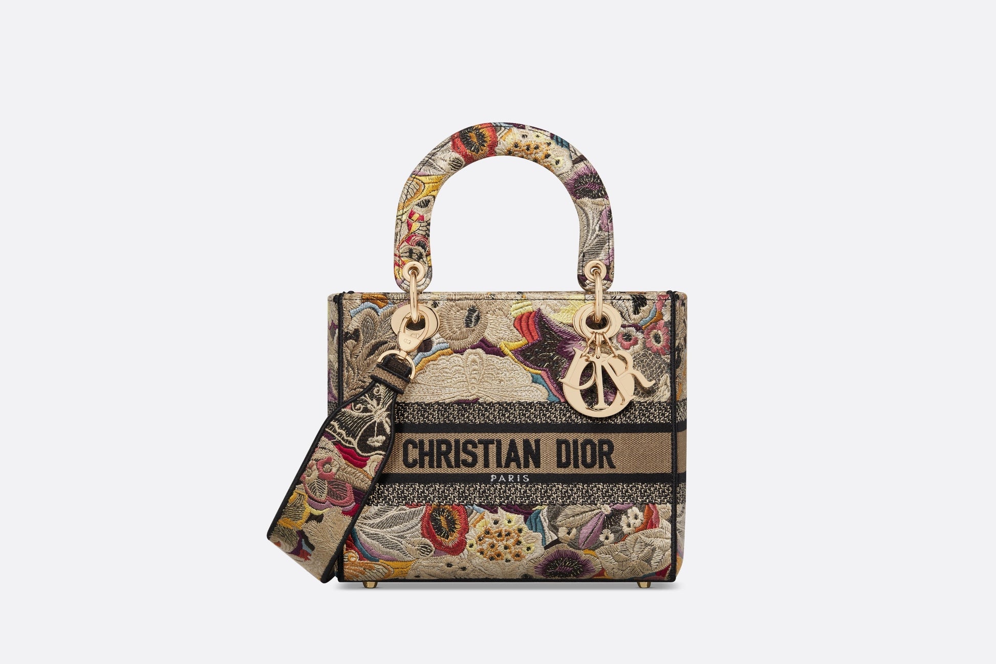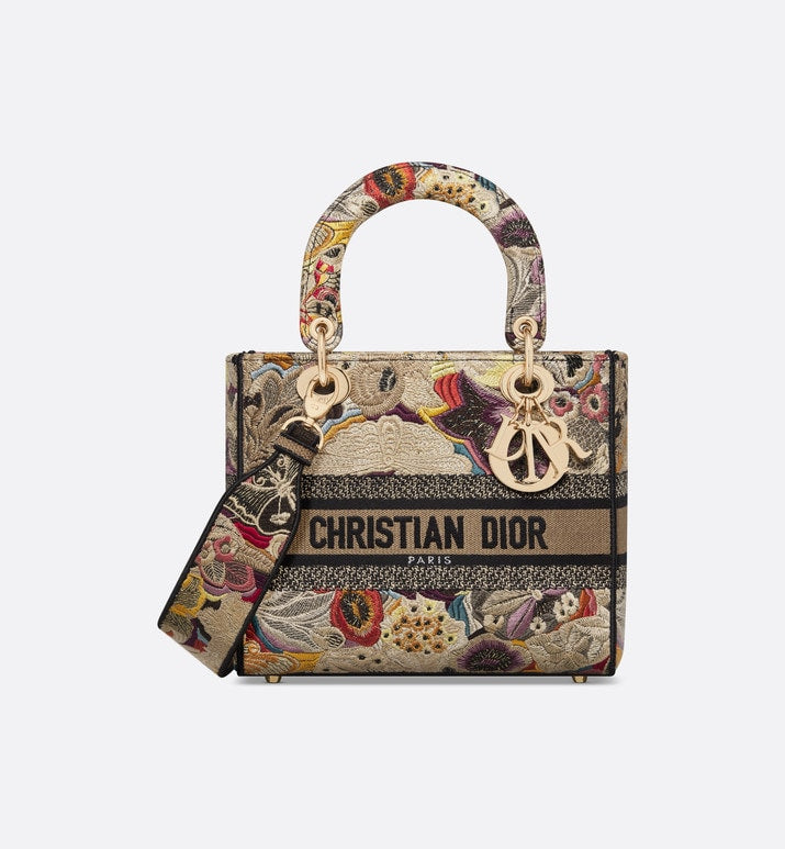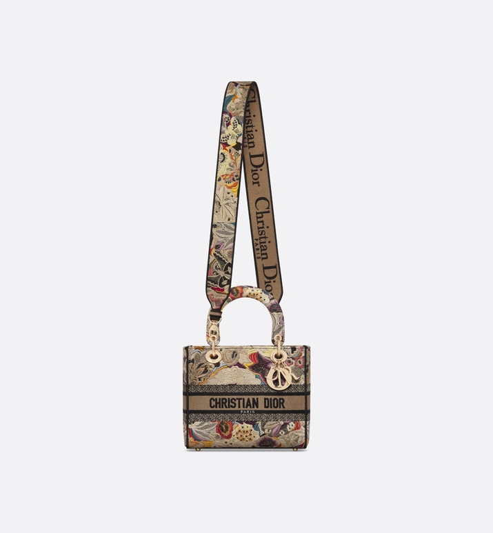 The Lady D-Lite bag combines classic elegance with House modernity. The style is fully embroidered with a beige multicolor Brocart Butterfly motif, showcasing the collection's signature butterfly and the House's exceptional savoir-faire in an opulent color palette. The front features a Christian Dior Paris signature while the D.I.O.R. charms in pale gold-finish metal enhance the silhouette. Equipped with a wide, removable embroidered shoulder strap, the medium Lady D-Lite bag can be carried by hand or worn crossbody.
