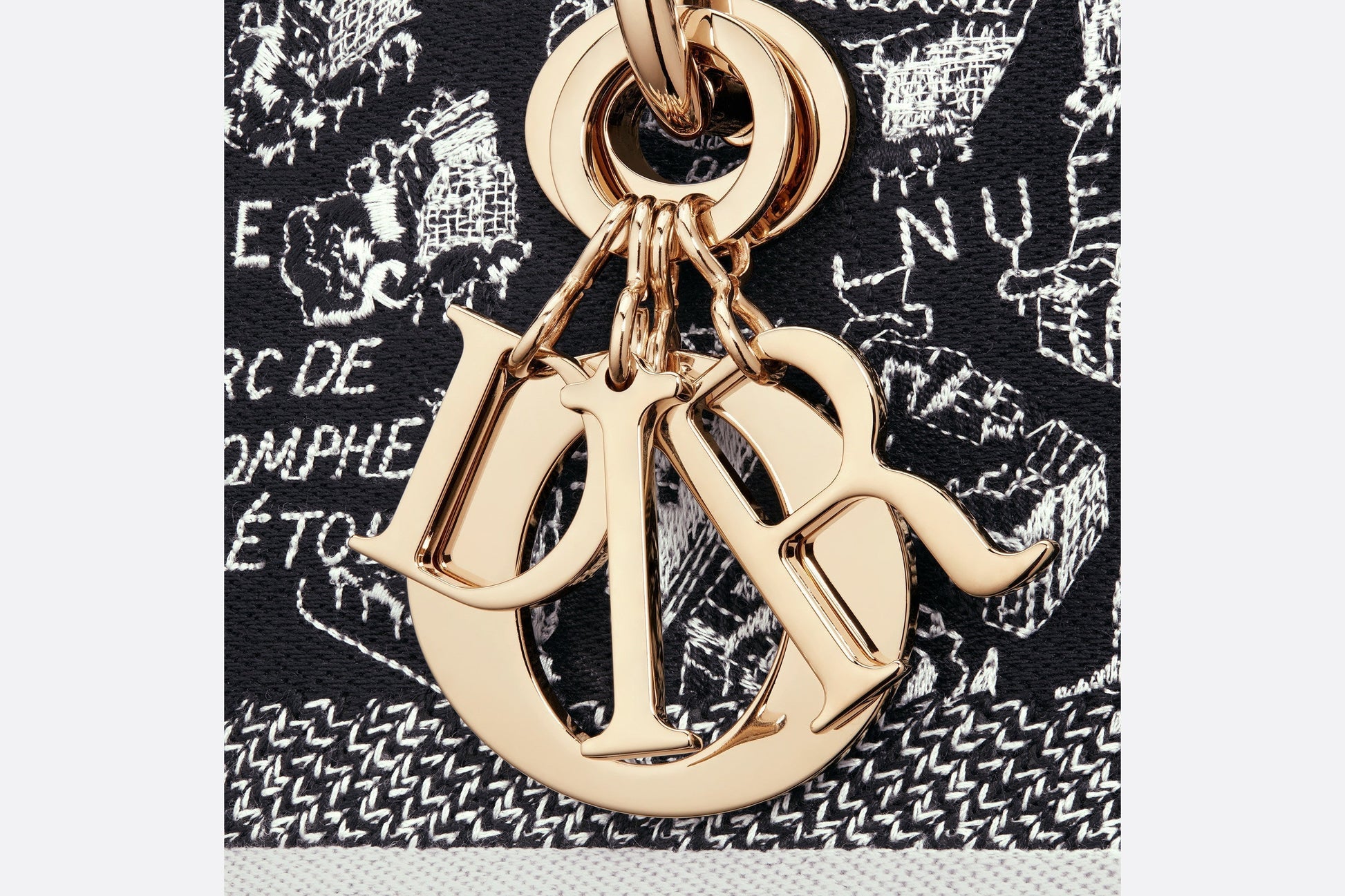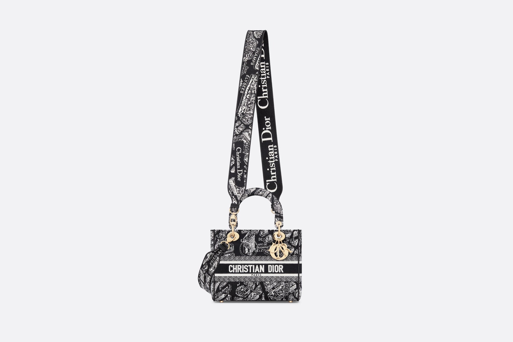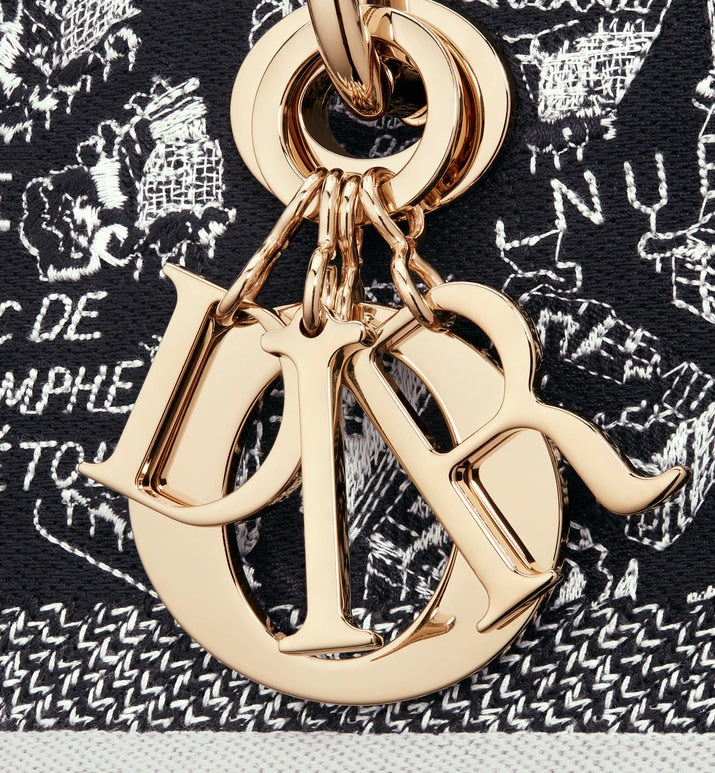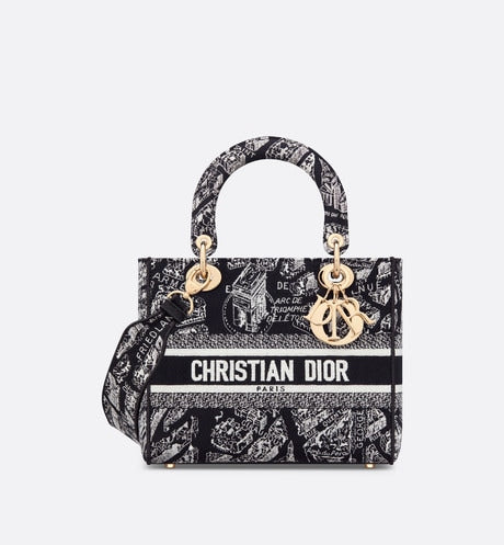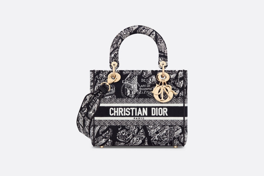 The Lady D-Lite bag combines classic elegance with House modernity. The style is fully embroidered with the season's signature black and white Plan de Paris motif, inspired by House archives and centered around Dior's historic address on Avenue Montaigne. The front features a Christian Dior Paris signature while the D.I.O.R. charms in pale gold-finish metal embellish and illuminate the silhouette. Equipped with a wide, reversible and removable embroidered shoulder strap, the medium Lady D-Lite bag can be carried by hand or worn crossbody.