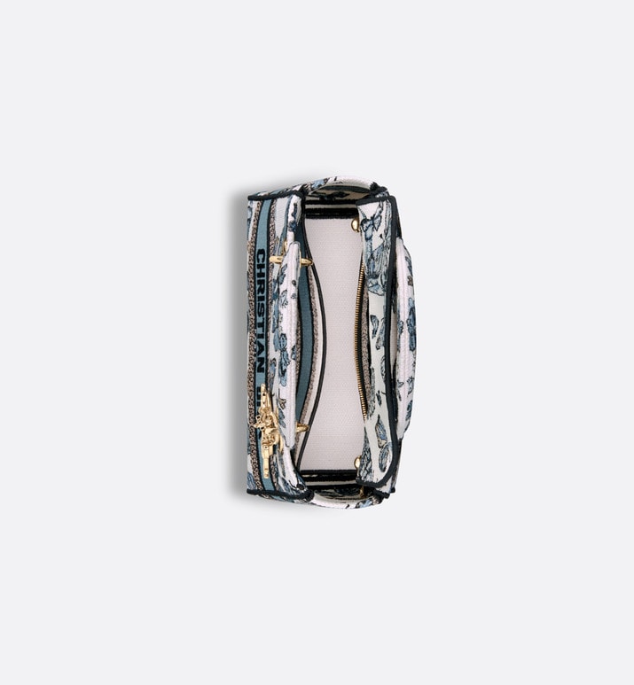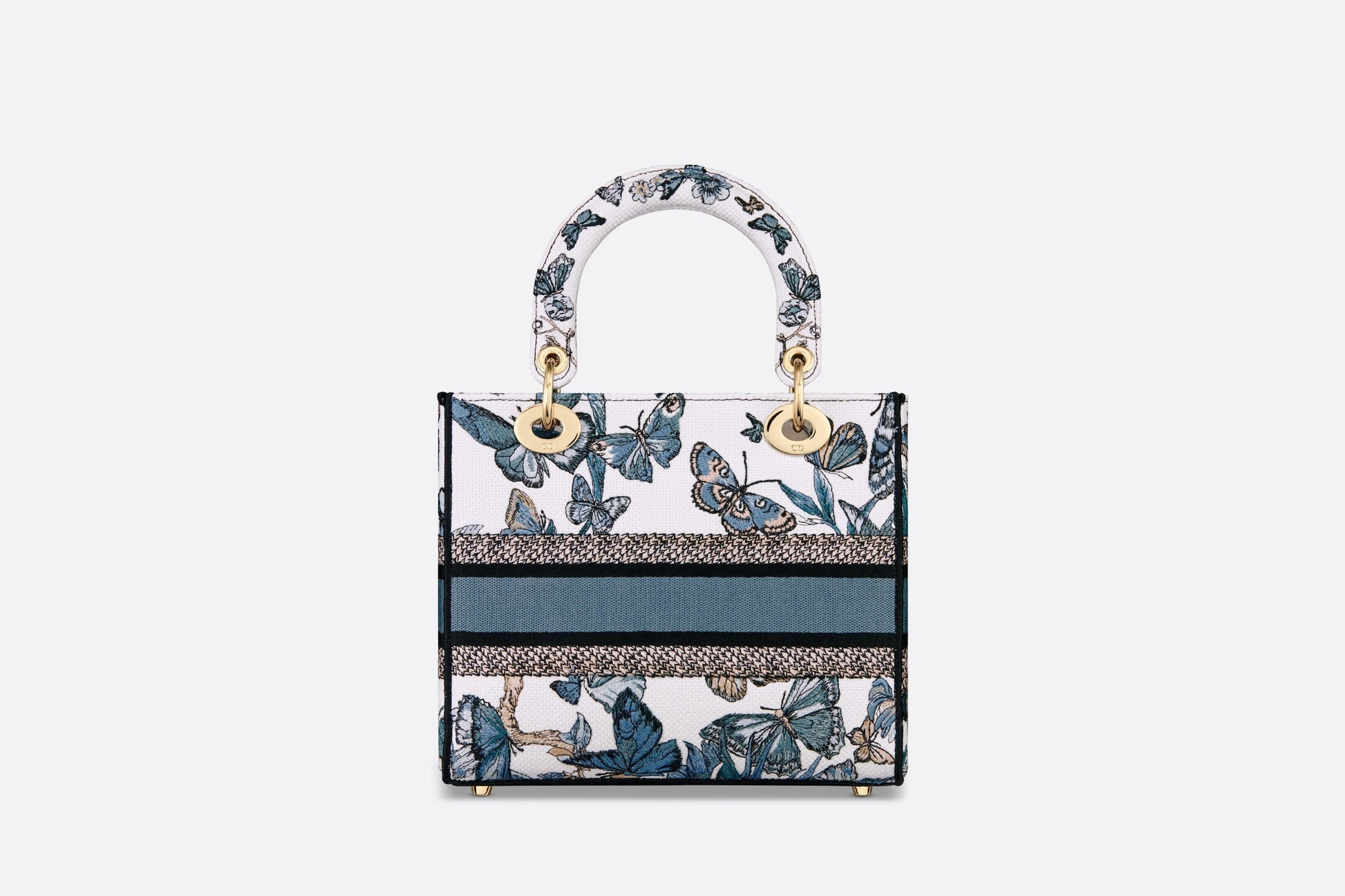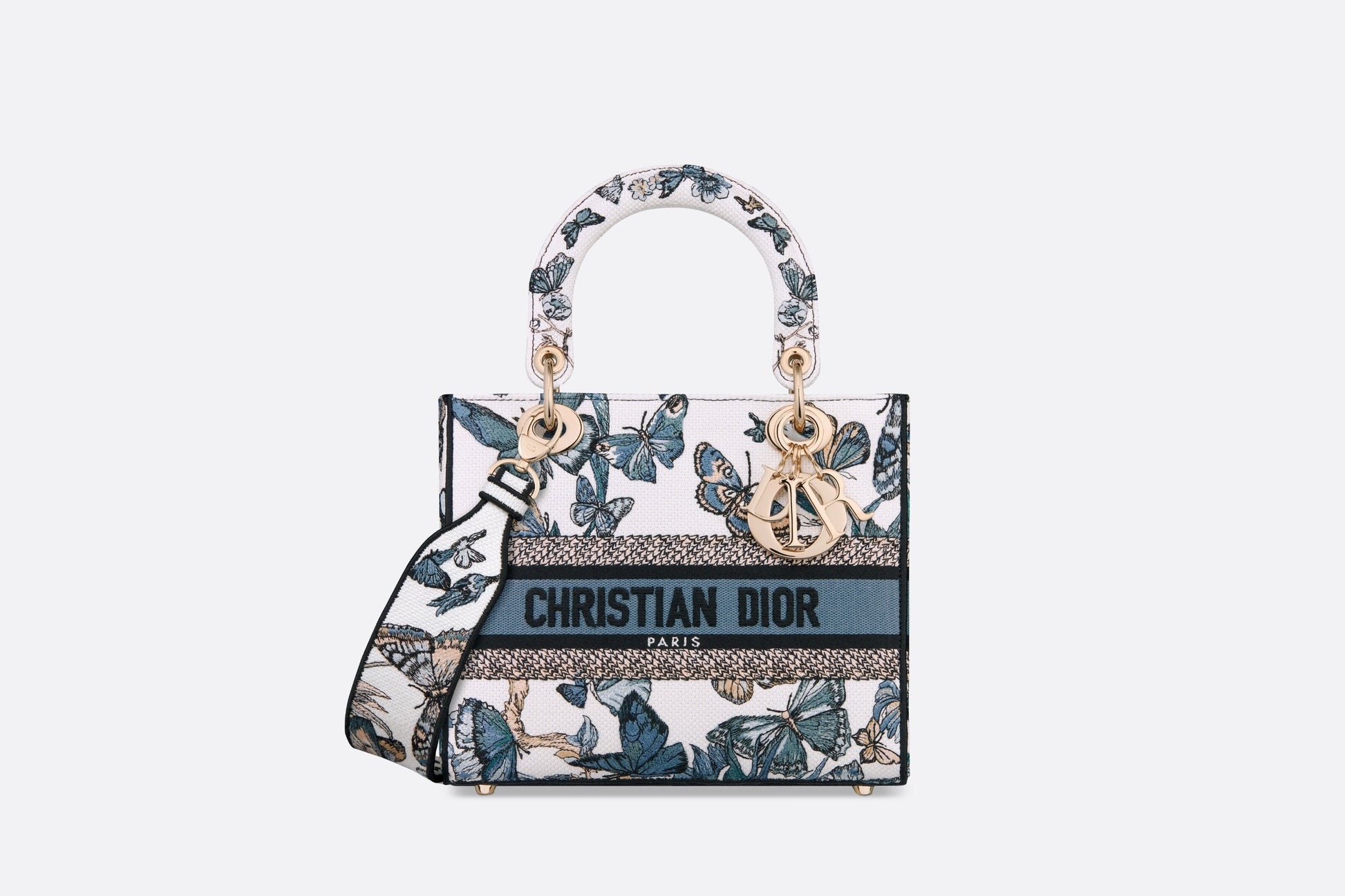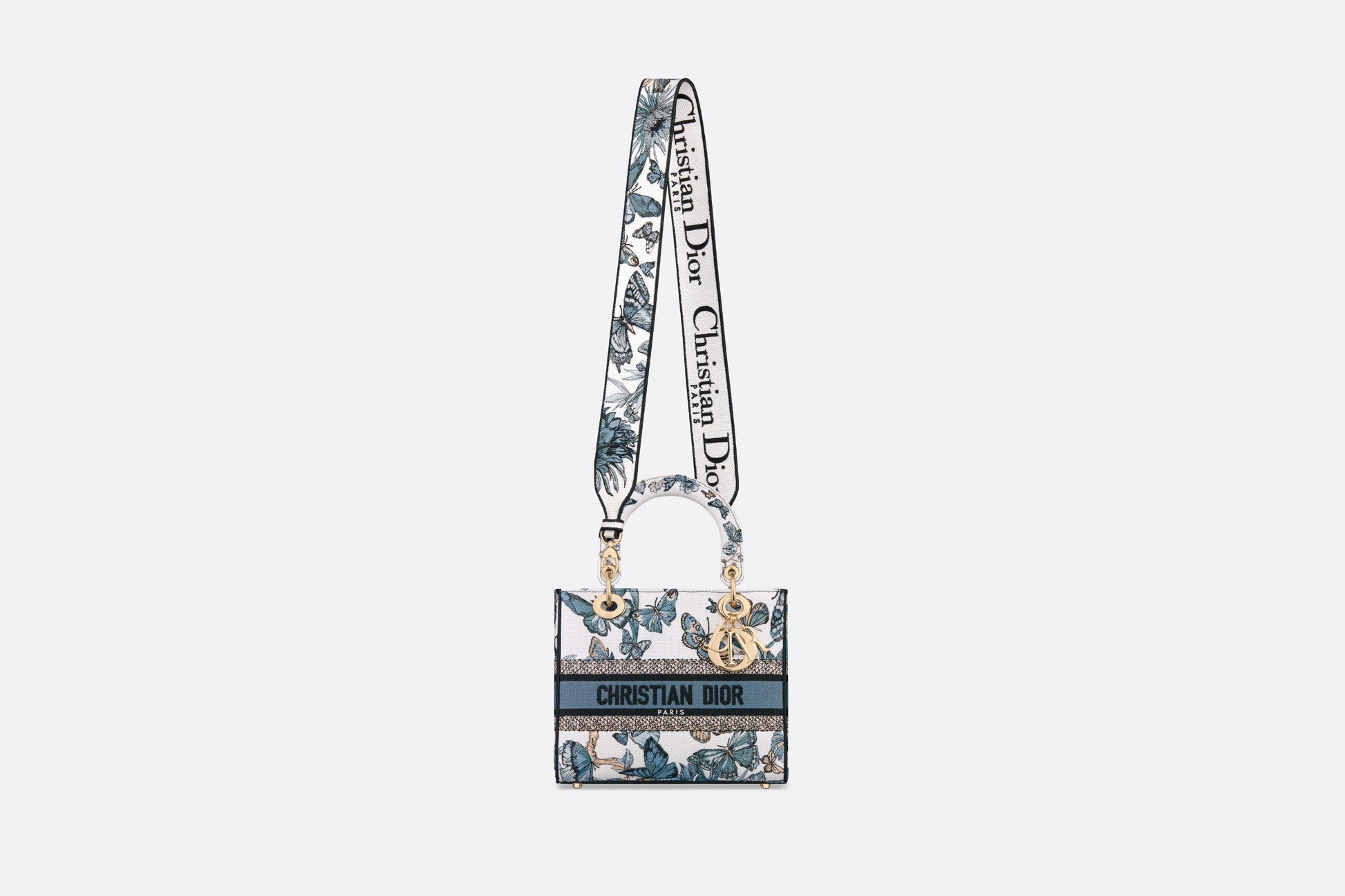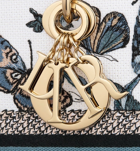 The Lady D-Lite bag combines classic elegance with House modernity. The style is fully embroidered with a white and pastel midnight blue Toile de Jouy Mexico motif by Pietro Ruffo, showcasing butterflies and traditional Mexican flowers in a concert of colors. A Christian Dior Paris signature adorns the front, while D.I.O.R. charms in pale gold-finish metal enhance and highlight the silhouette. Featuring a wide, removable embroidered shoulder strap, the medium Lady D-Lite bag can be carried by hand or worn crossbody.