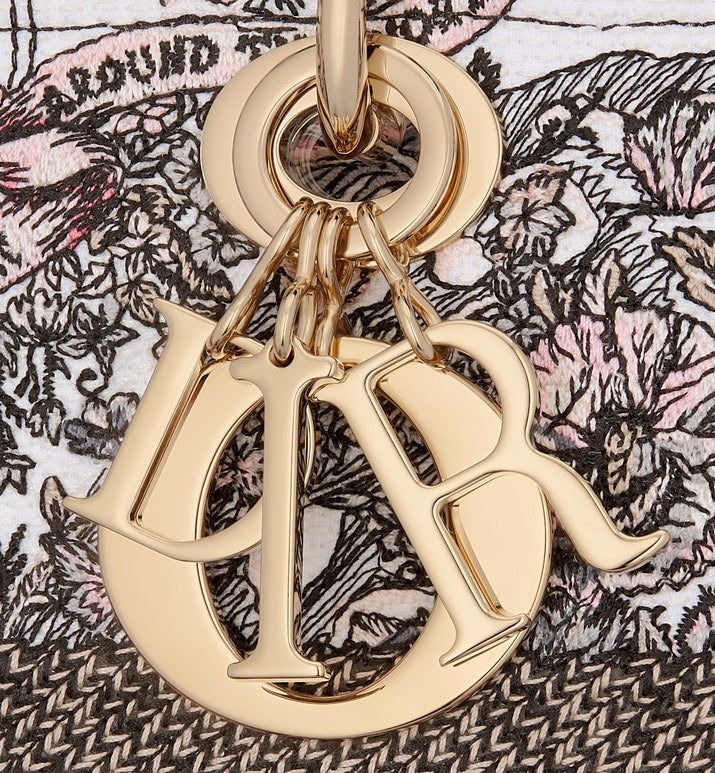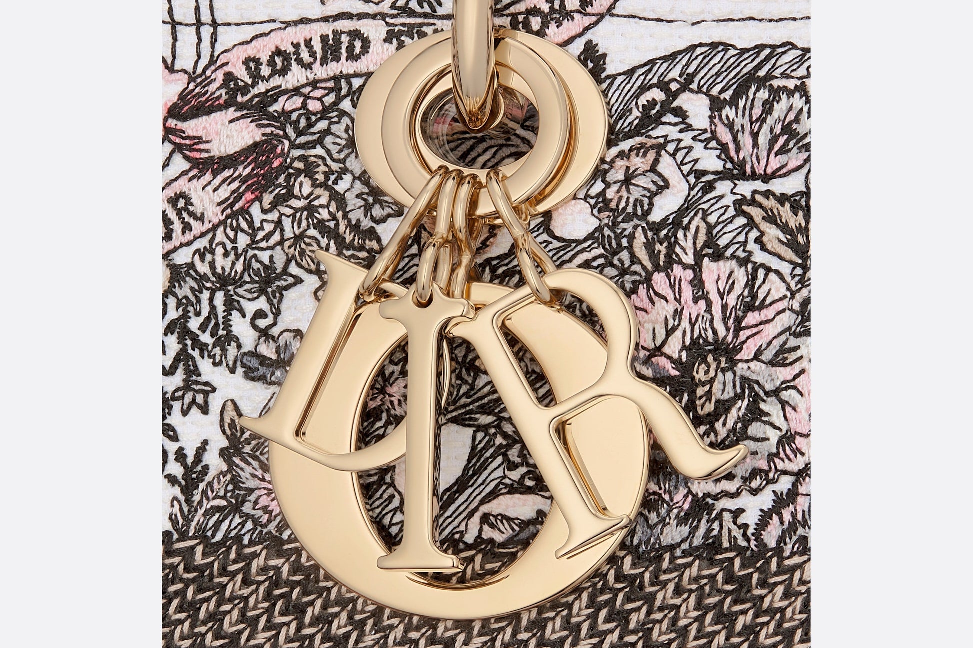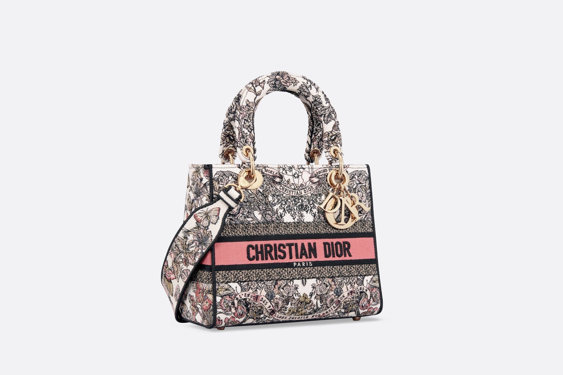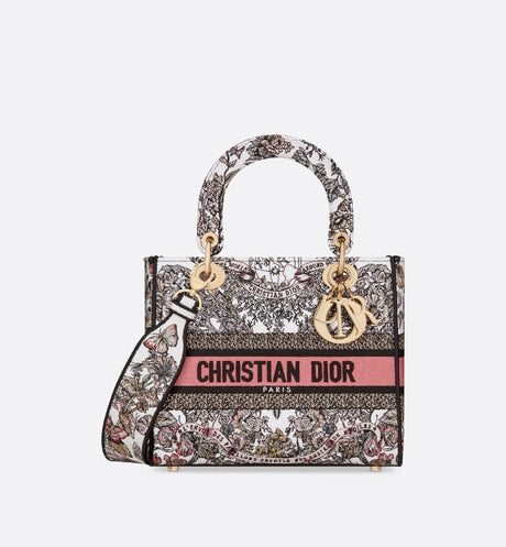 The Lady D-Lite bag combines classic elegance with House modernity. The style is fully embroidered with a white and pastel pink Butterfly Around The World motif by Pietro Ruffo, showcasing the collection's signature butterfly embellished with the words L'envol des papillons dévoile nos désirs aux étoiles. The front features a Christian Dior Paris signature, while D.I.O.R. charms in pale gold-finish metal further enhance the silhouette. Equipped with a wide, removable embroidered shoulder strap, the medium Lady D-Lite bag can be carried by hand or worn crossbody.