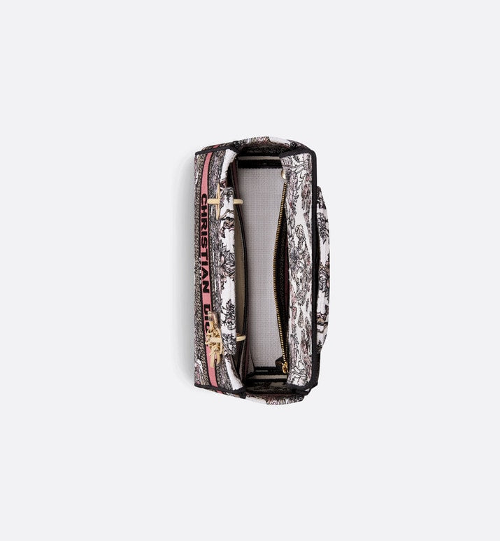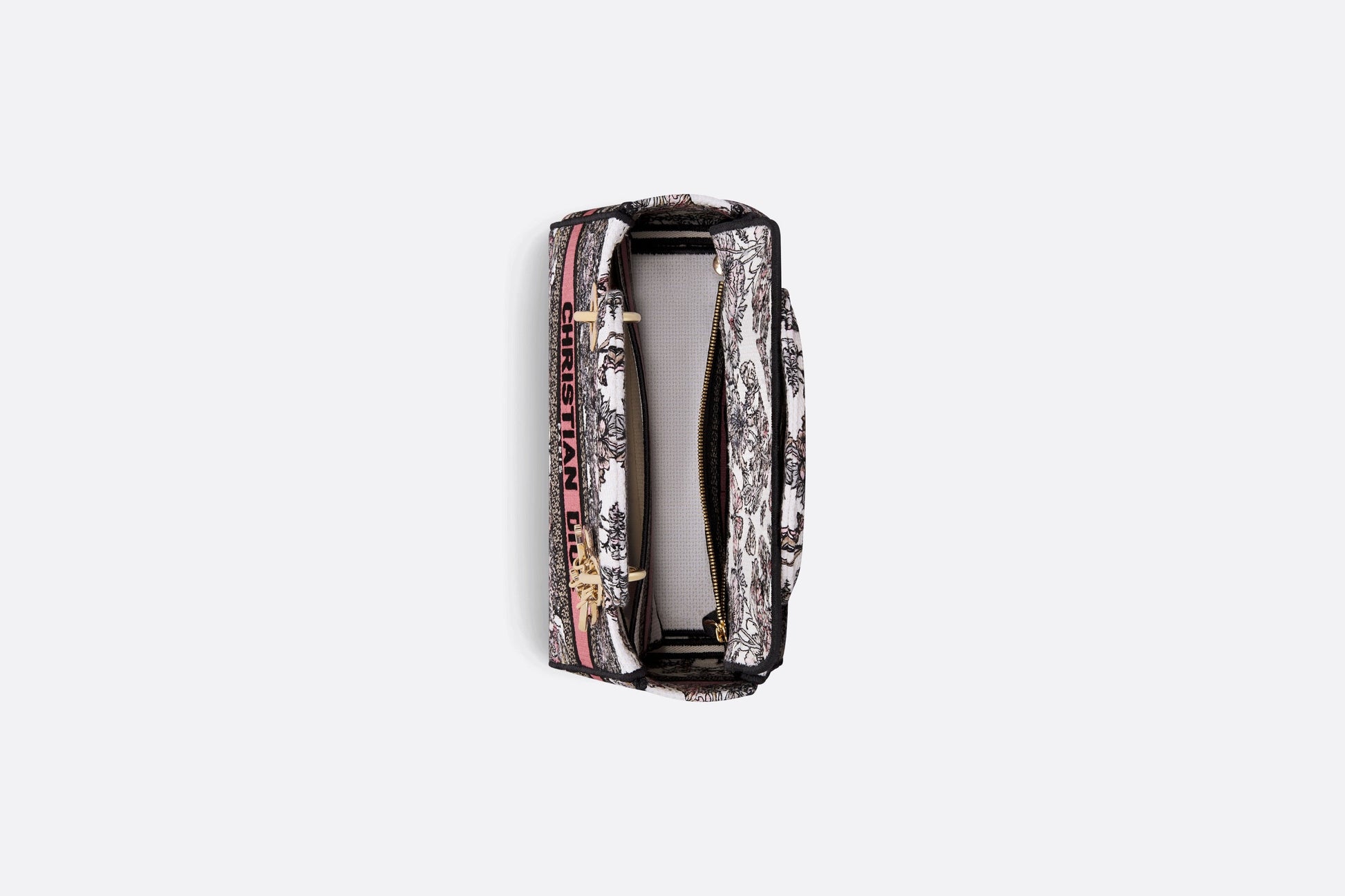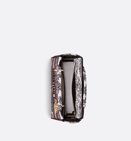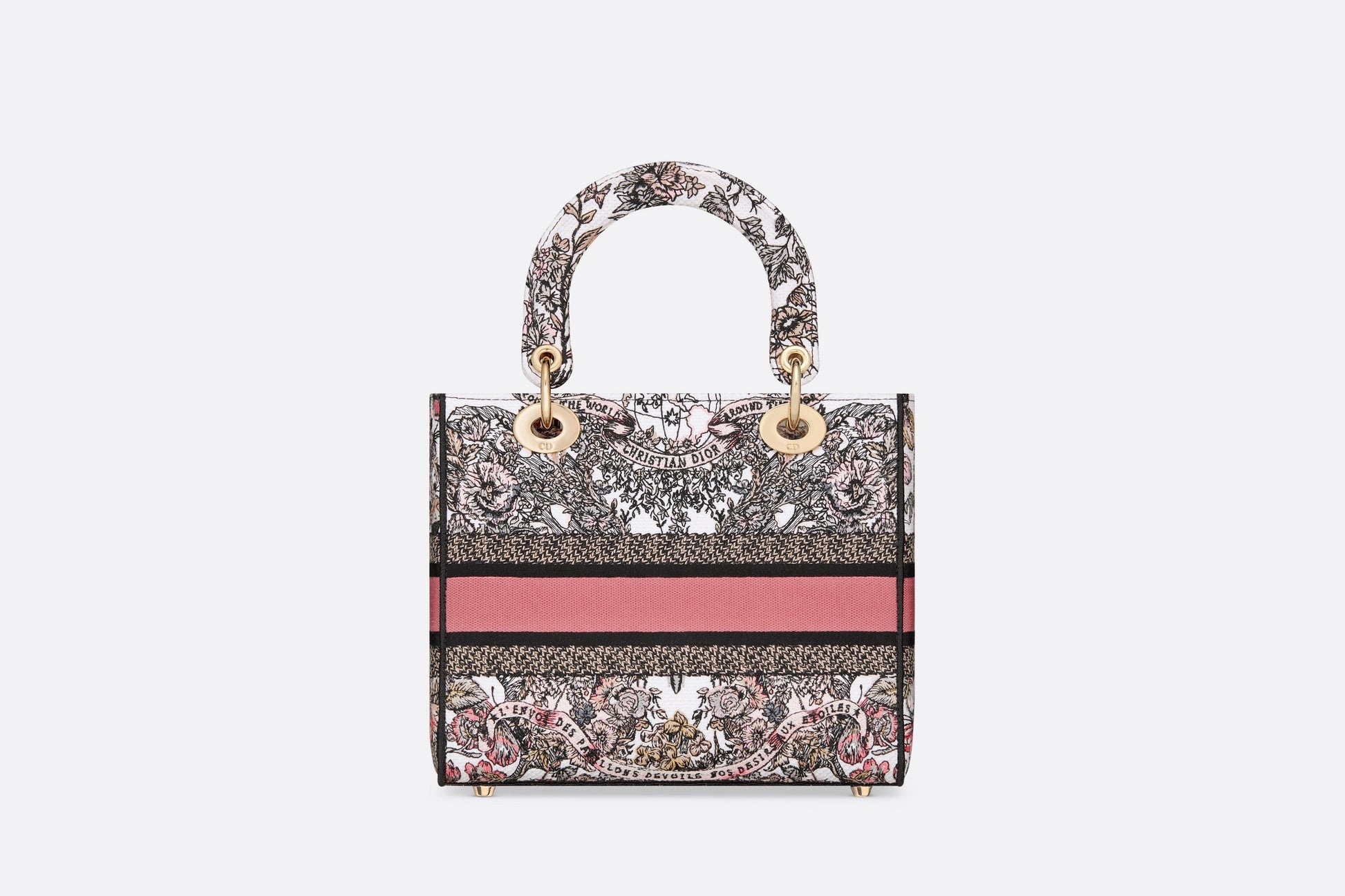 The Lady D-Lite bag combines classic elegance with House modernity. The style is fully embroidered with a white and pastel pink Butterfly Around The World motif by Pietro Ruffo, showcasing the collection's signature butterfly embellished with the words L'envol des papillons dévoile nos désirs aux étoiles. The front features a Christian Dior Paris signature, while D.I.O.R. charms in pale gold-finish metal further enhance the silhouette. Equipped with a wide, removable embroidered shoulder strap, the medium Lady D-Lite bag can be carried by hand or worn crossbody.