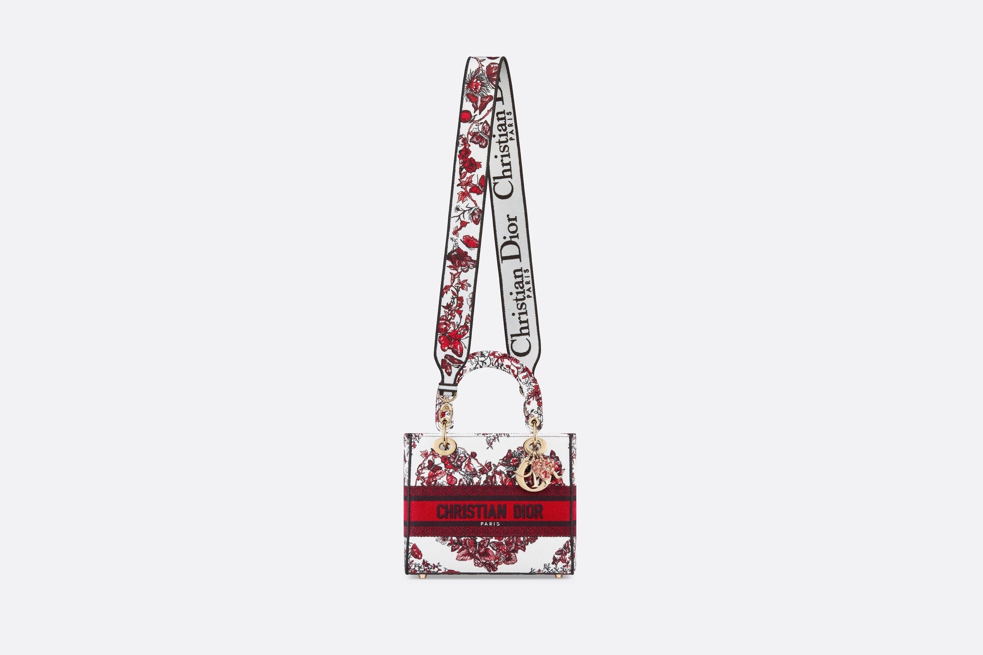 The Lady D-Lite bag embodies classic elegance and the House's modern aesthetic. Celebrating Dior's vision of love and romance, the style is fully embroidered with a white and red Le Cœur des Papillons motif by Pietro Ruffo, showcasing a bouquet of flowers and butterflies. The front is accented by the Christian Dior Paris signature, while pale gold-finish metal D.I.O.R. charms are enhanced by a Heart charm decorated with butterflies in red lacquer. Featuring a wide, removable embroidered shoulder strap, the medium Lady D-Lite bag can be carried by hand or worn crossbody.