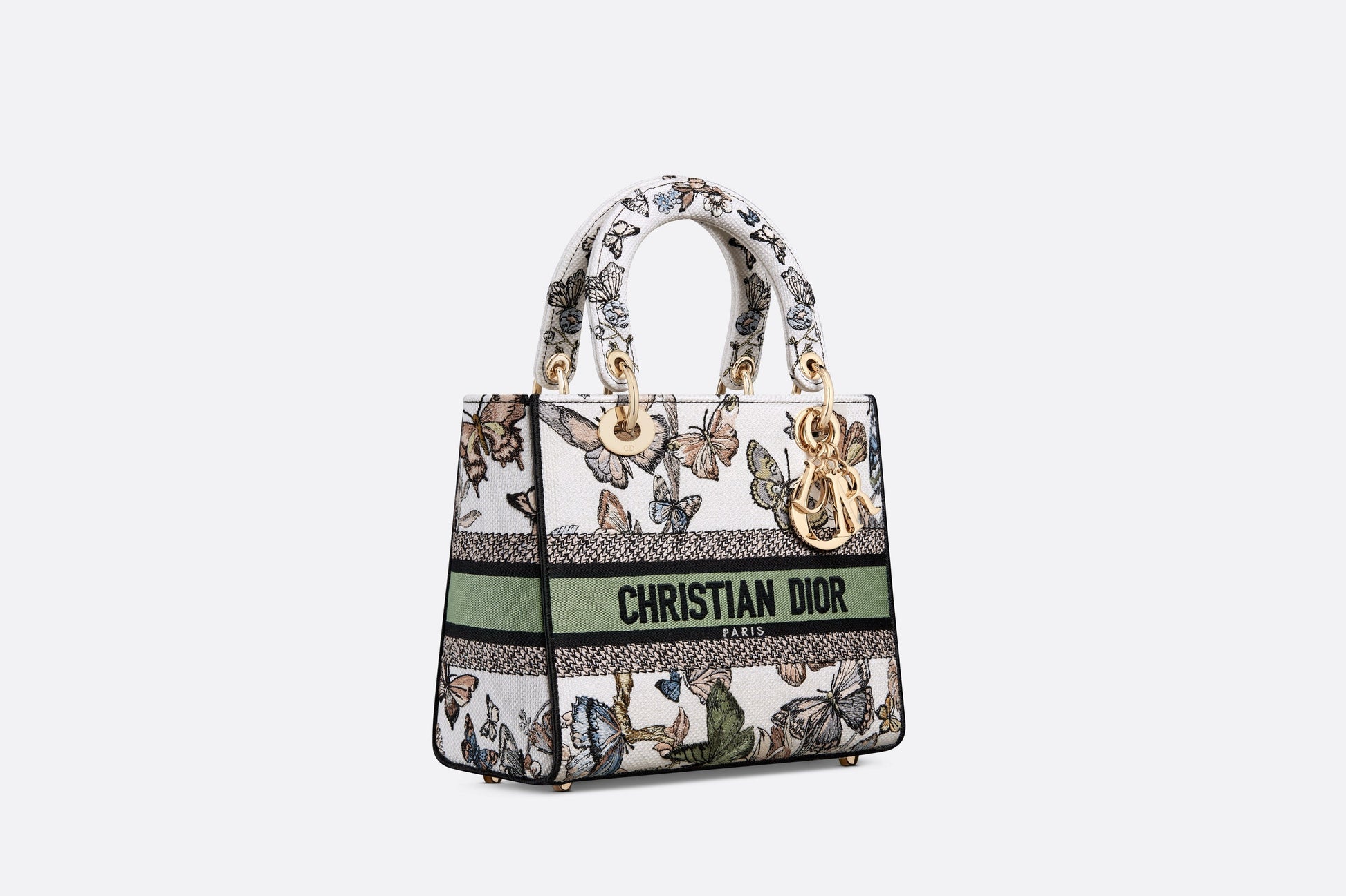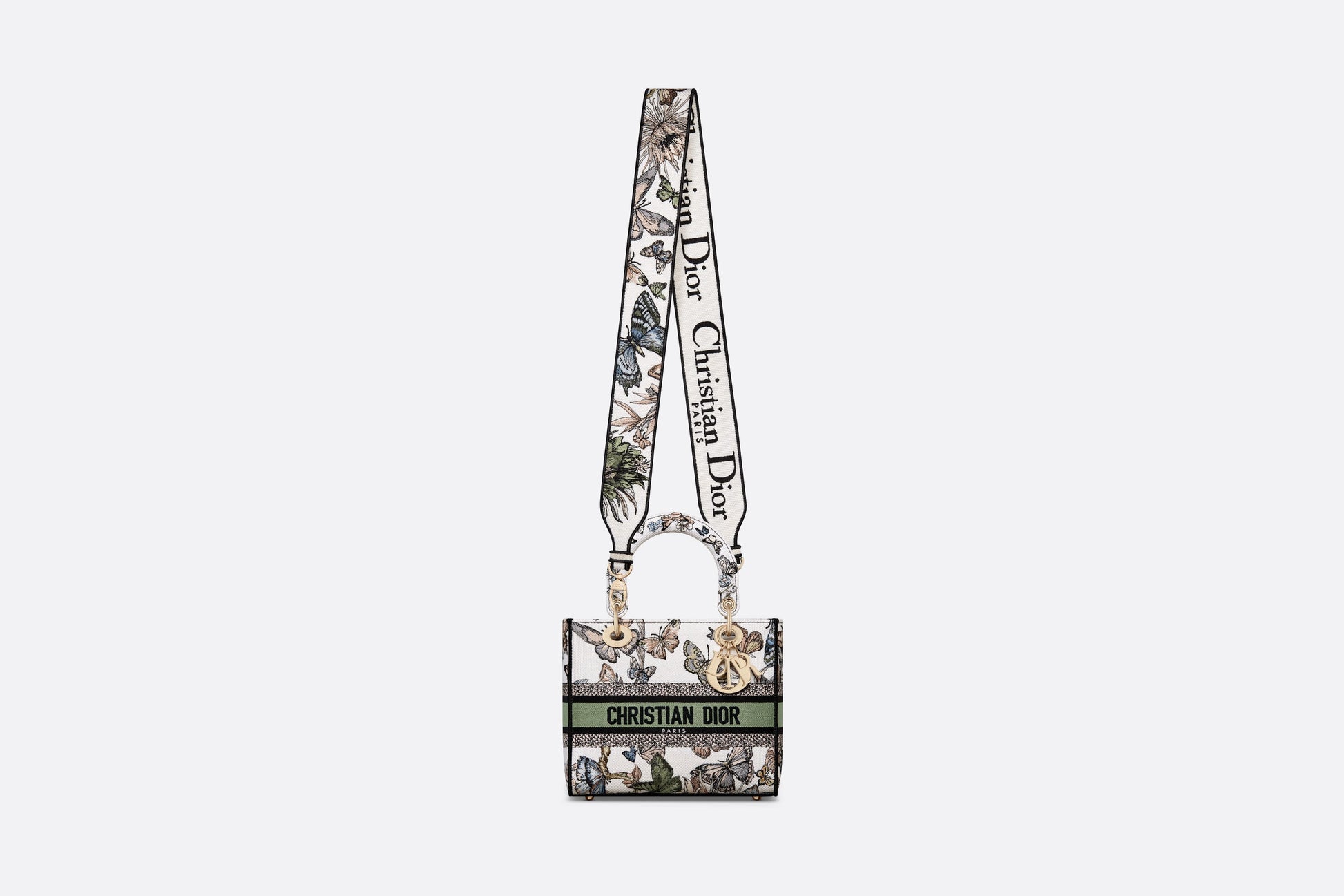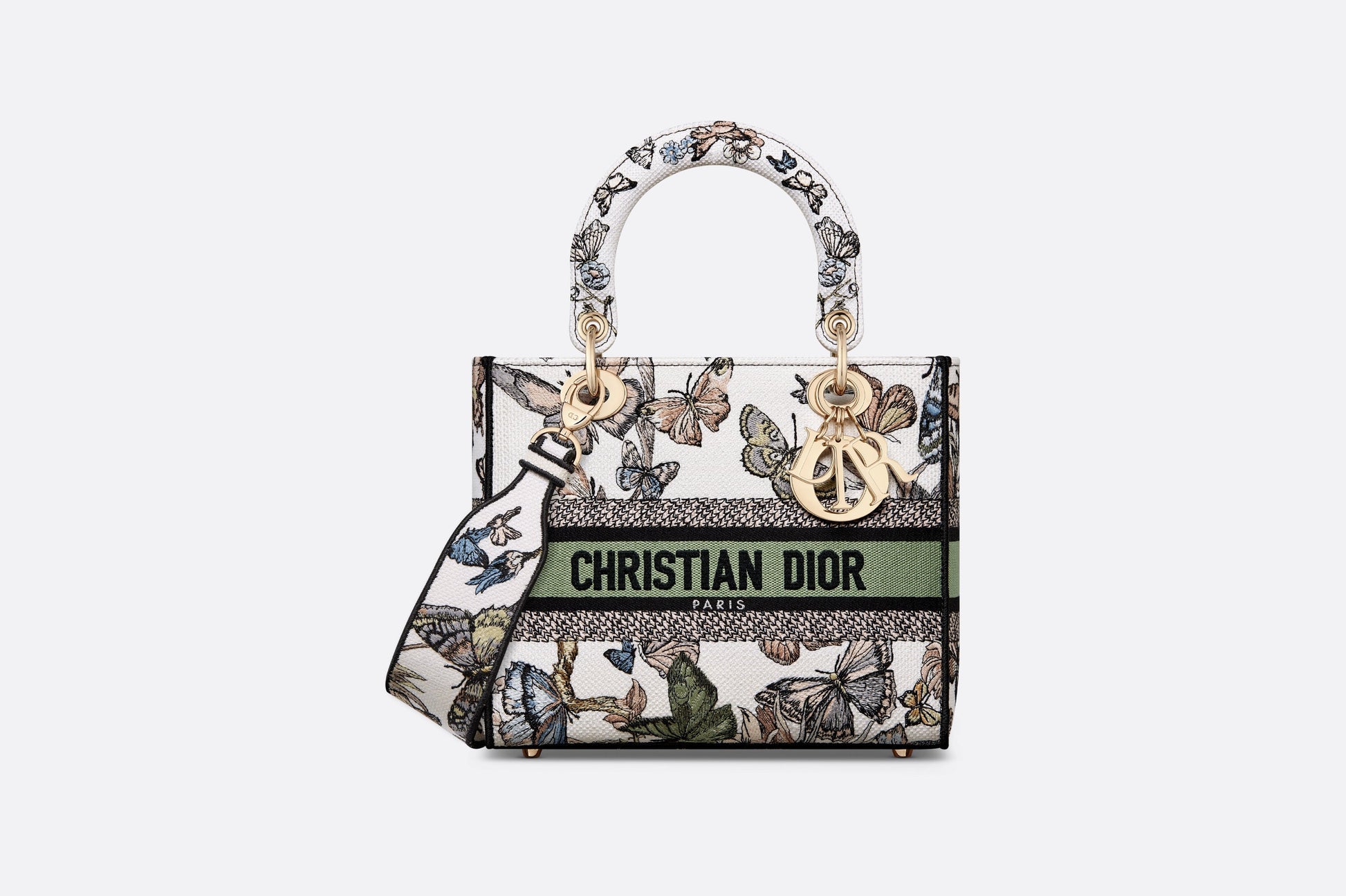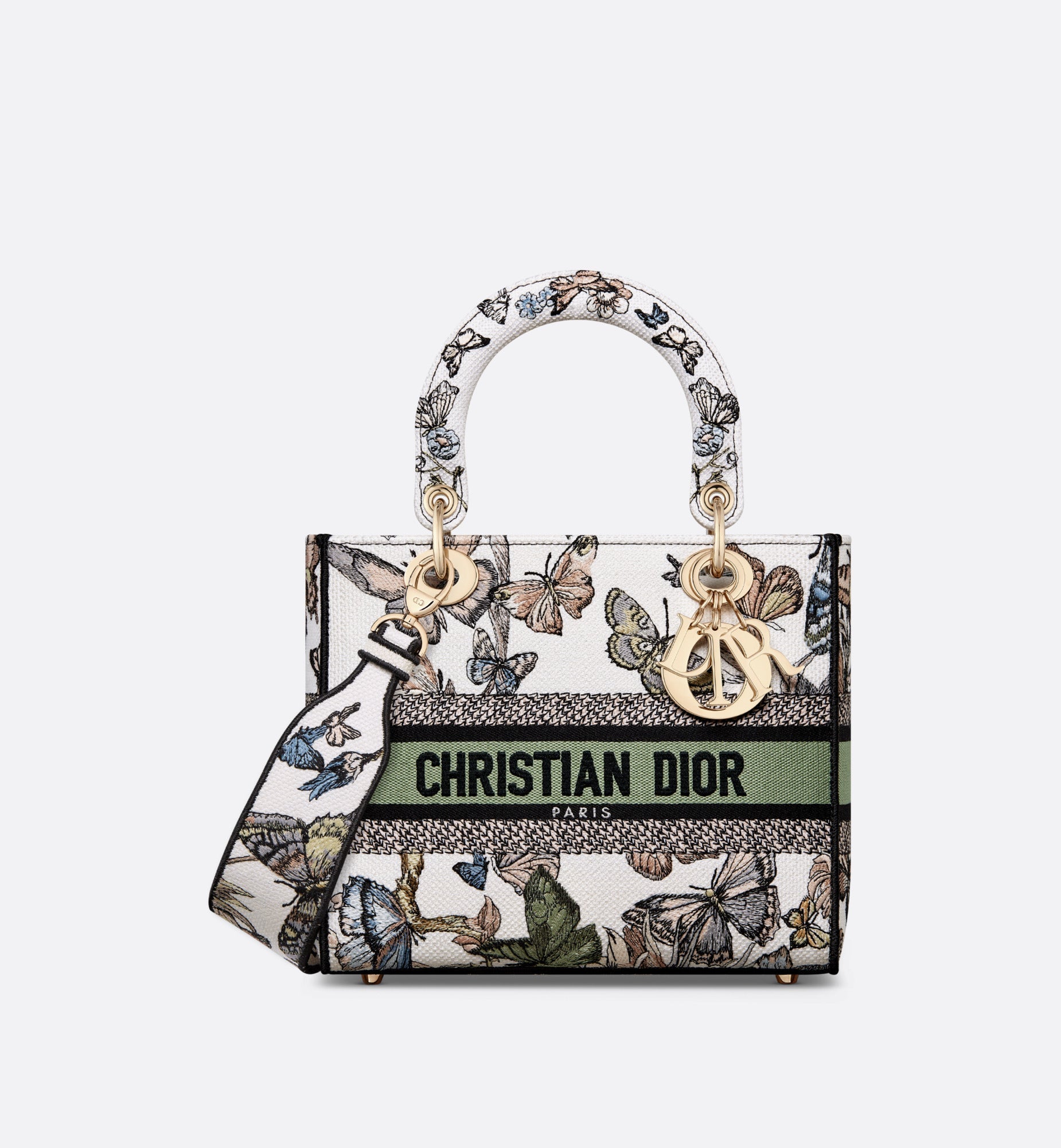The Lady D-Lite bag combines classic elegance with House modernity. The style is fully embroidered with a white multicolor Toile de Jouy Mexico motif by Pietro Ruffo, showcasing butterflies and traditional Mexican flowers in a concert of colors. A Christian Dior Paris signature adorns the front, while D.I.O.R. charms in pale gold-finish metal enhance and highlight the silhouette. Featuring a wide, removable embroidered shoulder strap, the medium Lady D-Lite bag can be carried by hand or worn crossbody.