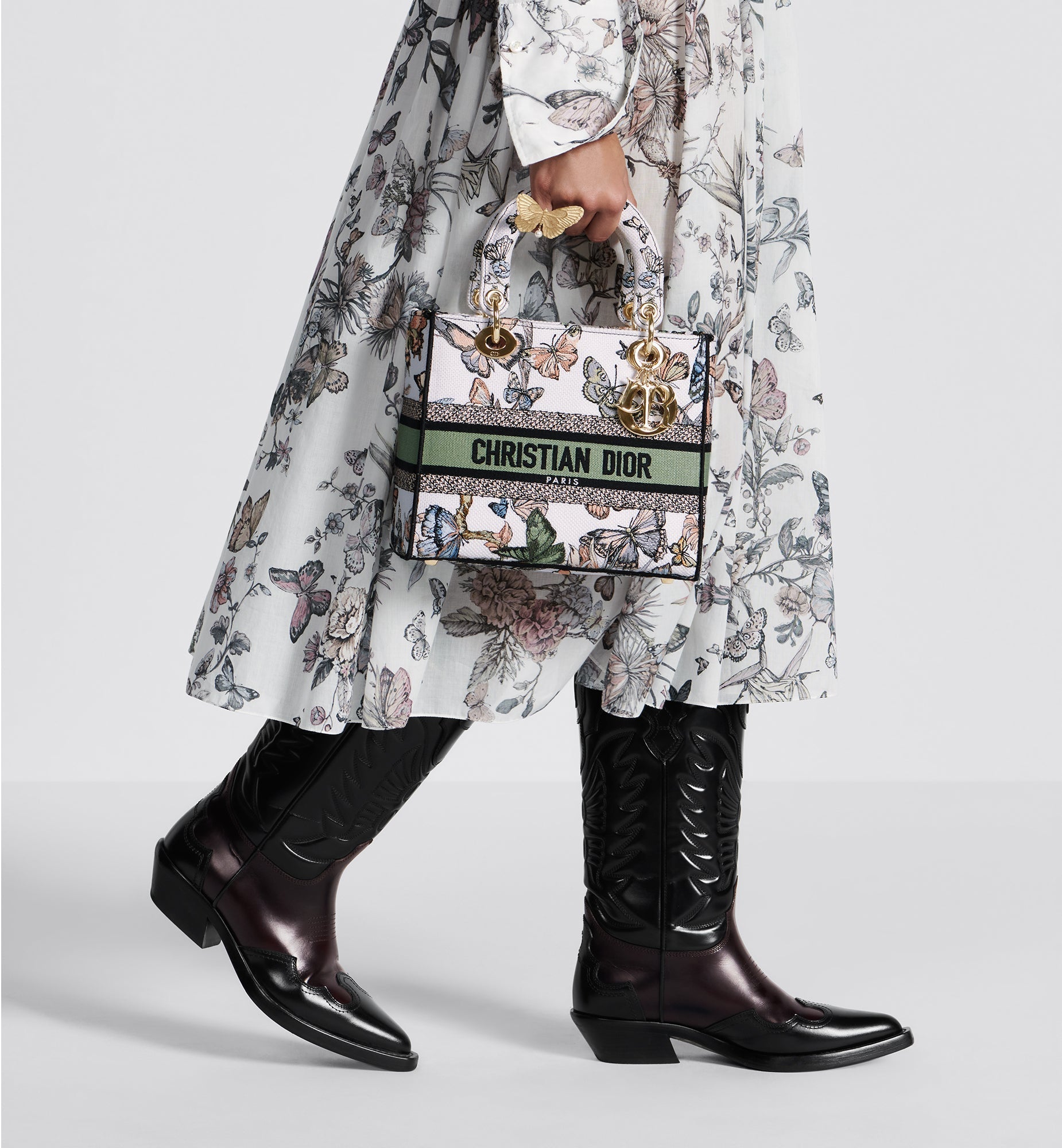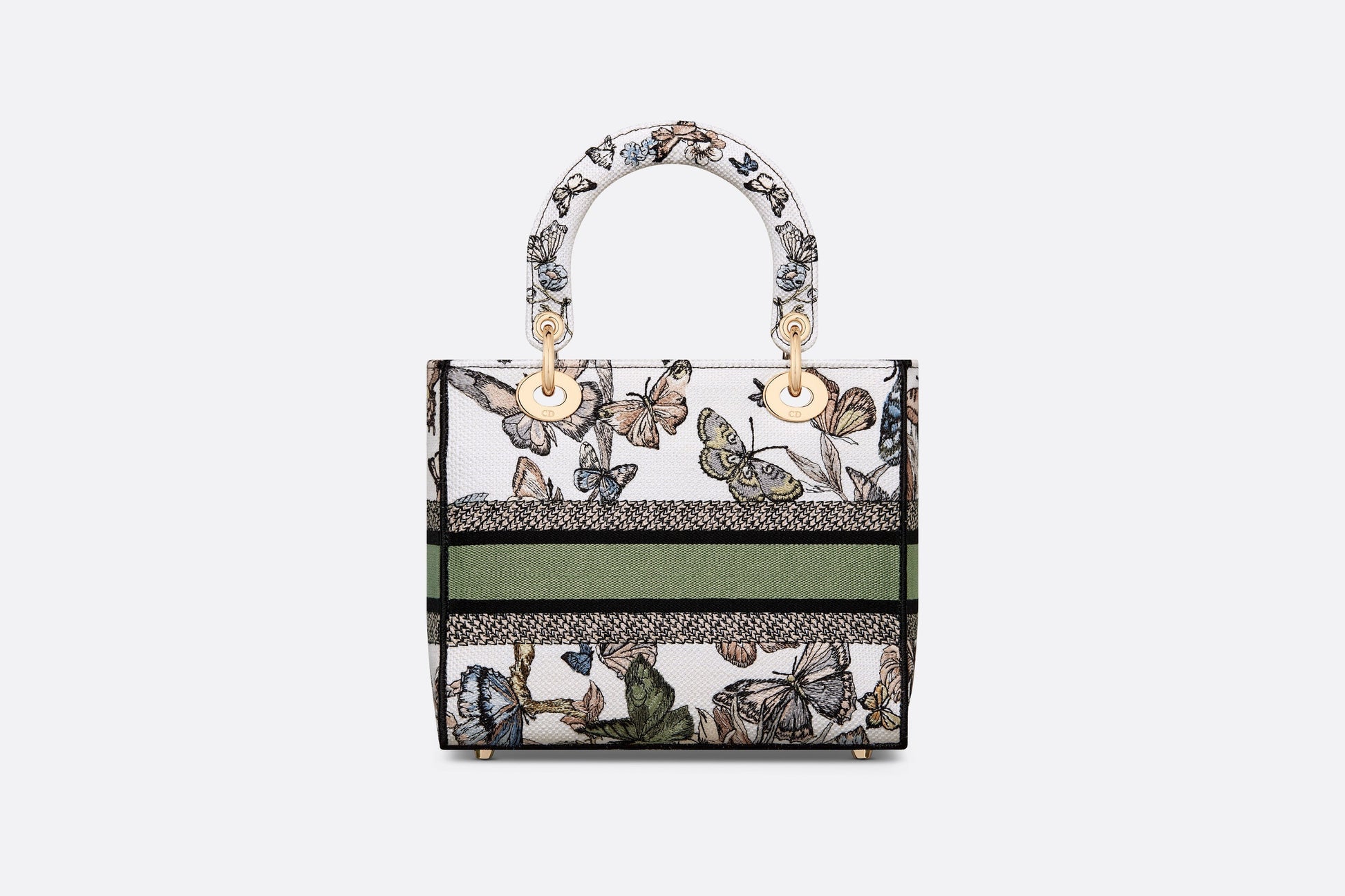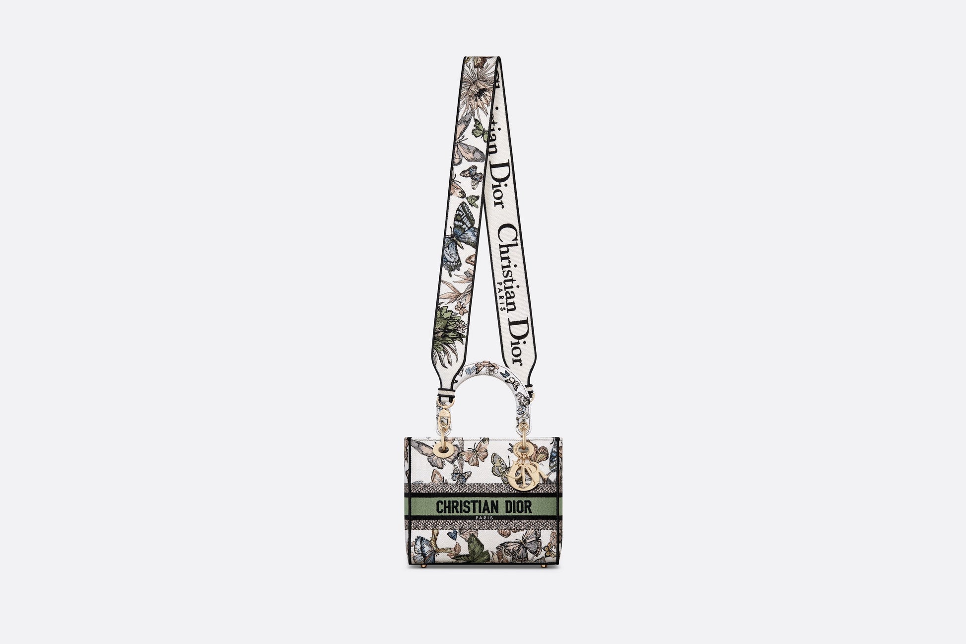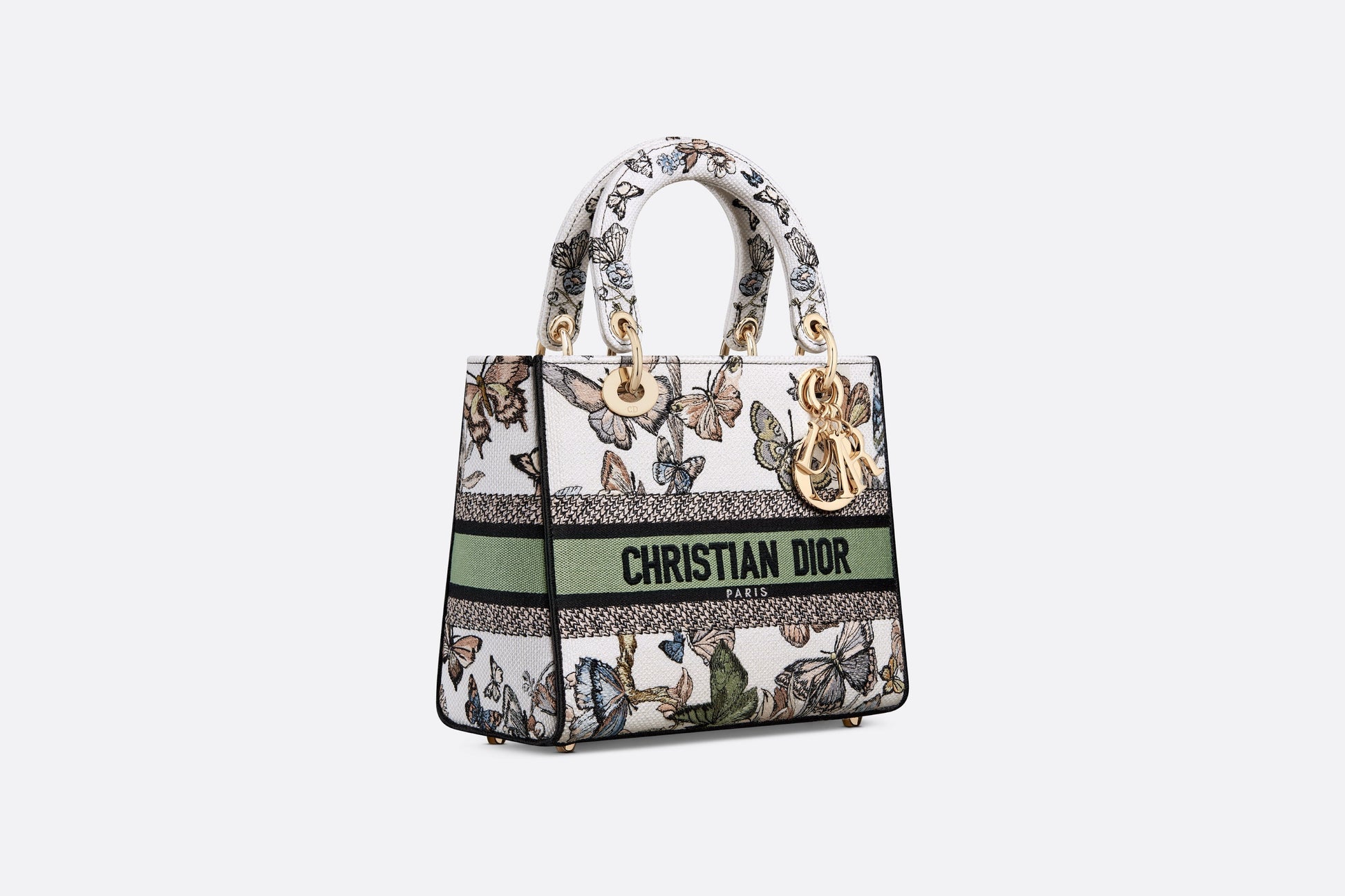 The Lady D-Lite bag combines classic elegance with House modernity. The style is fully embroidered with a white multicolor Toile de Jouy Mexico motif by Pietro Ruffo, showcasing butterflies and traditional Mexican flowers in a concert of colors. A Christian Dior Paris signature adorns the front, while D.I.O.R. charms in pale gold-finish metal enhance and highlight the silhouette. Featuring a wide, removable embroidered shoulder strap, the medium Lady D-Lite bag can be carried by hand or worn crossbody.
