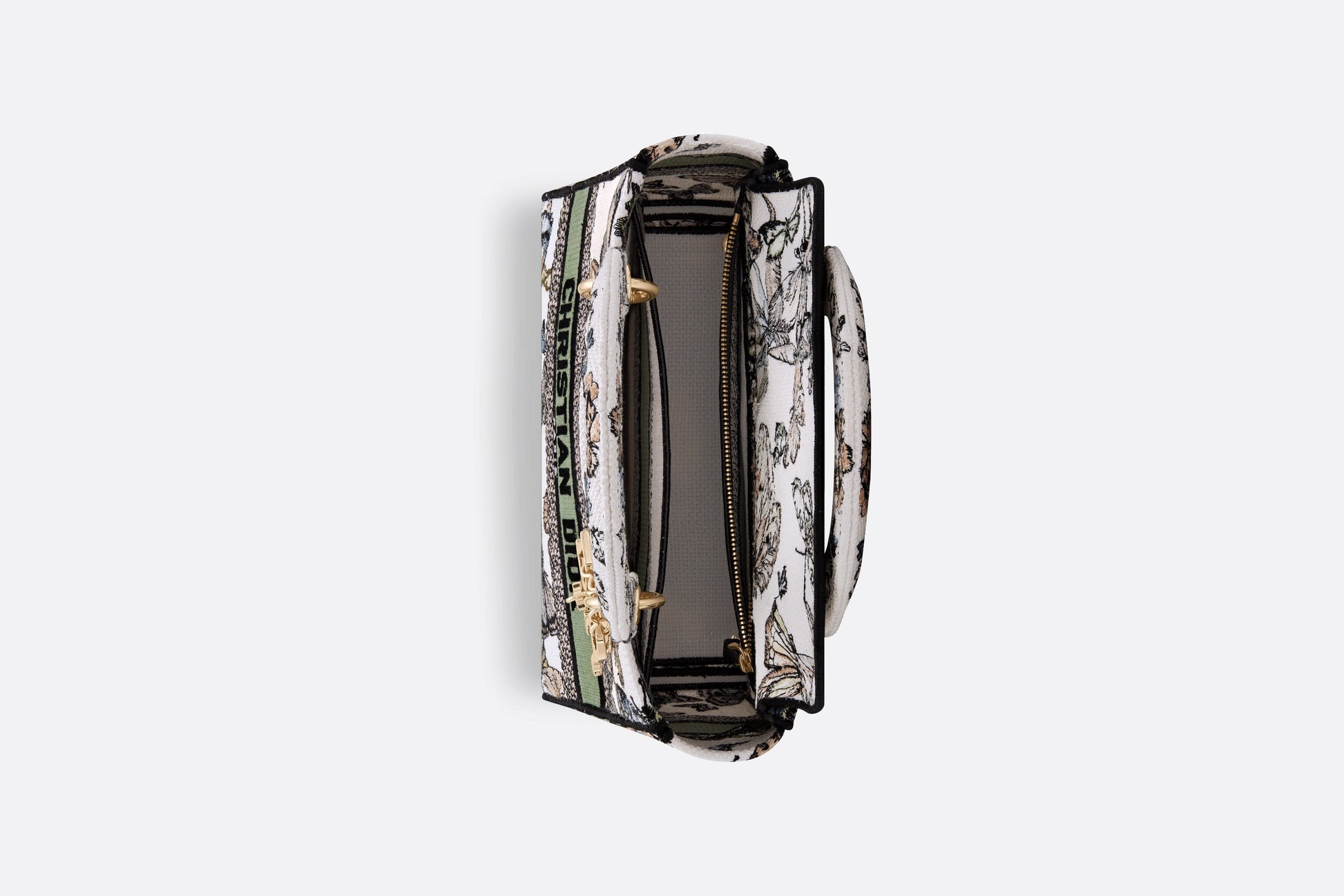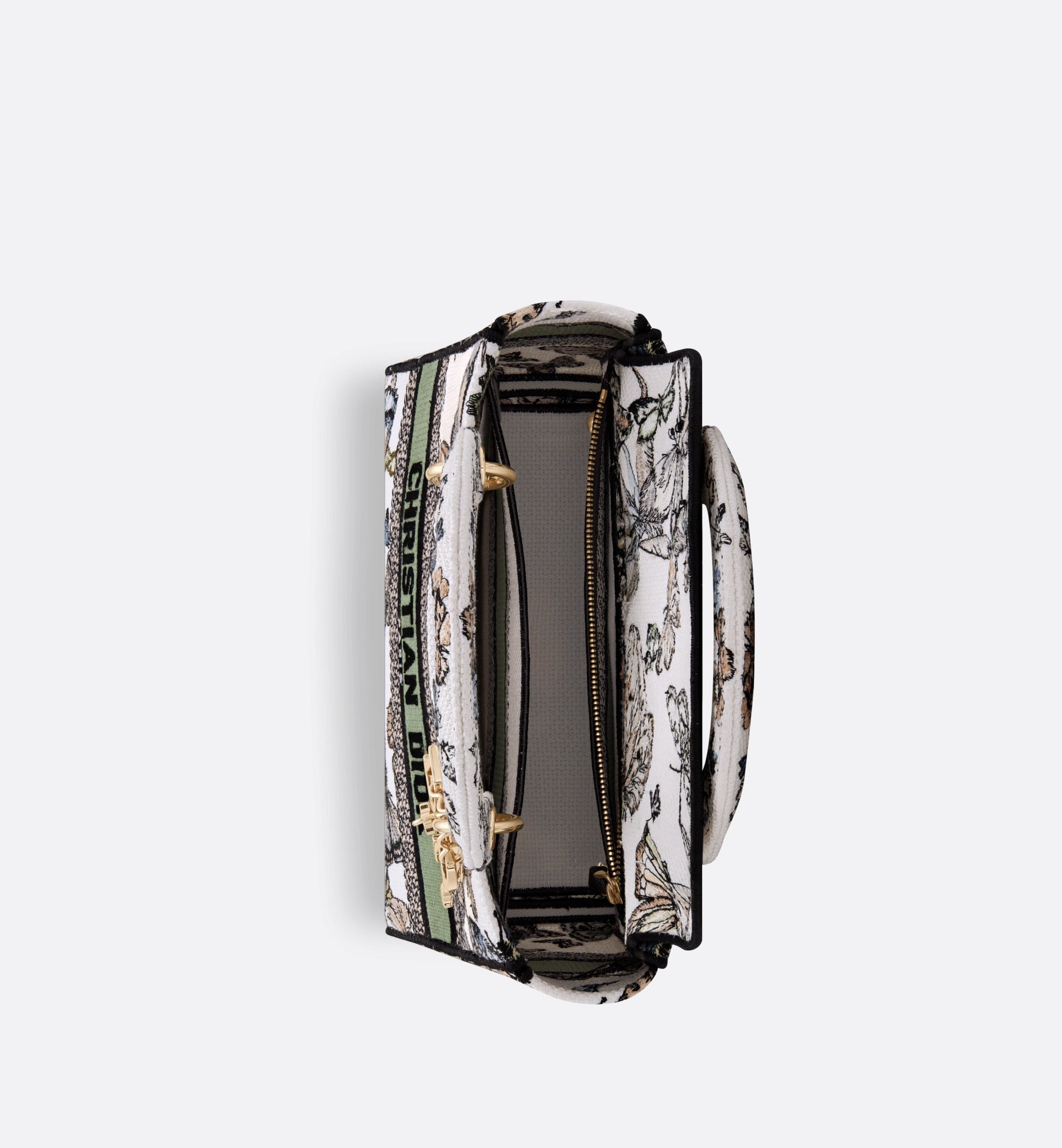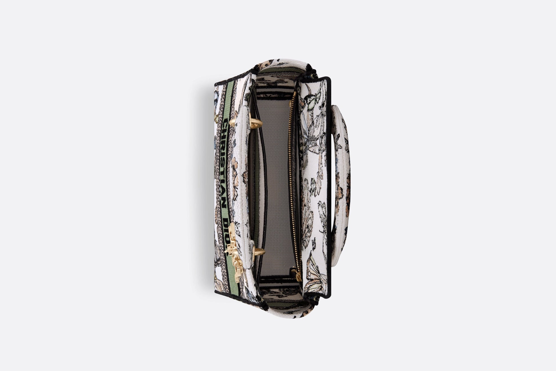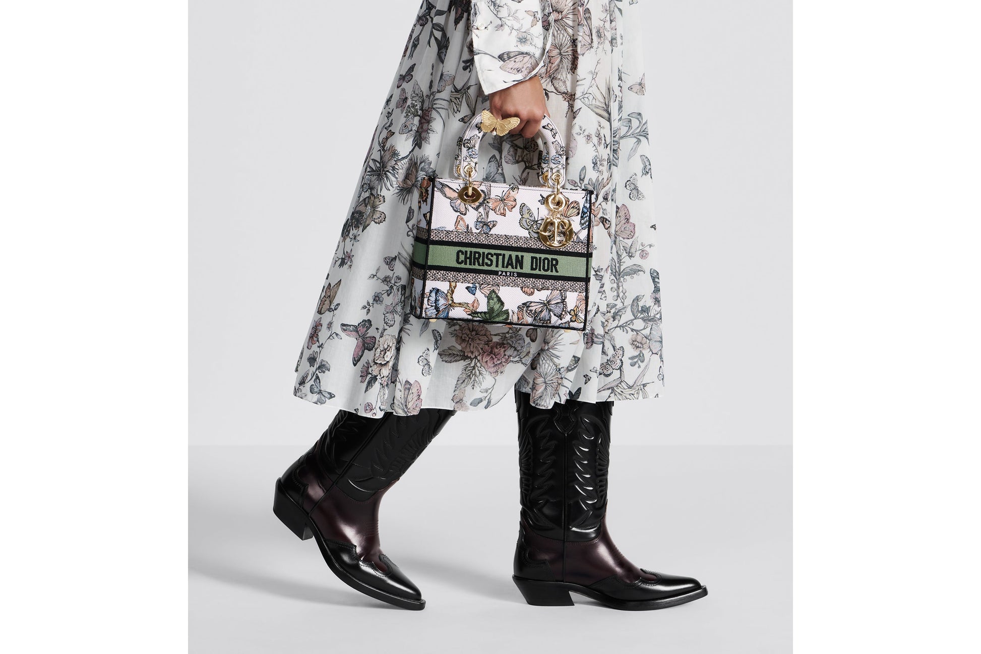 The Lady D-Lite bag combines classic elegance with House modernity. The style is fully embroidered with a white multicolor Toile de Jouy Mexico motif by Pietro Ruffo, showcasing butterflies and traditional Mexican flowers in a concert of colors. A Christian Dior Paris signature adorns the front, while D.I.O.R. charms in pale gold-finish metal enhance and highlight the silhouette. Featuring a wide, removable embroidered shoulder strap, the medium Lady D-Lite bag can be carried by hand or worn crossbody.