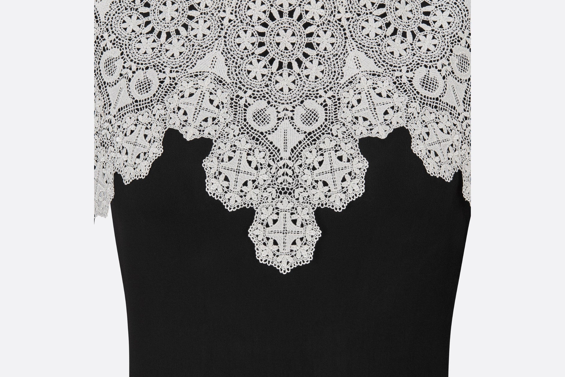 Revealed at the Cruise 2024 fashion show, the mid-length dress elegantly conveys the collection's signature theme of Frida Kahlo's silhouette. Crafted in black technical jersey, it is distinguished by its flared cut enhanced by pleats and a plastron in white lace. True to the spirit of the show, the long-sleeved dress can pair with leather boots for a hallmark look.