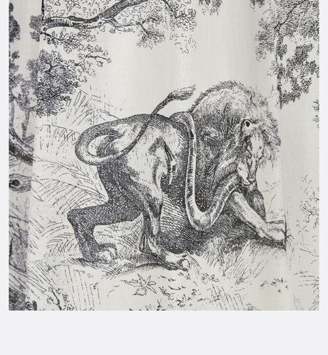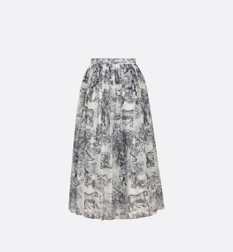 The mid-length skirt showcases the iconic Toile de Jouy motif on a hallmark Dior silhouette. Crafted in white and navy blue cotton muslin, it has a flared cut and thin band highlighting the waist. The skirt can be combined with the matching blouse to complete the look.