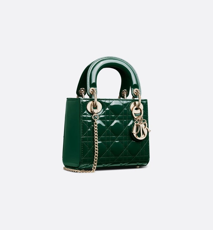The Lady Dior handbag epitomizes the House's vision of elegance and beauty. Sleek and refined, the timeless yet relevant style is crafted in pine green patent calfskin with Cannage stitching, creating the instantly recognizable quilted texture. The pale gold-finish metal signature 'D.I.O.R.' charms embellish and illuminate its silhouette. Featuring a removable chain shoulder strap, the miniature Lady Dior bag can be carried by hand, worn over the shoulder or crossbody as an ideal evening companion.