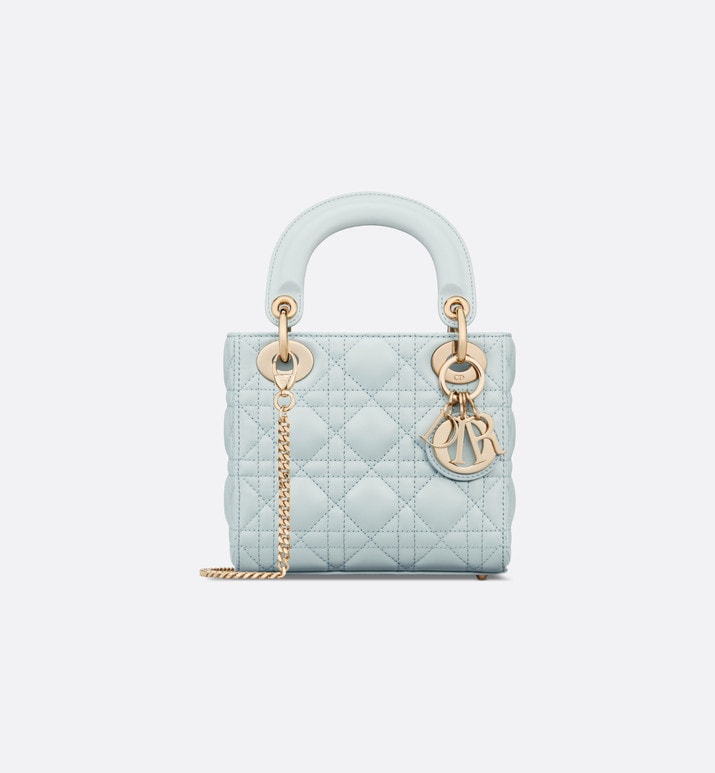 The Lady Dior bag epitomizes the House's vision of elegance and beauty. Sleek and refined, the style is timeless. It is crafted in placid blue lambskin with Cannage stitching, creating the instantly recognizable quilted texture. The pale gold-finish metal D.I.O.R. charms embellish and illuminate its silhouette. Featuring a removable chain shoulder strap, the miniature Lady Dior bag can be carried by hand or worn crossbody as an ideal evening wear companion.
