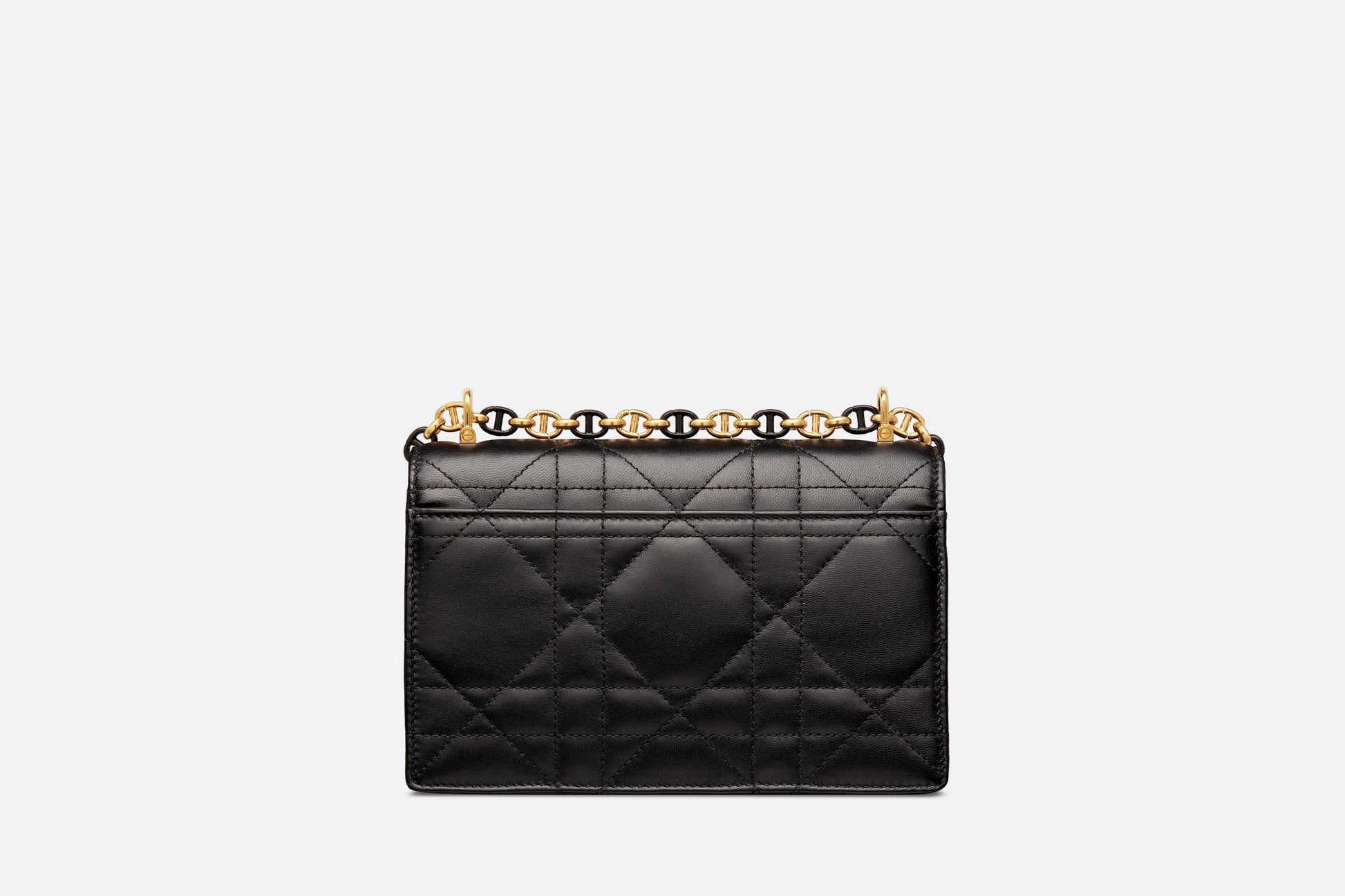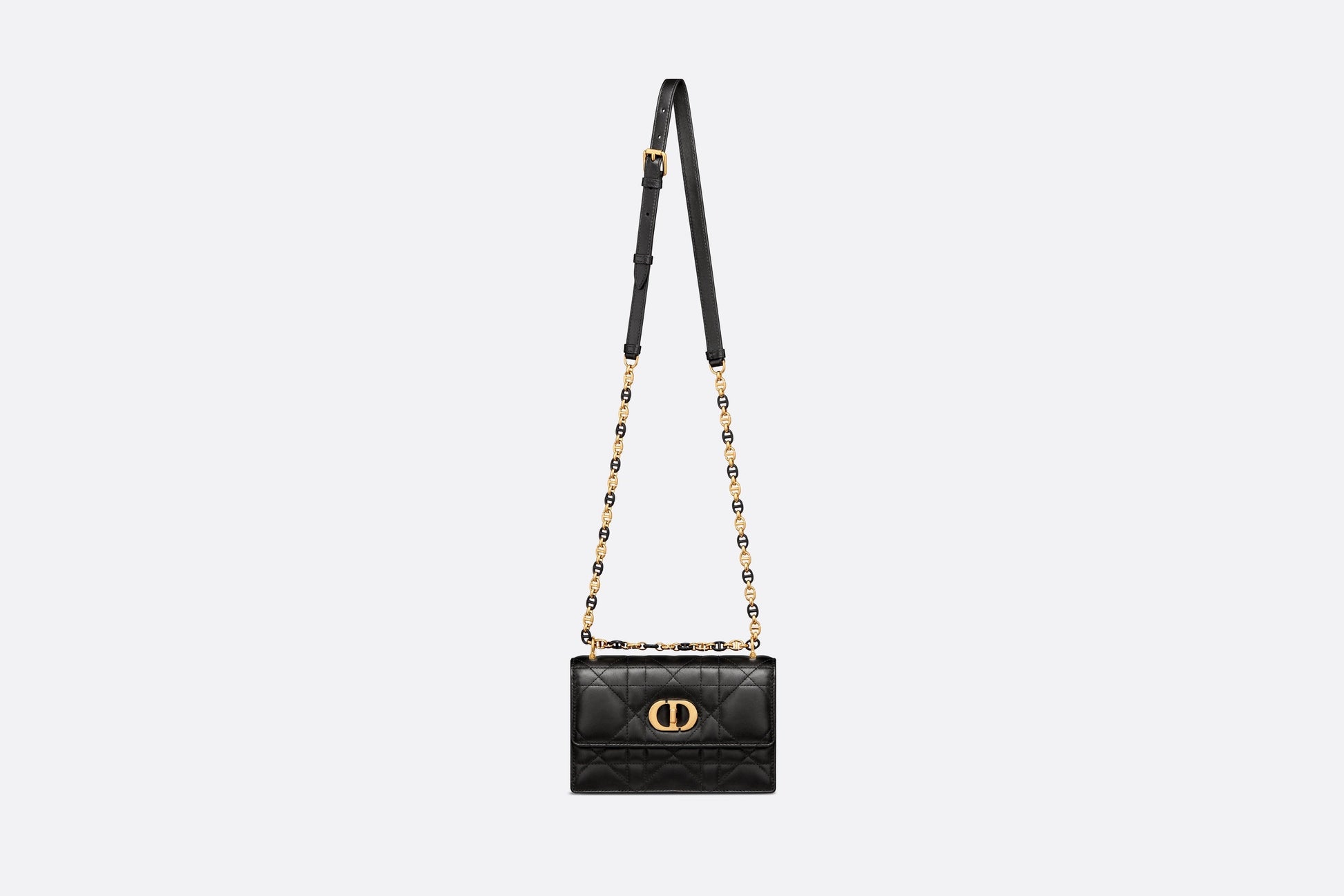 The new Fall 2023 Miss Caro bag enhances the Dior Caro line with modern and timeless elegance. Crafted in black lambskin, it stands out with the unique quilted effect of Macrocannage stitching, as well as a flap accented by a gold-finish metal CD twist clasp inspired by the seal of a Christian Dior perfume bottle. Alternating between gold-finish metal links and tonal enamel links that match the leather, the removable chain shoulder strap has a leather insert for added comfort when carrying the miniature bag by hand or wearing it crossbody.