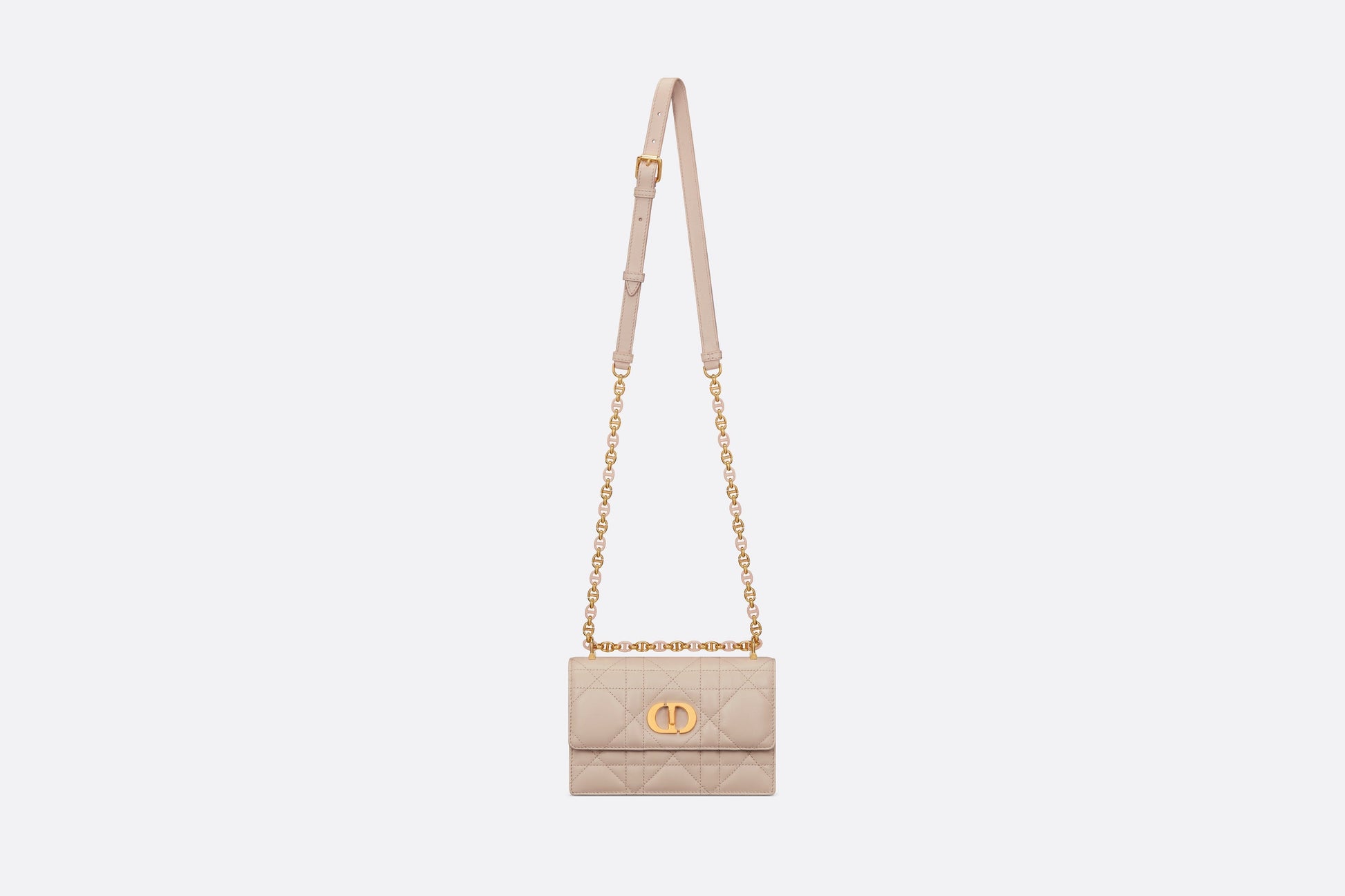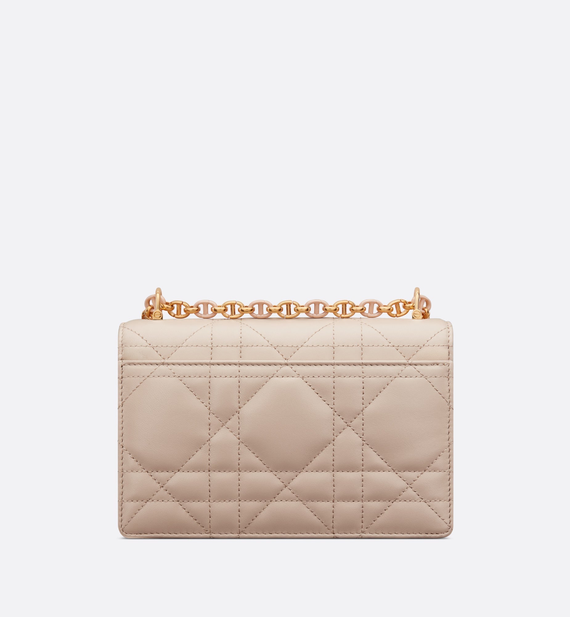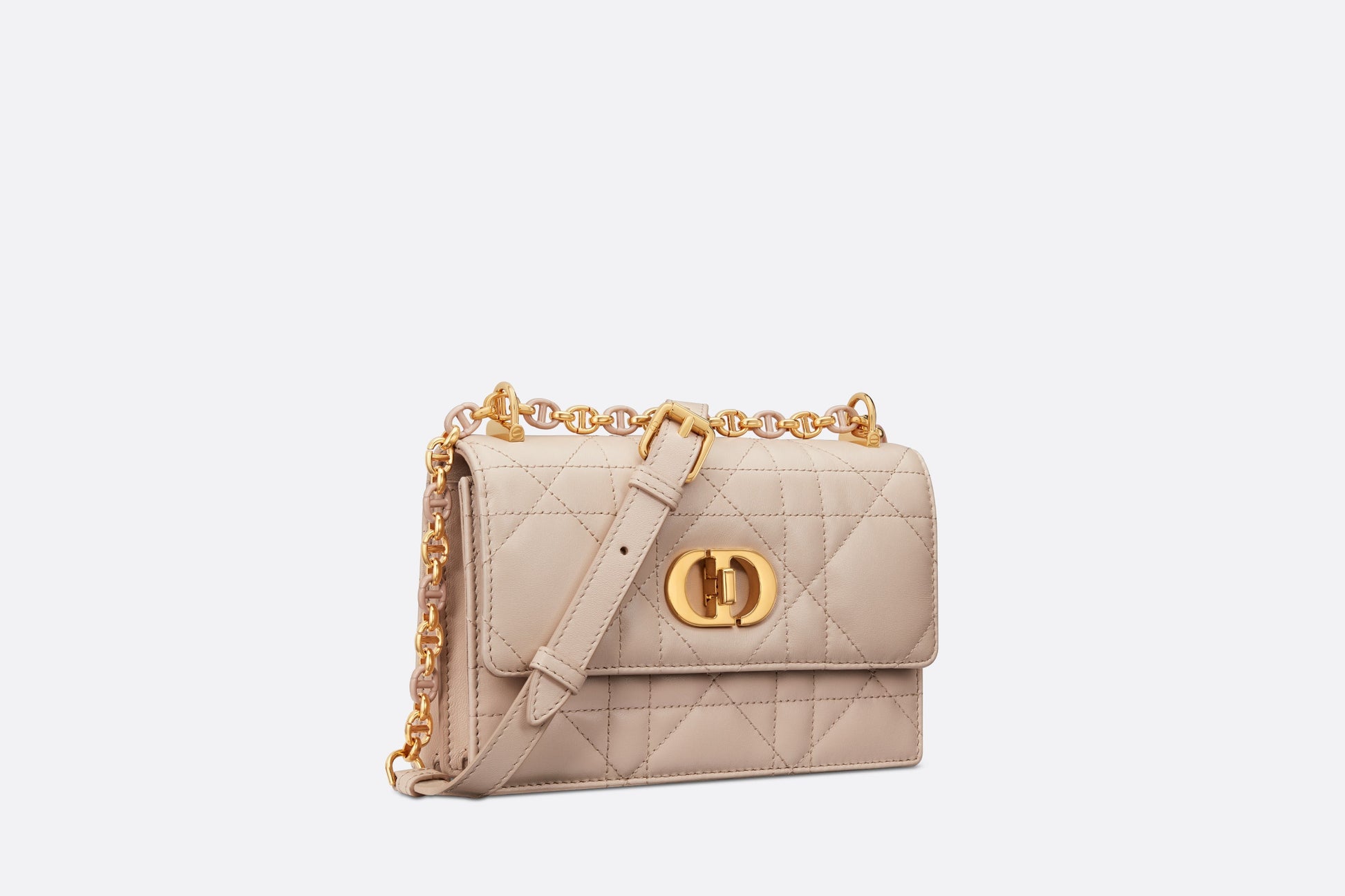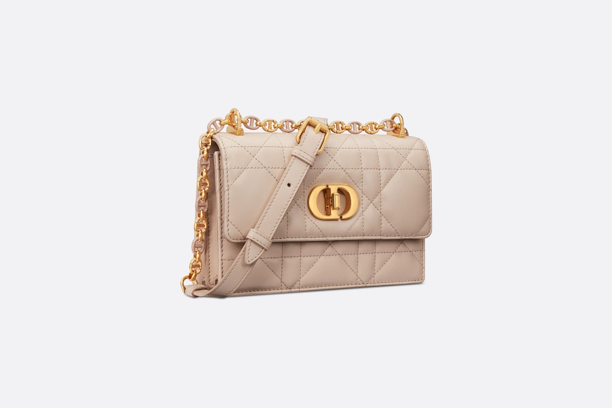 The new Fall 2023 Miss Caro bag enhances the Dior Caro line with modern and timeless elegance. Crafted in caramel beige lambskin, it stands out with the unique quilted effect of Macrocannage stitching, as well as a flap accented by a gold-finish metal CD twist clasp inspired by the seal of a Christian Dior perfume bottle. Alternating between gold-finish metal links and tonal enamel links that match the leather, the removable chain shoulder strap has a leather insert for added comfort when carrying the miniature bag by hand or wearing it crossbody.