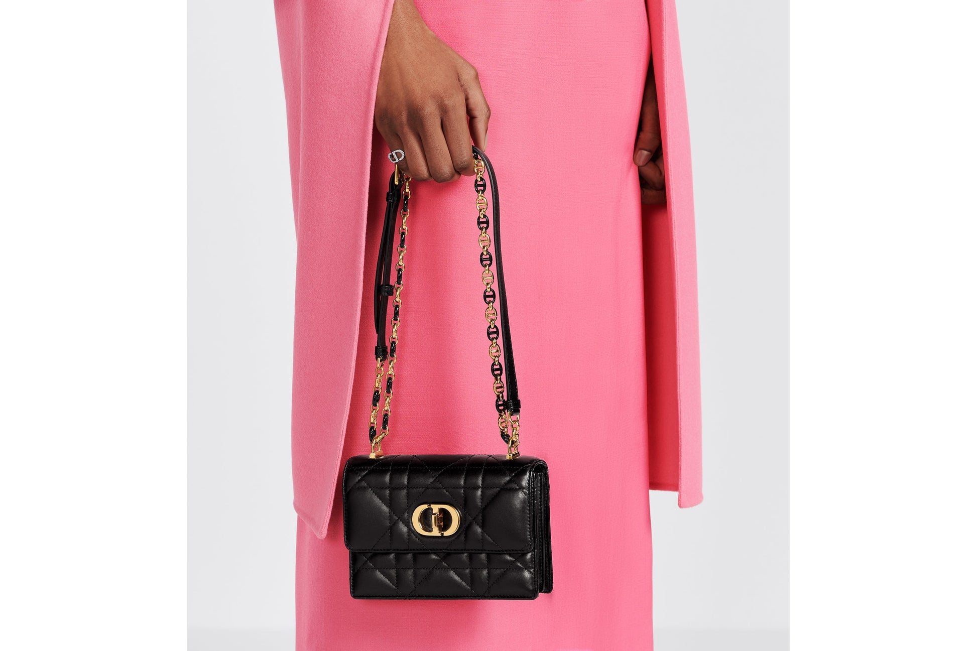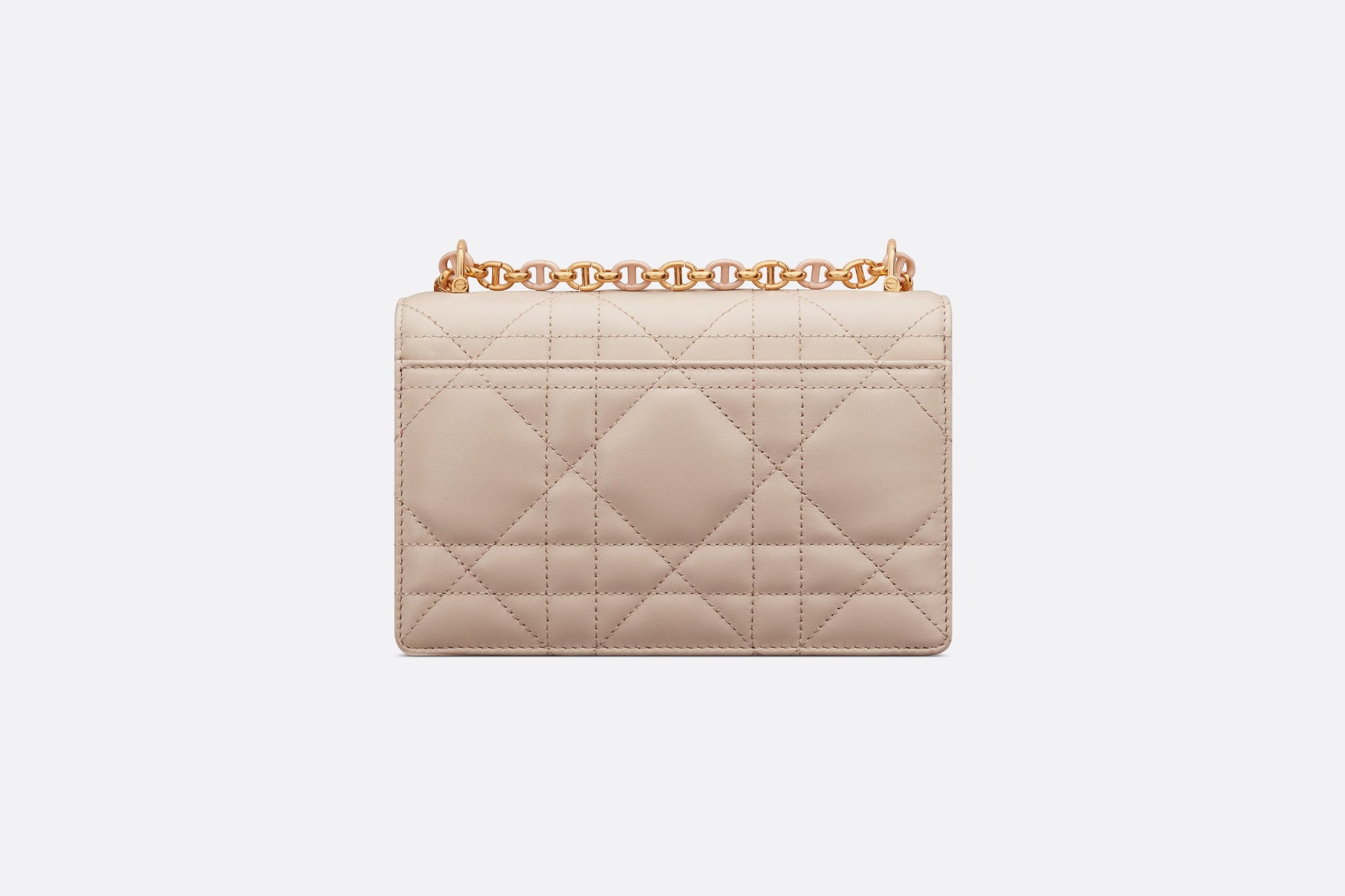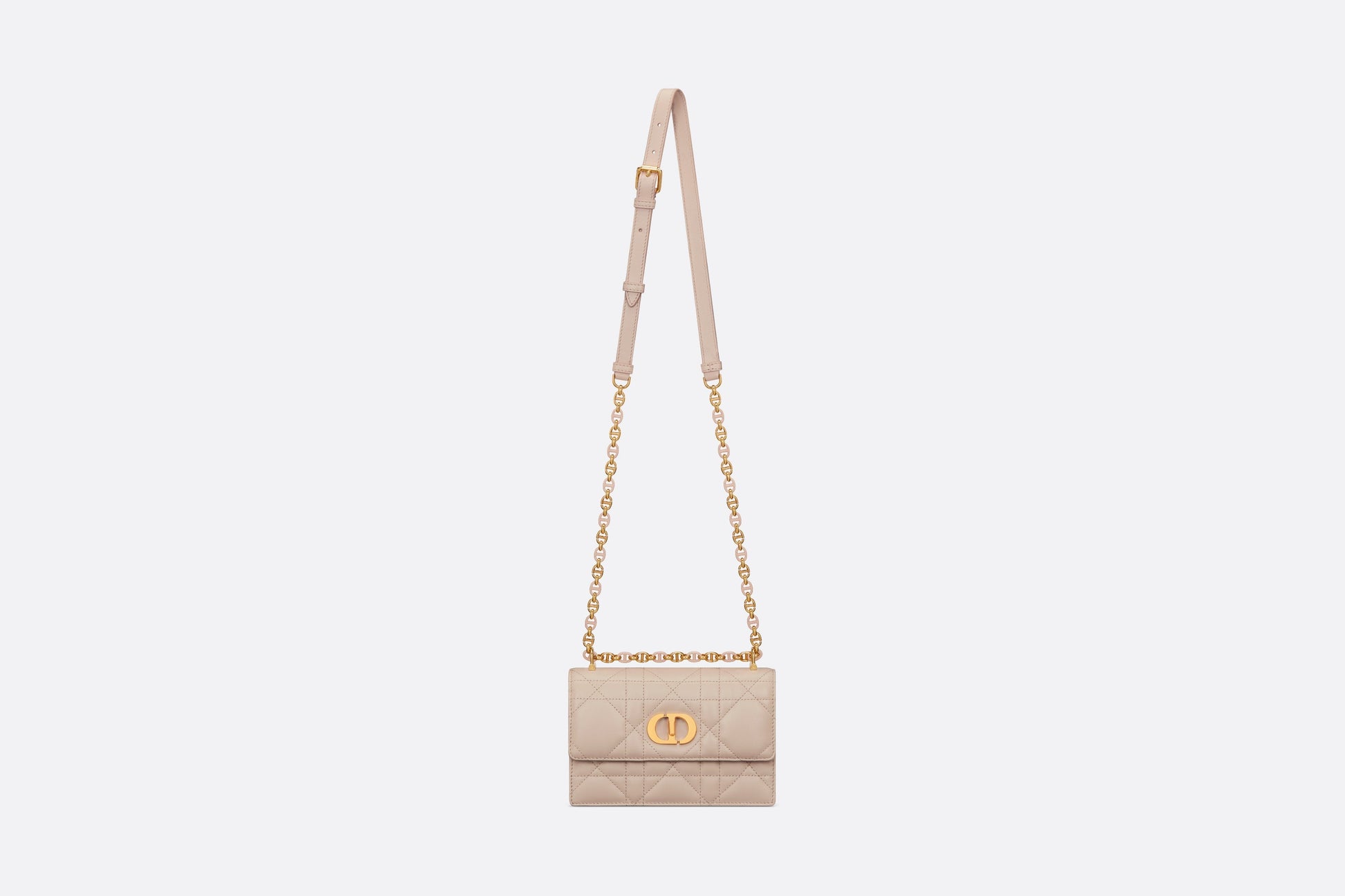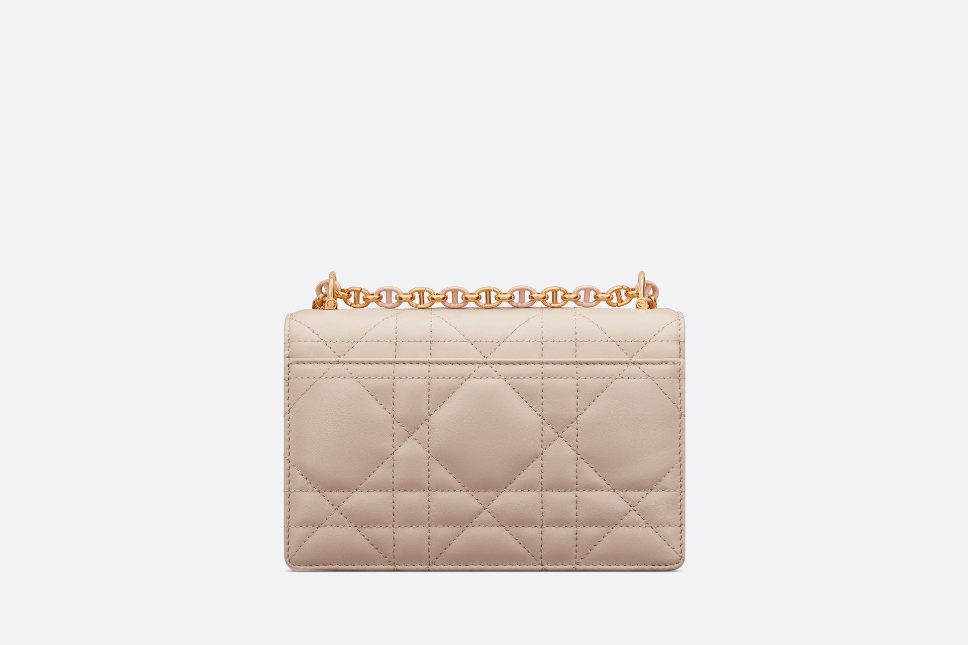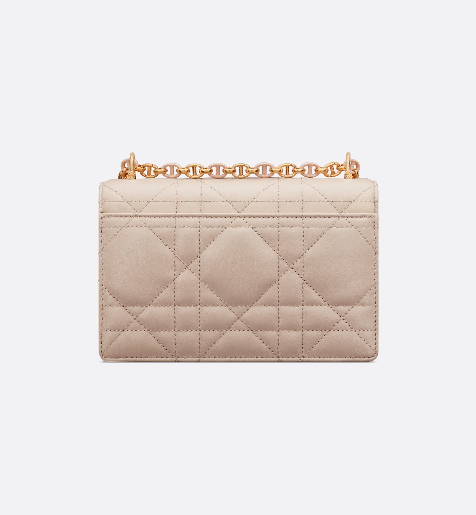 The new Fall 2023 Miss Caro bag enhances the Dior Caro line with modern and timeless elegance. Crafted in caramel beige lambskin, it stands out with the unique quilted effect of Macrocannage stitching, as well as a flap accented by a gold-finish metal CD twist clasp inspired by the seal of a Christian Dior perfume bottle. Alternating between gold-finish metal links and tonal enamel links that match the leather, the removable chain shoulder strap has a leather insert for added comfort when carrying the miniature bag by hand or wearing it crossbody.