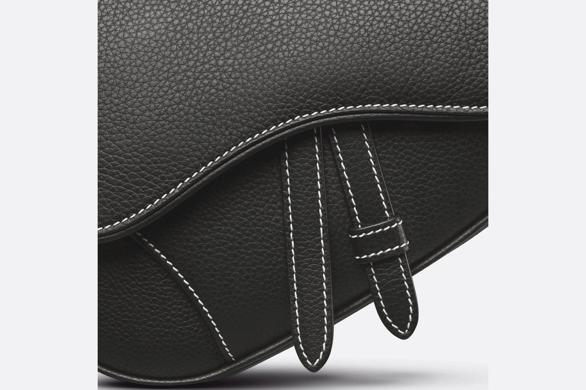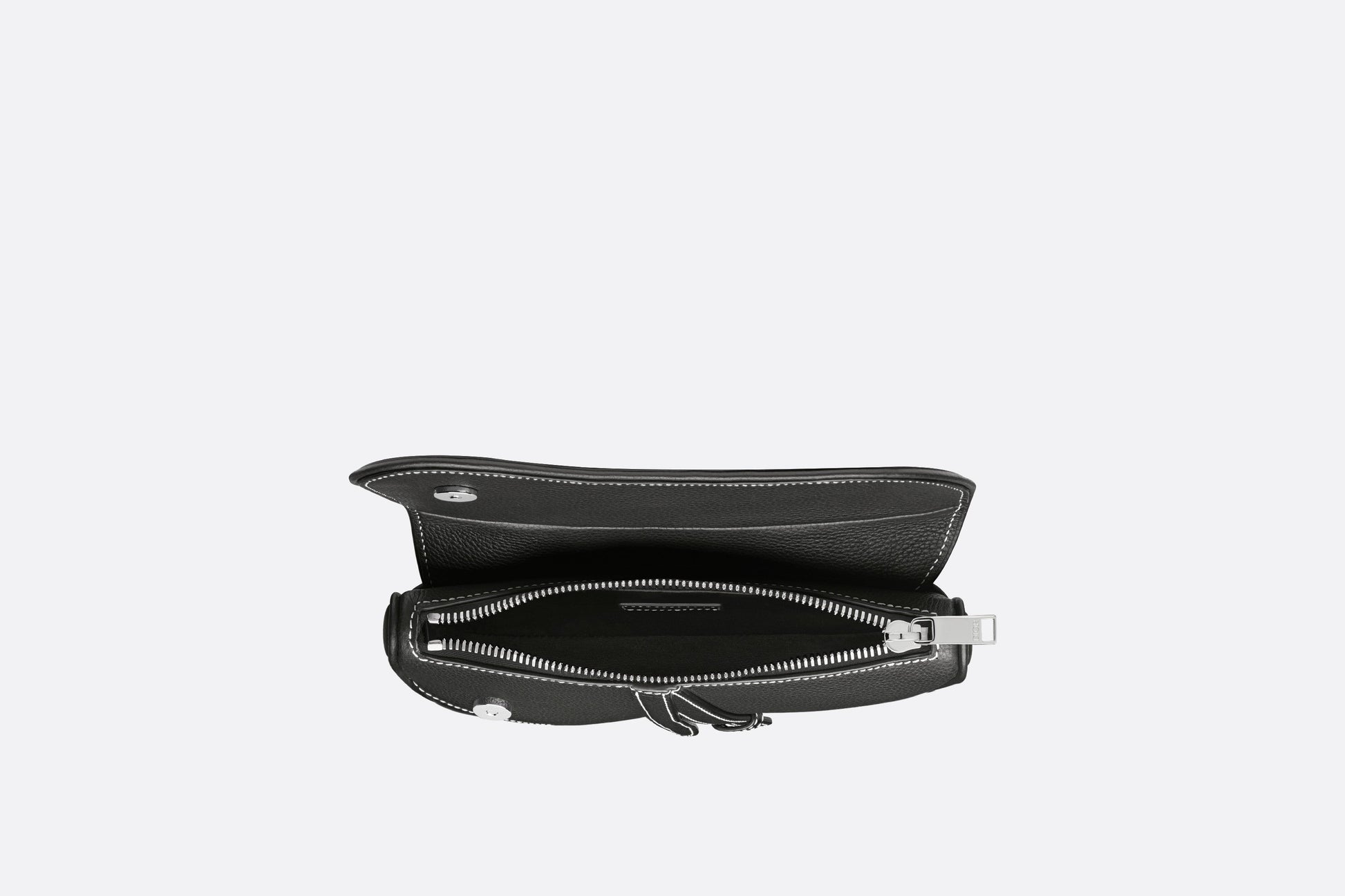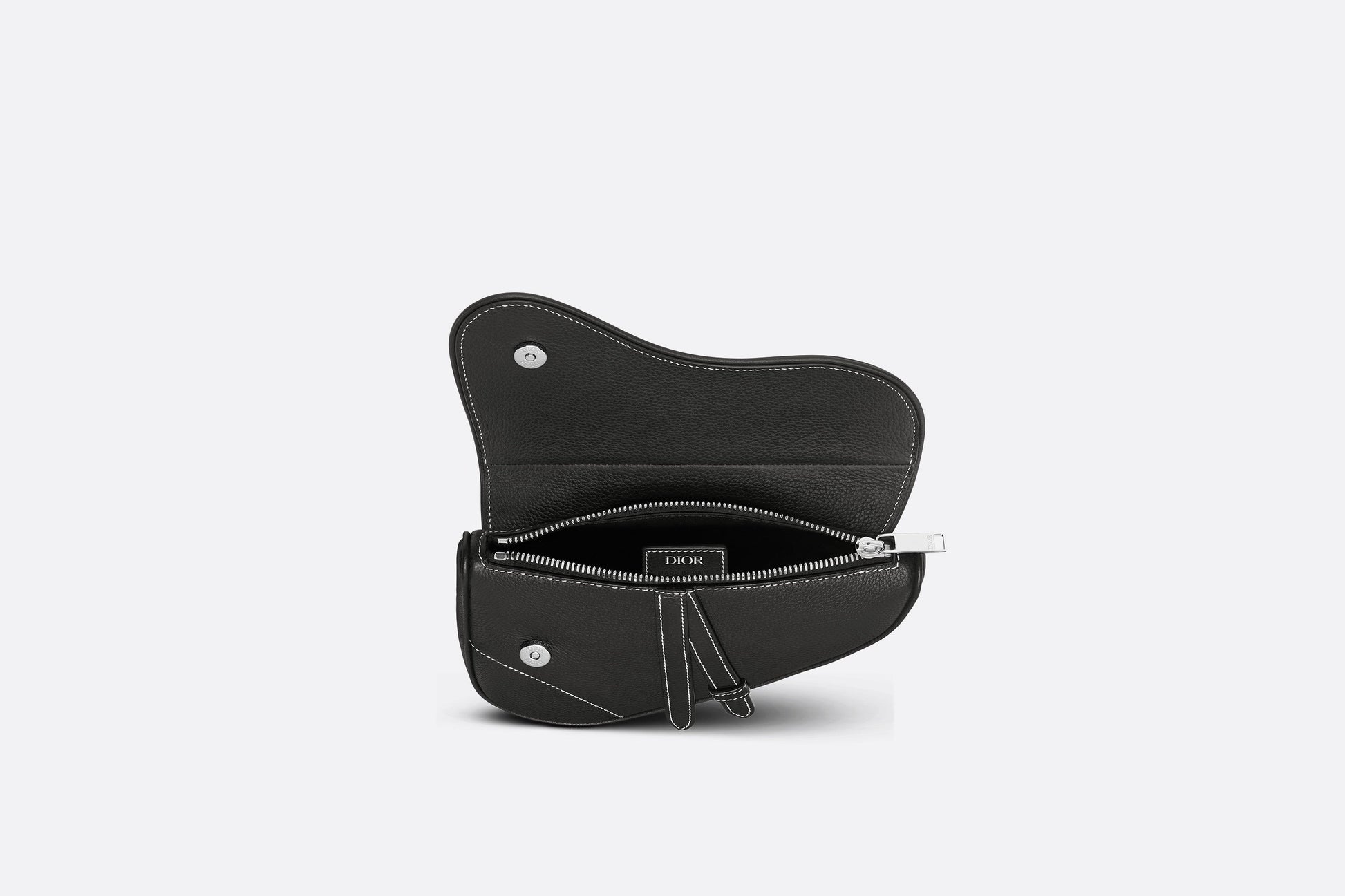 The Saddle bag is offered in a practical variation. Crafted in black grained calfskin with contrasting white topstitching, it is embellished with a magnetic flap that boasts hallmark Saddle lines and conceals a zipped closure. The miniature bag is further enhanced by leather finishing details and has an adjustable 'CHRISTIAN DIOR' jacquard strap, allowing it to be worn over the shoulder or crossbody.