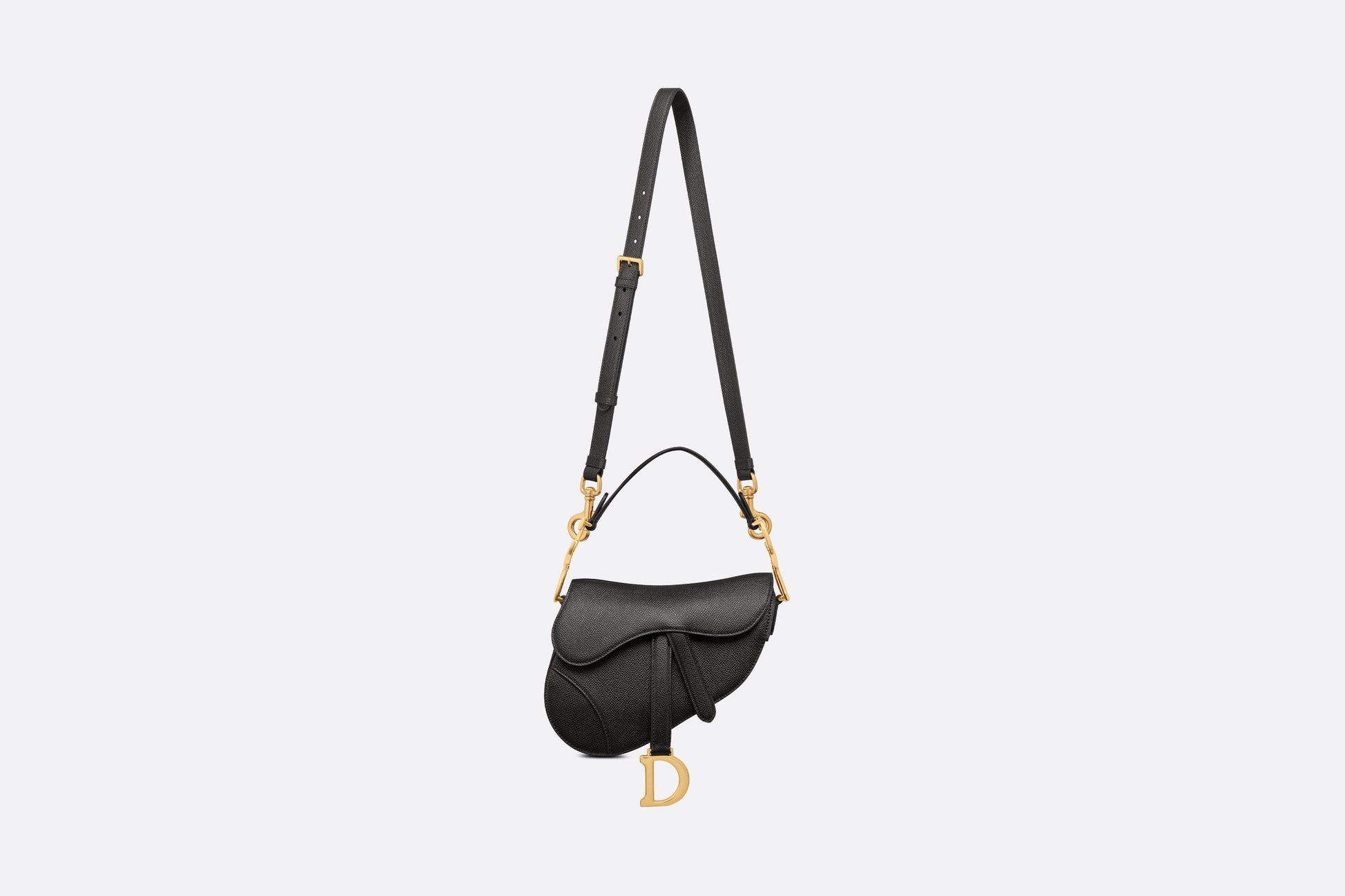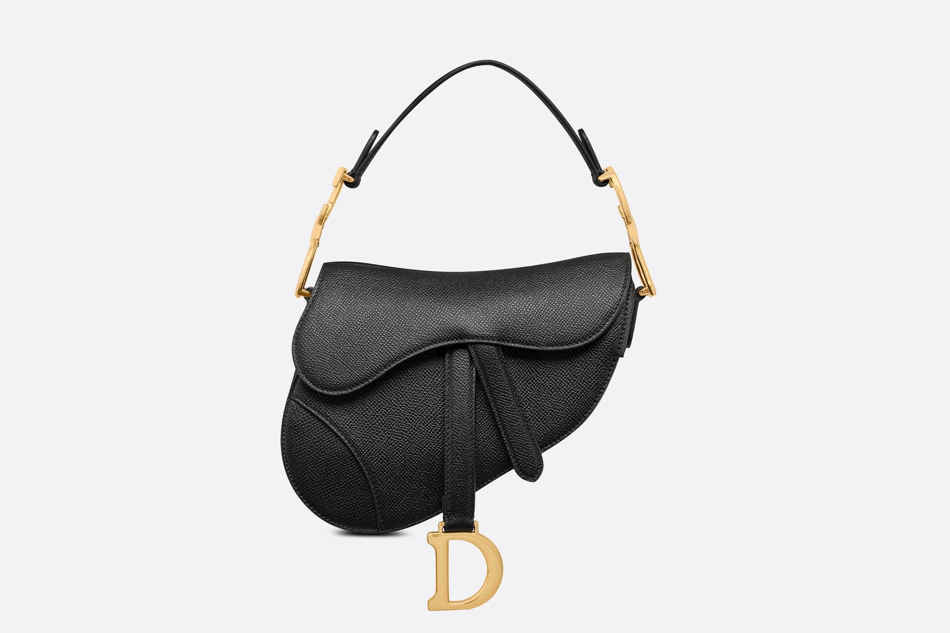 Maria Grazia Chiuri brings a fresh update to the iconic Saddle bag. Crafted in black grained calfskin, the legendary design features a Saddle flap with a magnetic 'D' stirrup clasp, as well as an antique gold-finish metal 'CD' signature on either side of the strap. Featuring a thin, adjustable and removable shoulder strap, the miniature Saddle bag may be carried by hand, worn over the shoulder or crossbody.