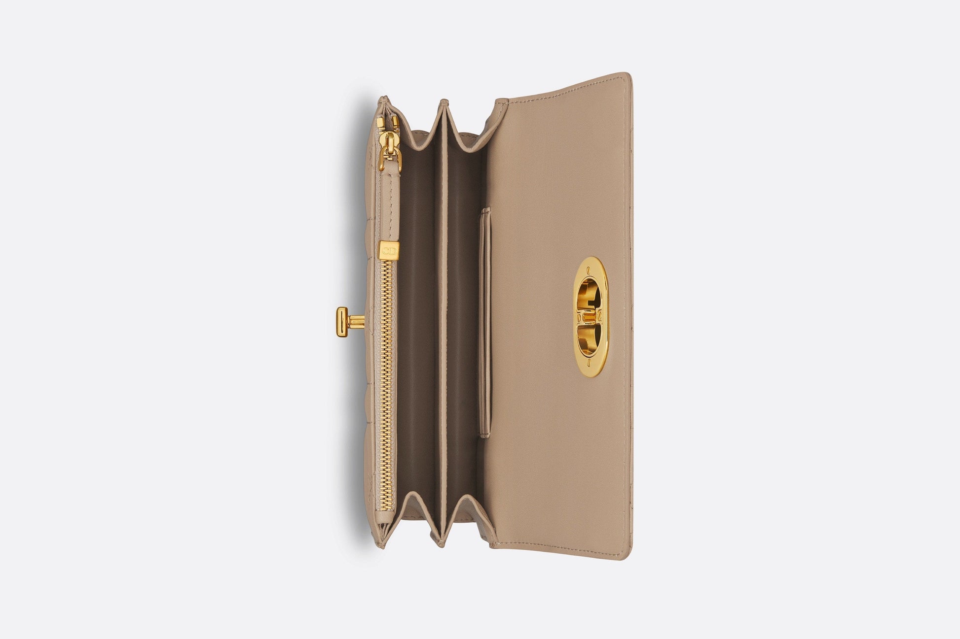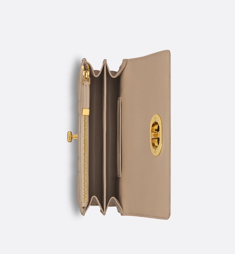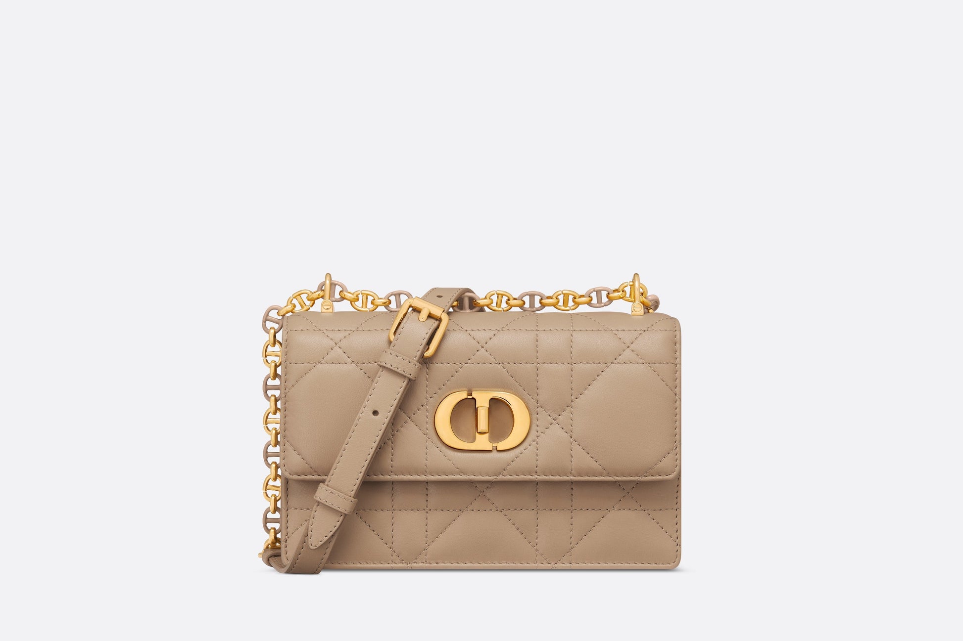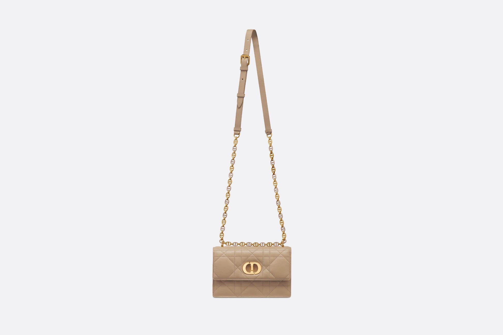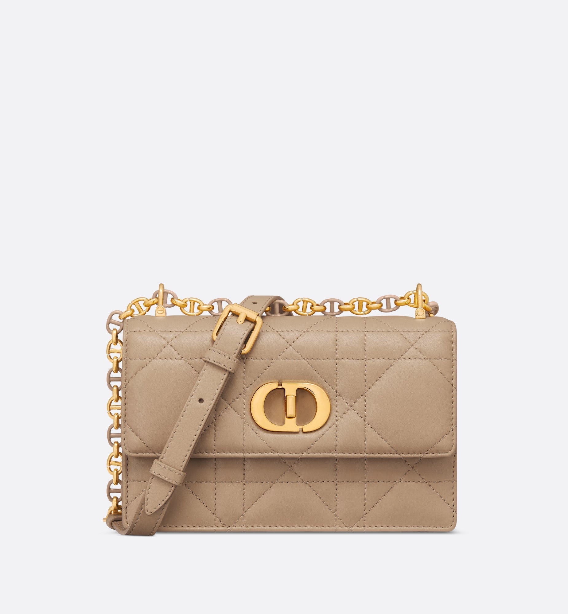The Miss Caro mini bag elevates the Dior Caro line with modern and timeless elegance. Crafted in biscuit lambskin, it stands out with the unique quilted effect of Macrocannage stitching, as well as a flap accented by a gold-finish metal CD twist clasp inspired by the seal of a Christian Dior perfume bottle. Alternating between gold-finish metal links and tonal enamel links that match the leather, the adjustable chain shoulder strap has a leather insert for added comfort when carrying the bag by hand, wearing it over the shoulder or crossbody.