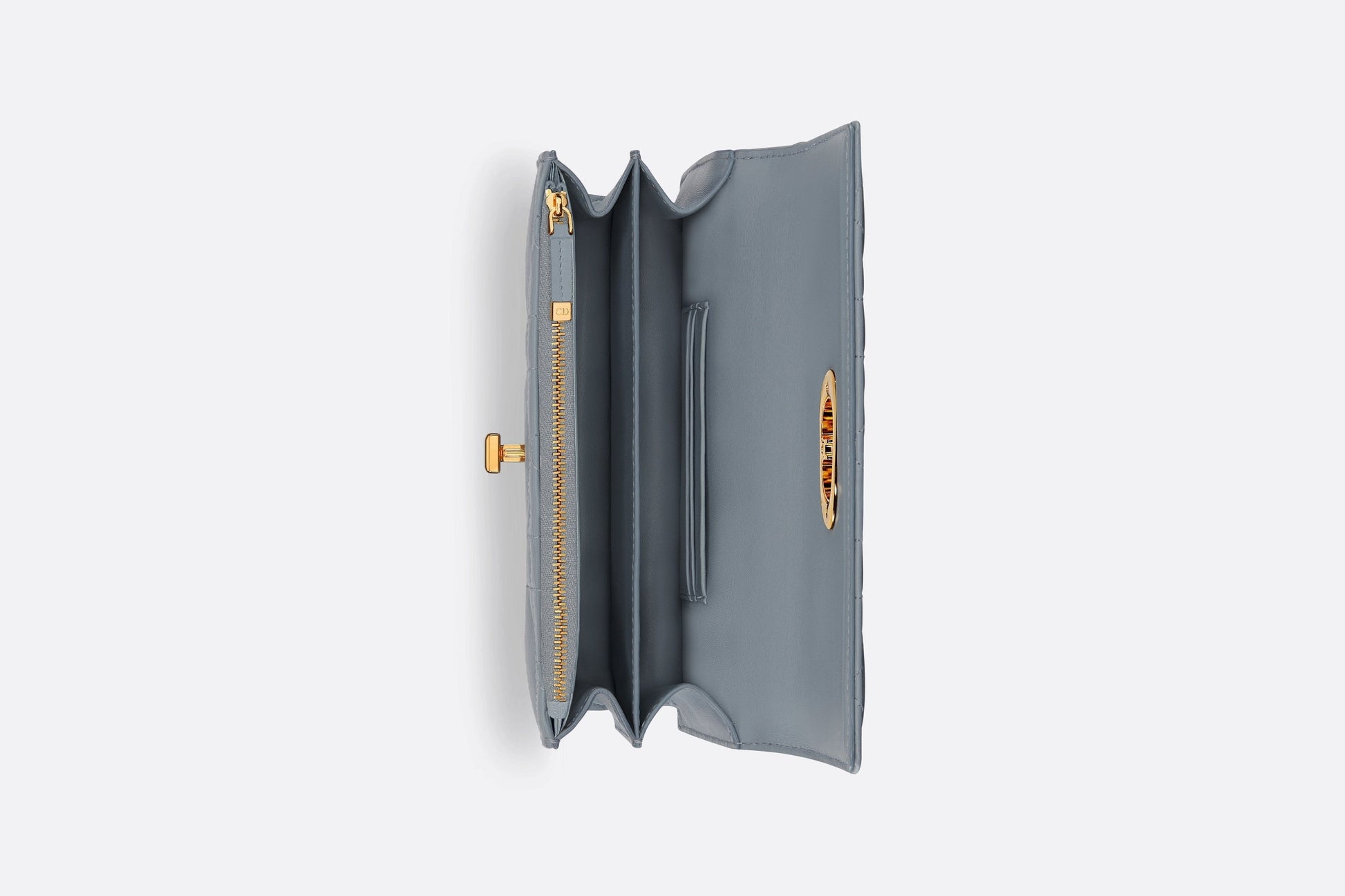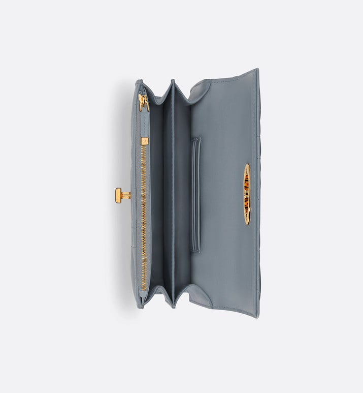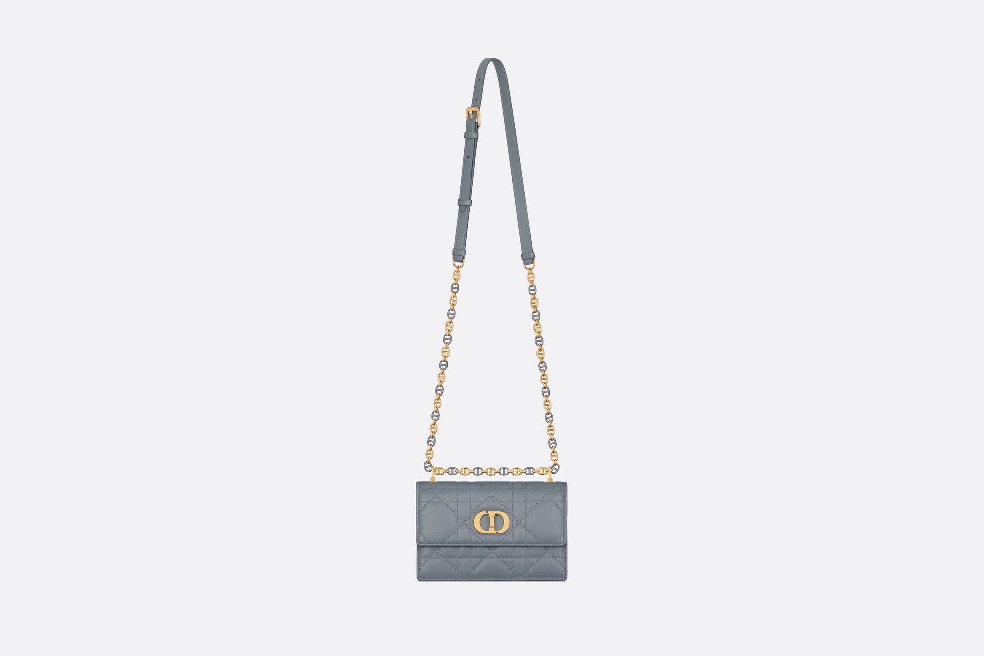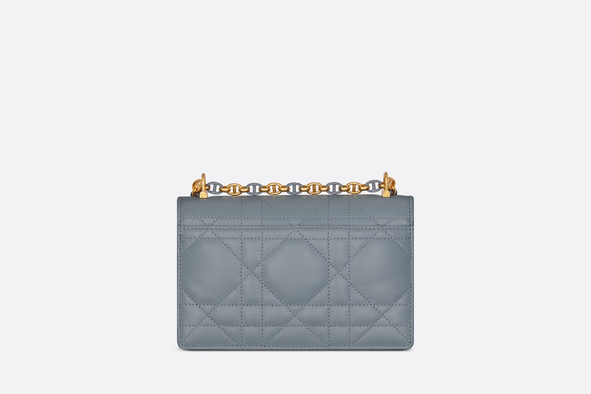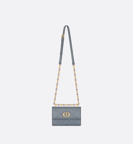 The Miss Caro mini bag enhances the Dior Caro line with modern and timeless elegance. Crafted in cloud blue lambskin, it stands out with the unique quilted effect of Macrocannage stitching, as well as a flap accented by a gold-finish metal CD twist clasp inspired by the seal of a Christian Dior perfume bottle. Alternating between gold-finish metal links and tonal enamel links that match the leather, the adjustable chain shoulder strap has a leather insert for added comfort when carrying the bag by hand, wearing it over the shoulder or crossbody.