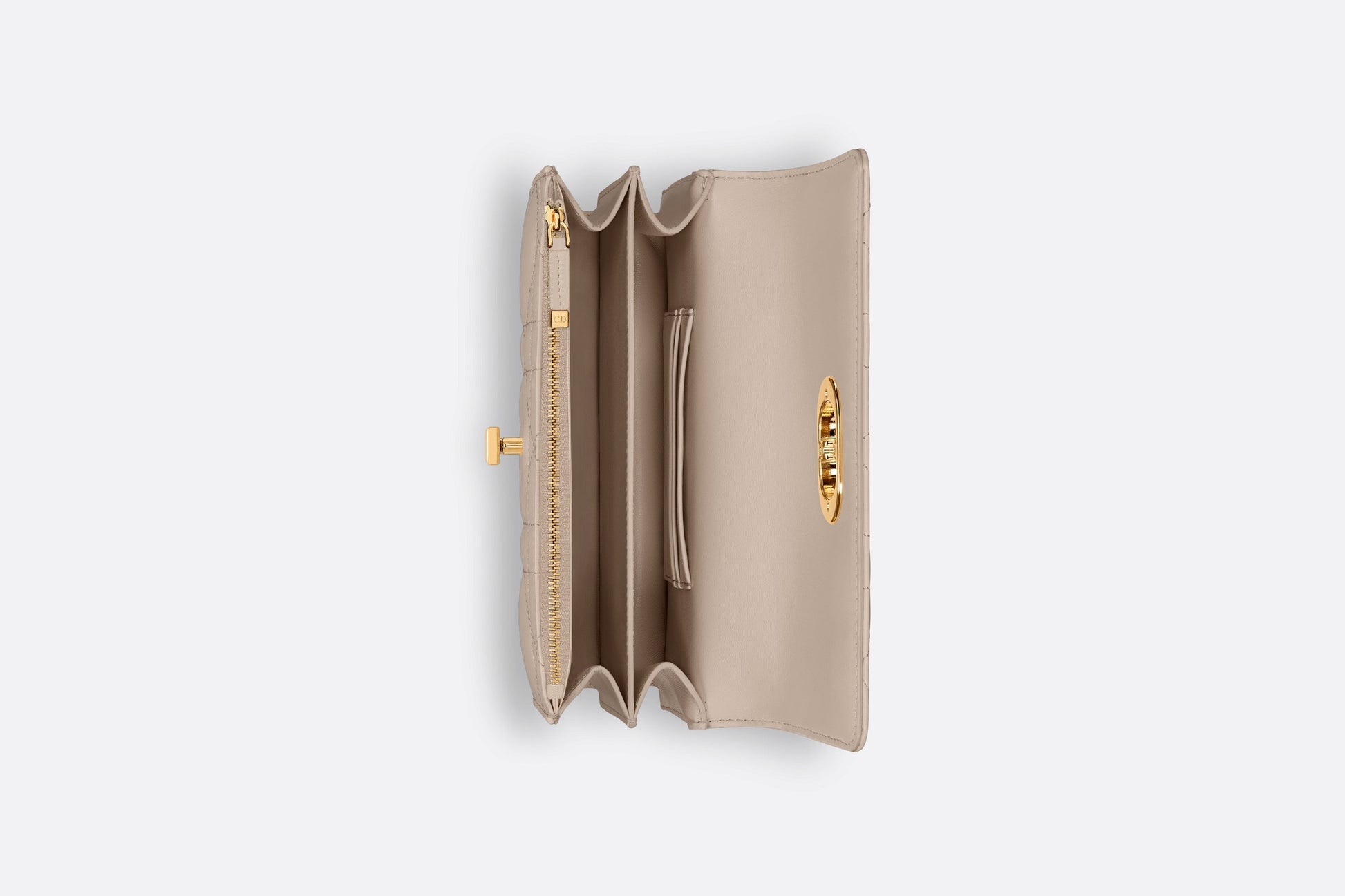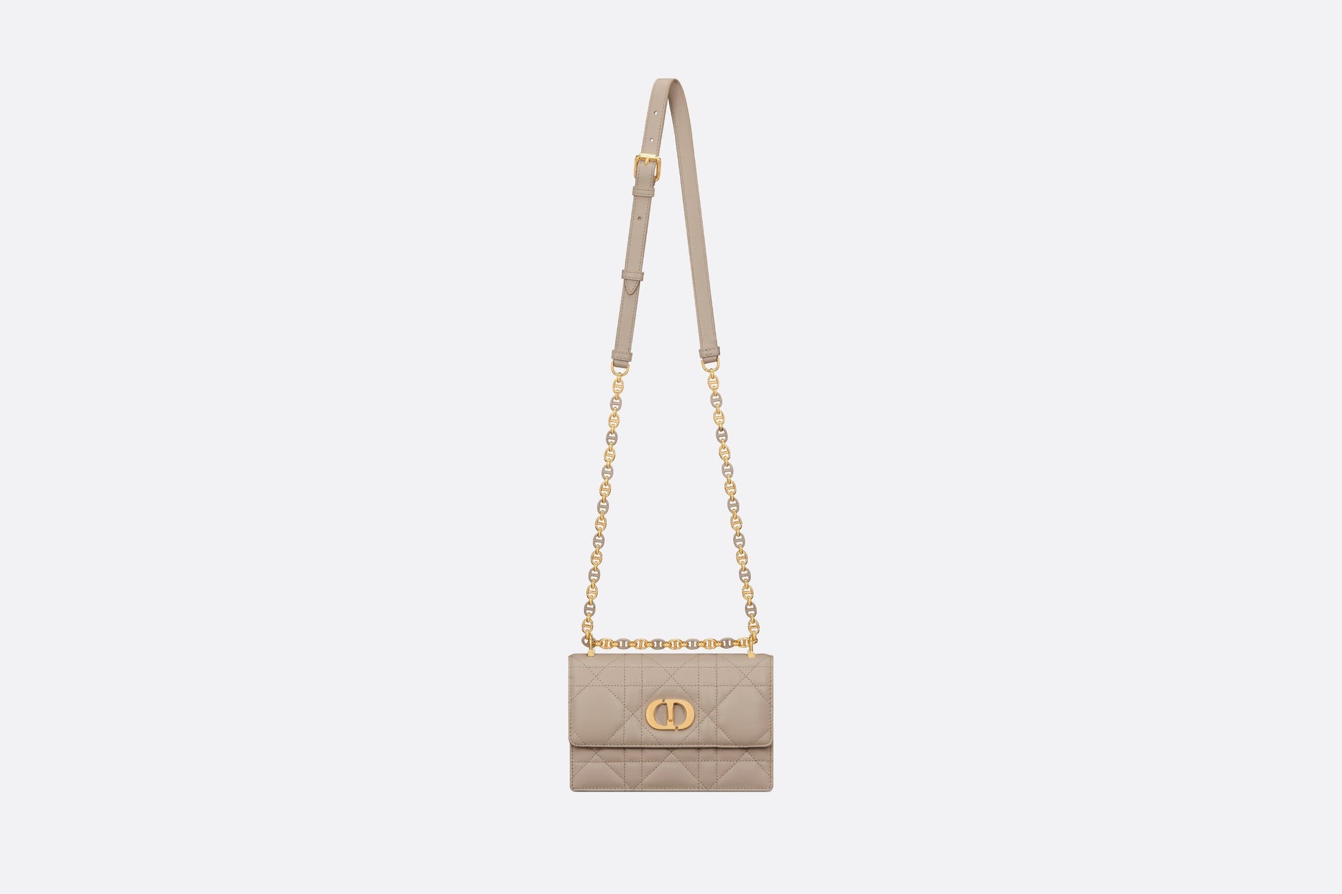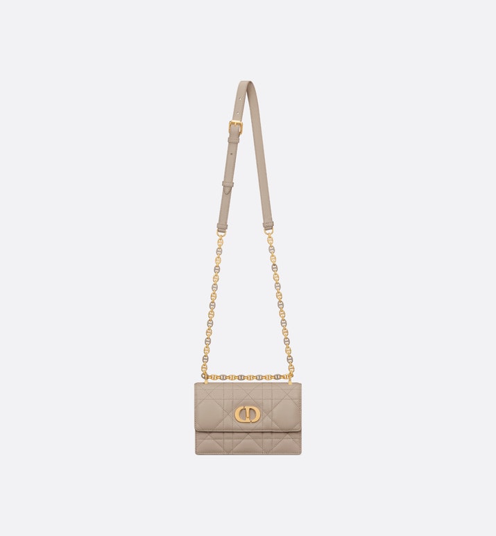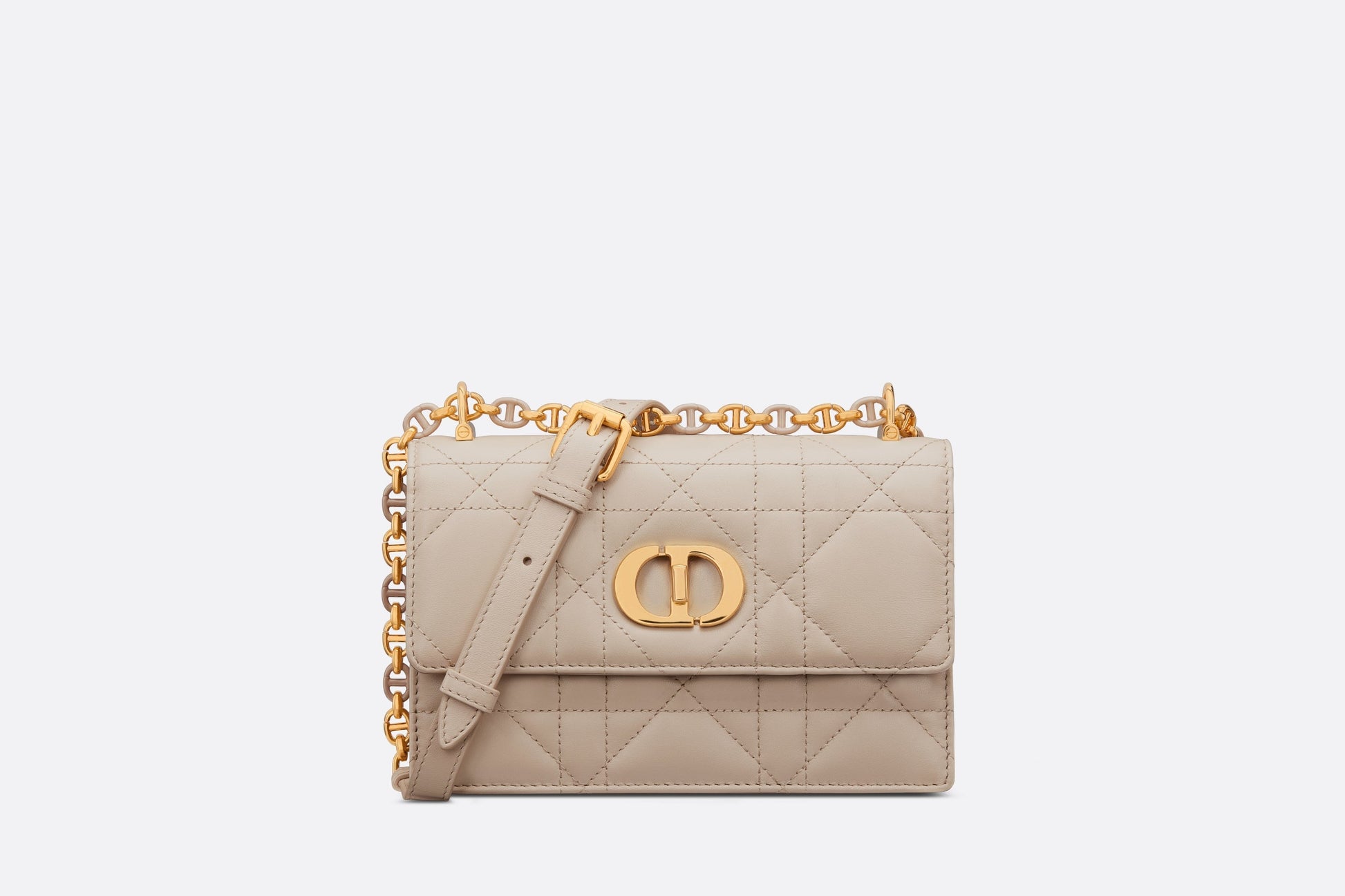The Miss Caro mini bag enhances the Dior Caro line with modern and timeless elegance. Crafted in powder beige lambskin, it stands out with the unique quilted effect of Macrocannage stitching, as well as a flap accented by a gold-finish metal CD twist clasp inspired by the seal of a Christian Dior perfume bottle. Alternating between gold-finish metal links and tonal enamel links that match the leather, the adjustable chain shoulder strap has a leather insert for added comfort when carrying the bag by hand, wearing it over the shoulder or crossbody.