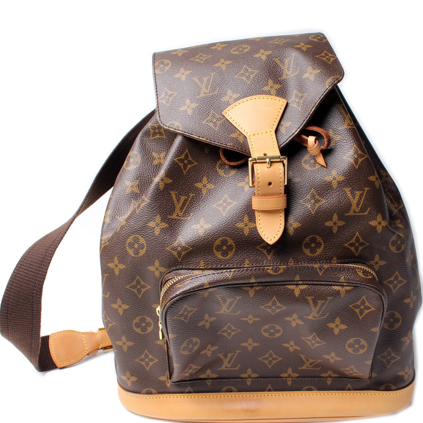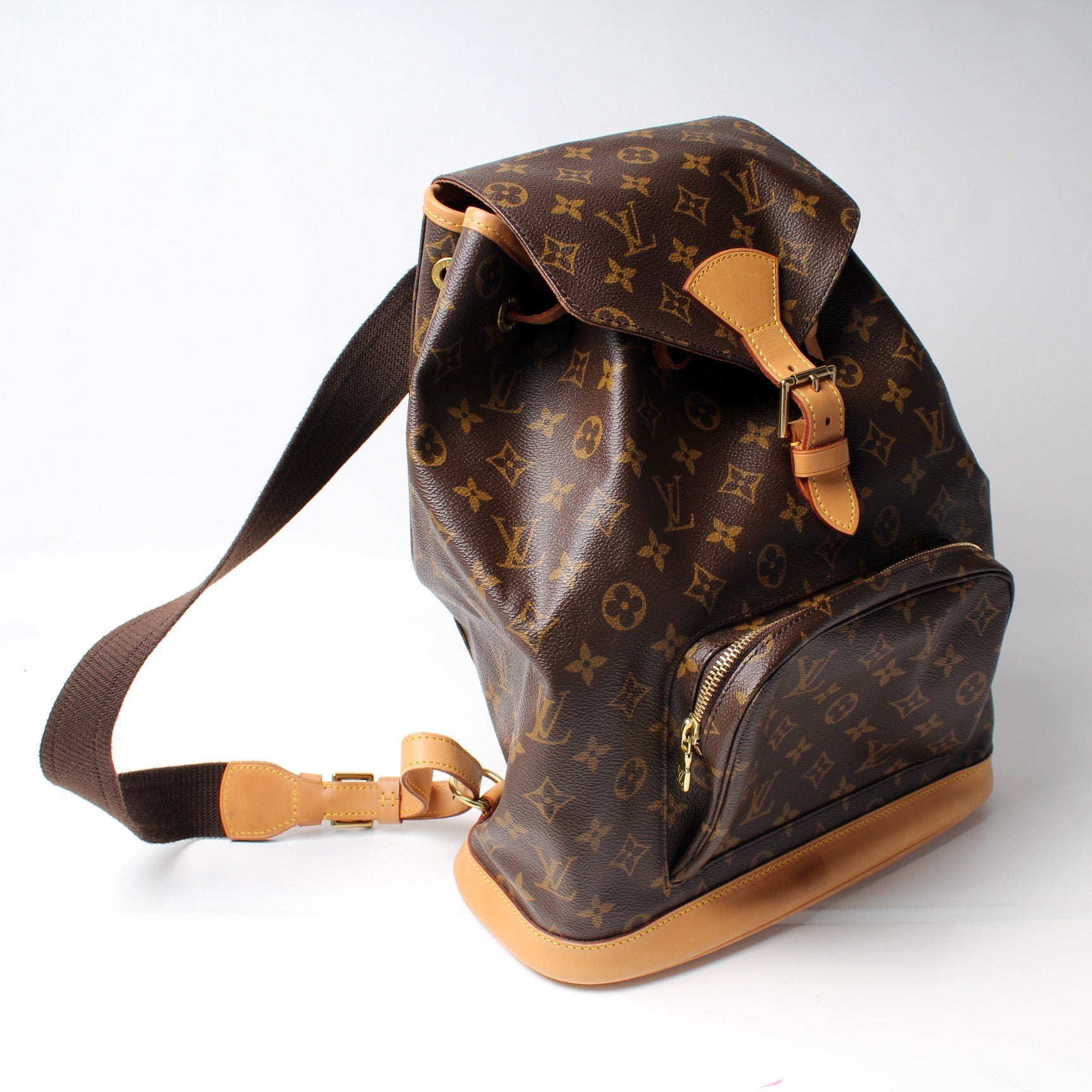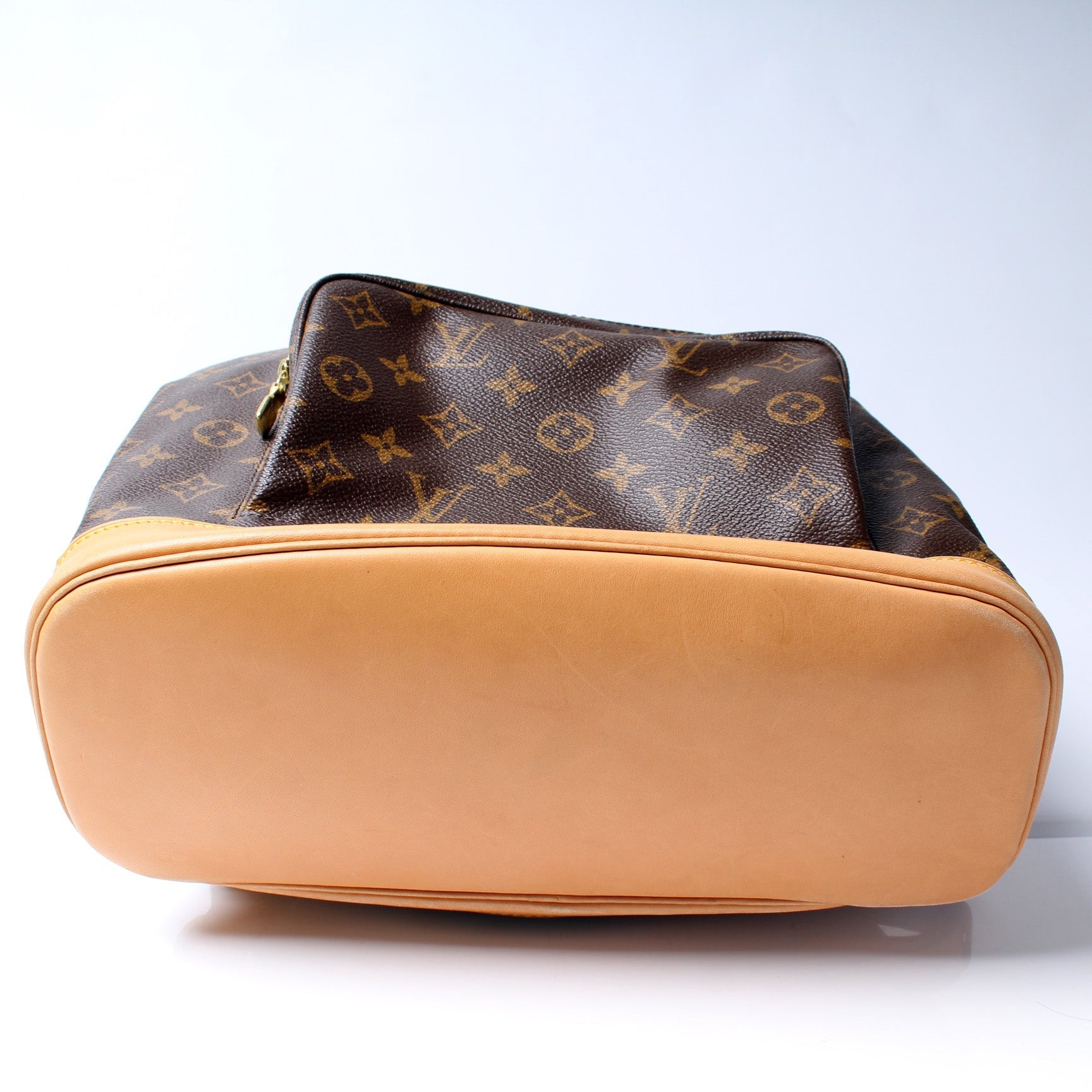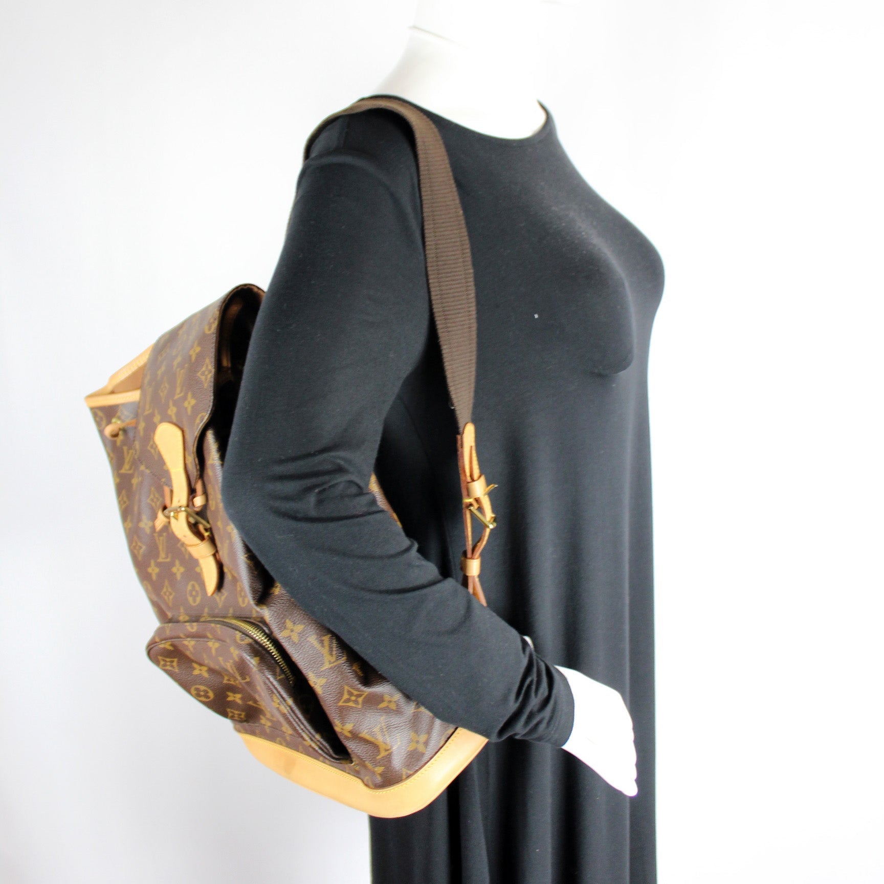 This Louis Vuitton Montsouris GM is guaranteed 100% . The exterior is in the classic Louis Vuitton Monogram coated canvas.