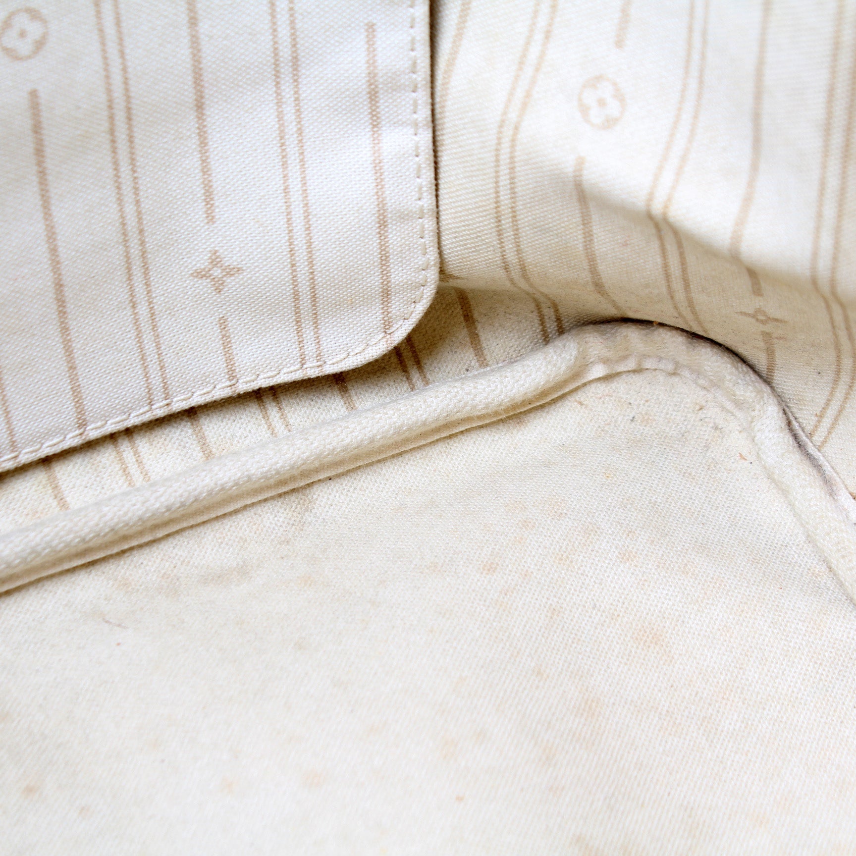 Exterior: The exterior coated canvas is free of any rips or cracks. The corners and leather trim show signs of wear.