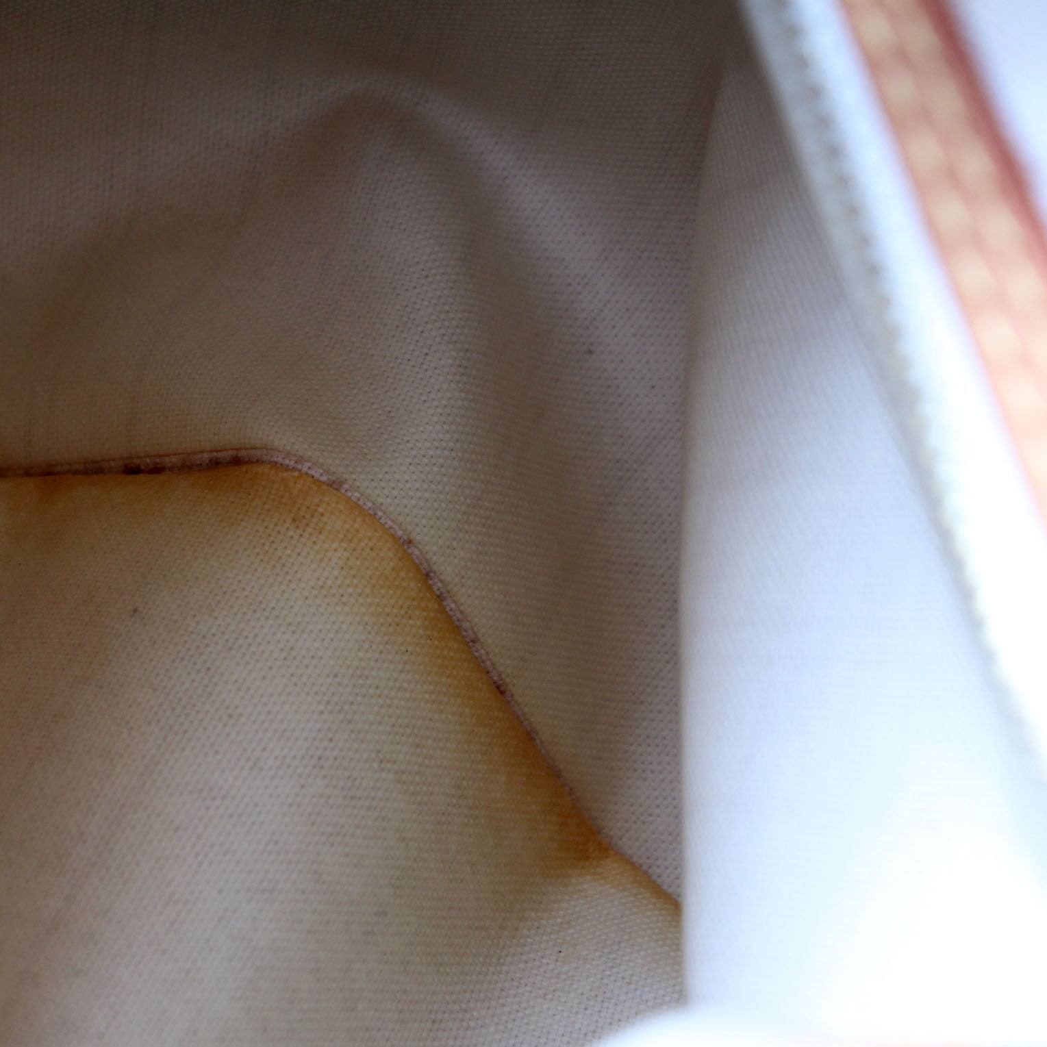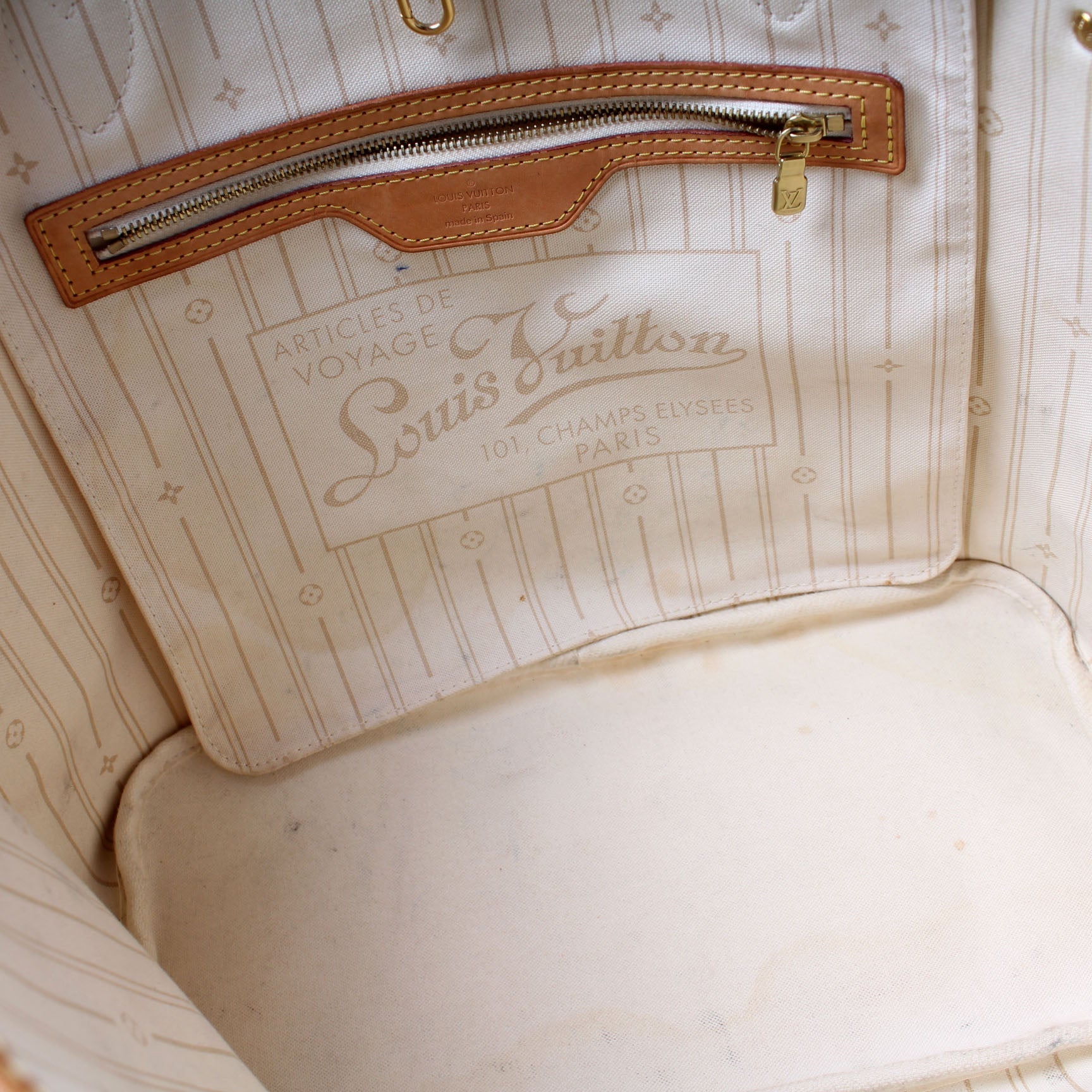 Interior: The interior is free of rips or tears. The interior features one zip closure pocket. There is discoloration to the interior fabric.