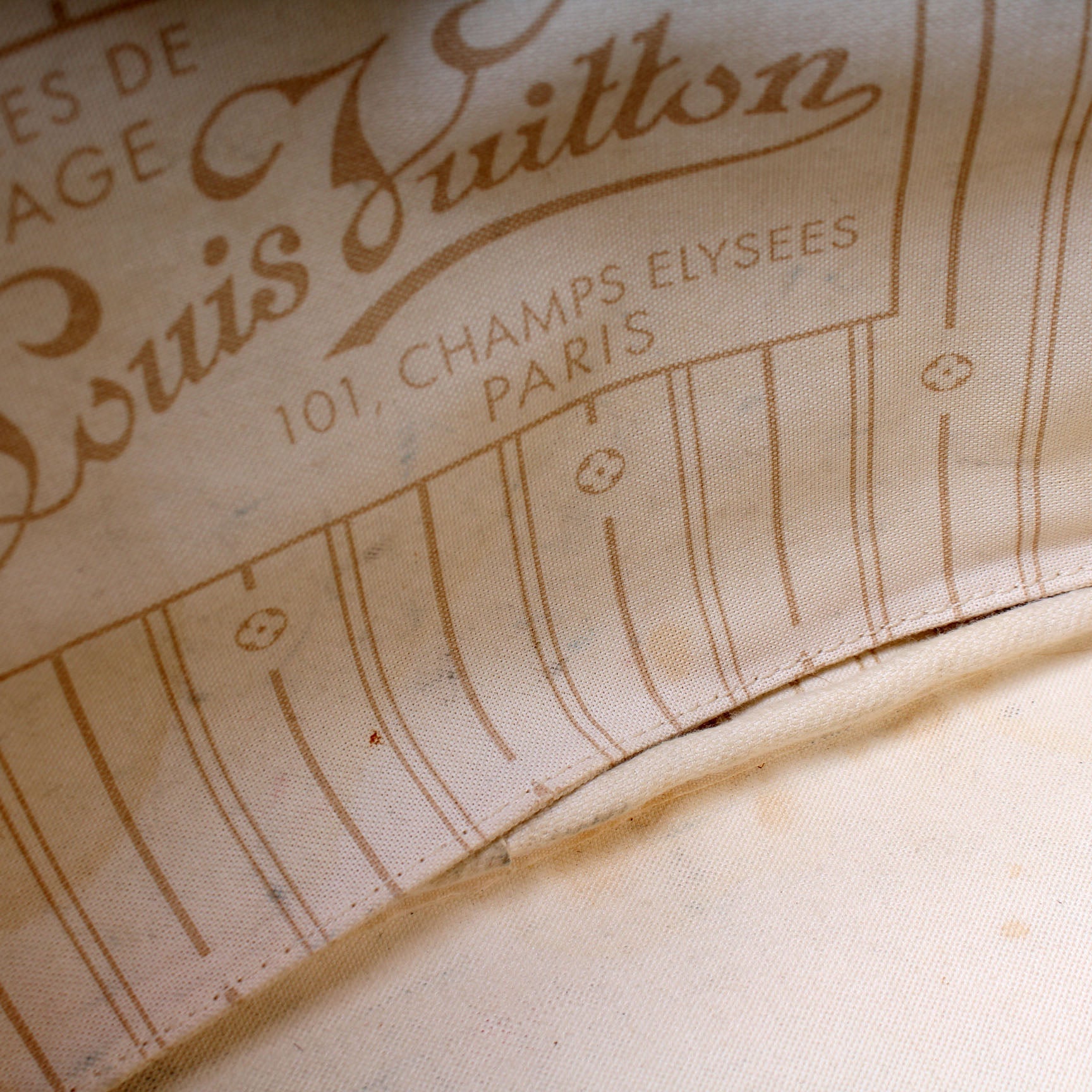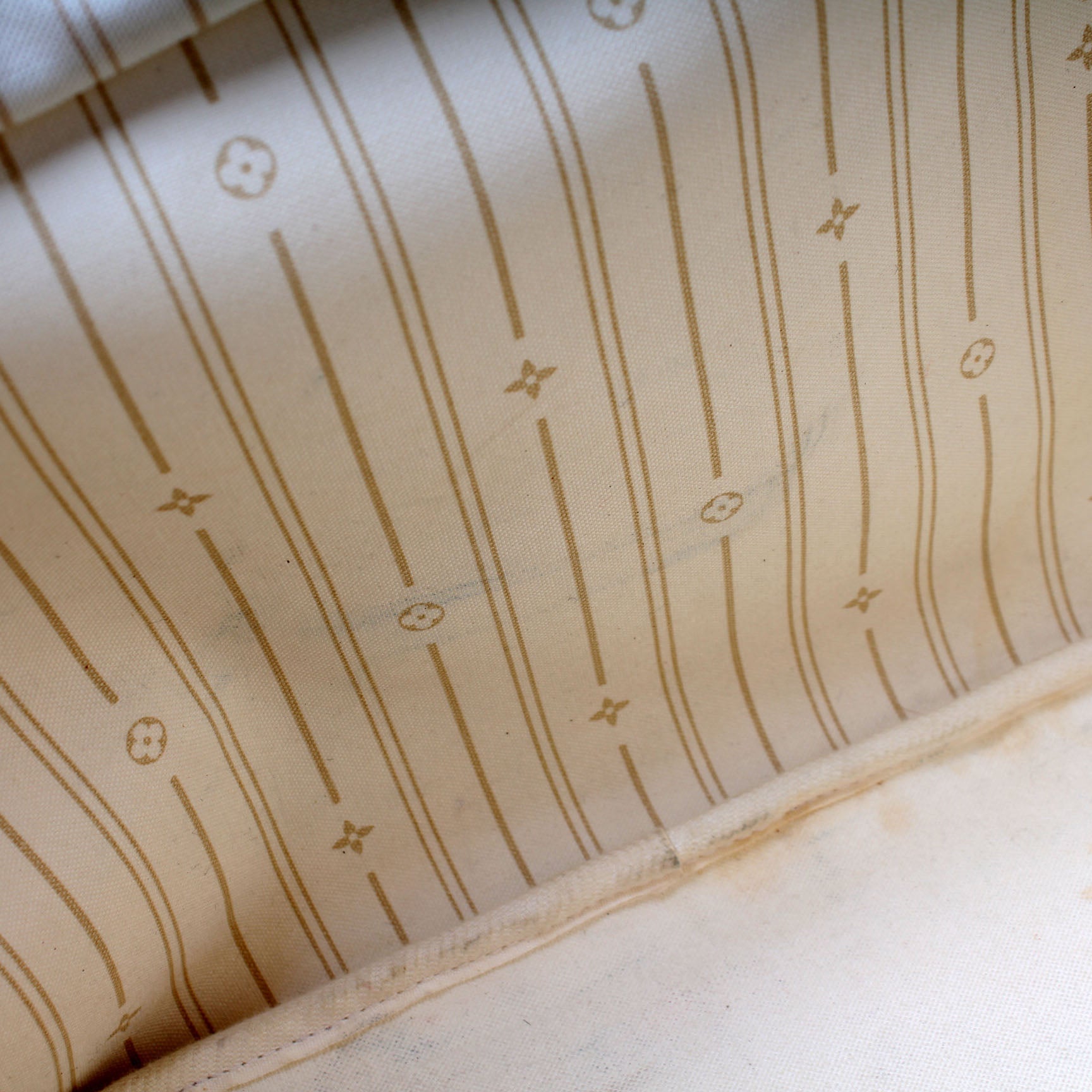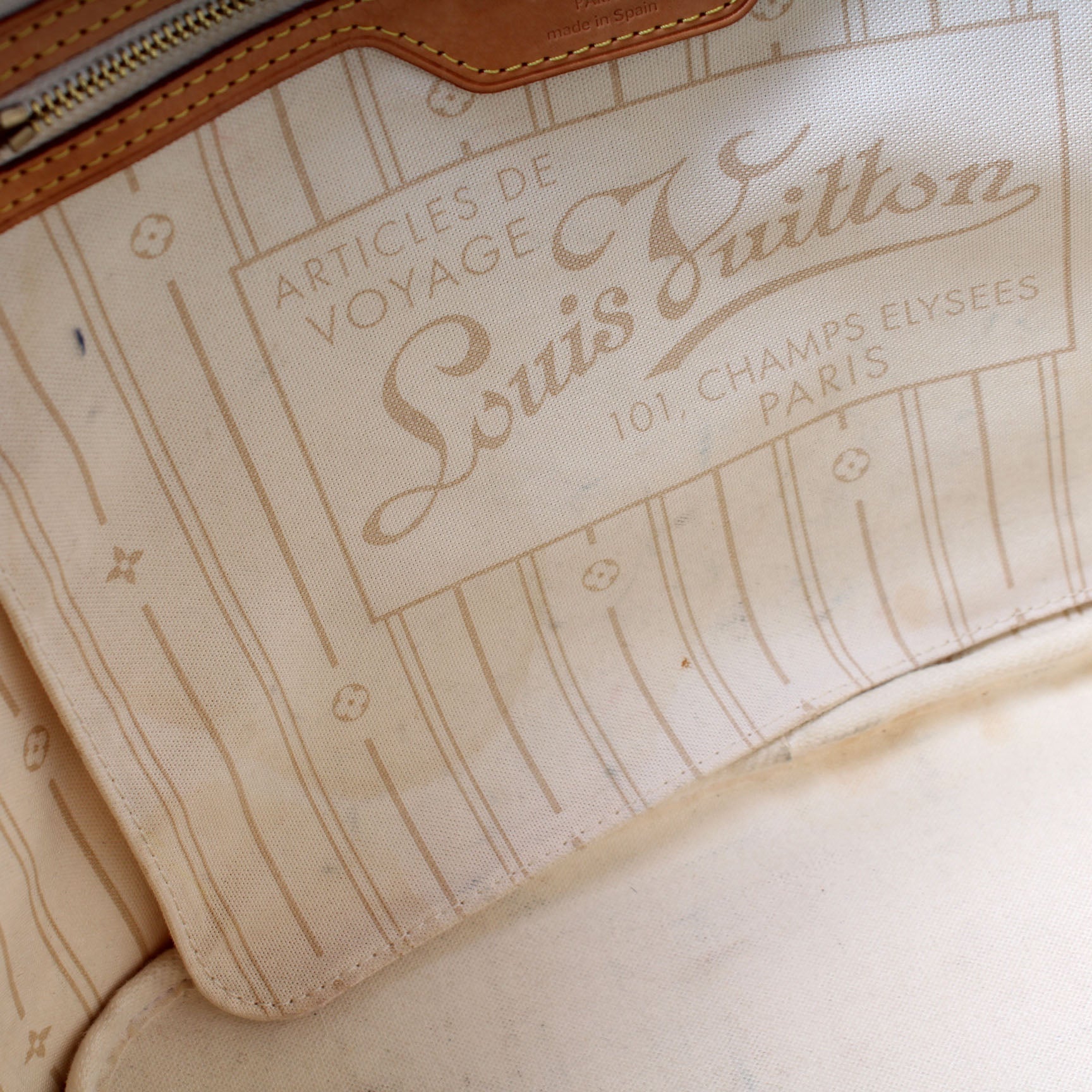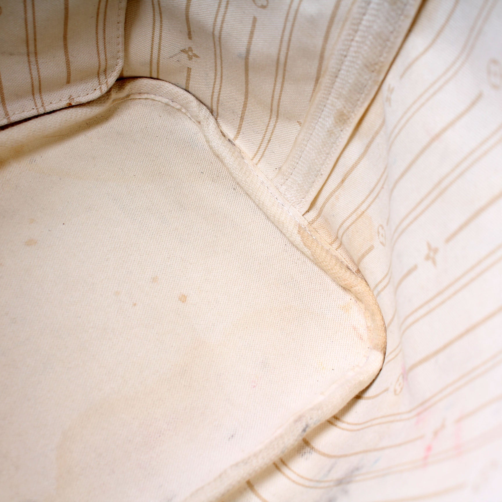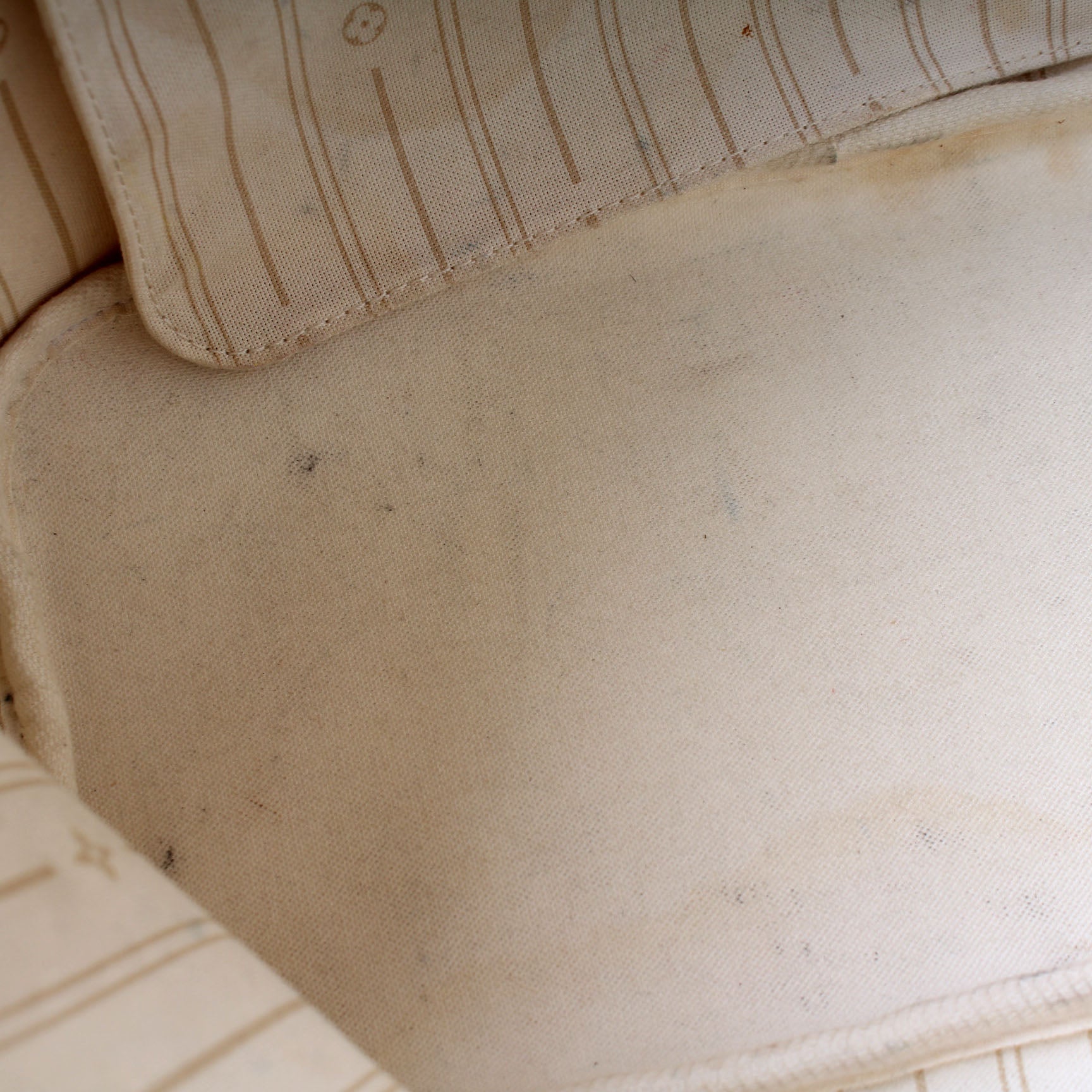 Exterior: The exterior coated canvas is free of any rips or cracks. The leather trim has discoloration.