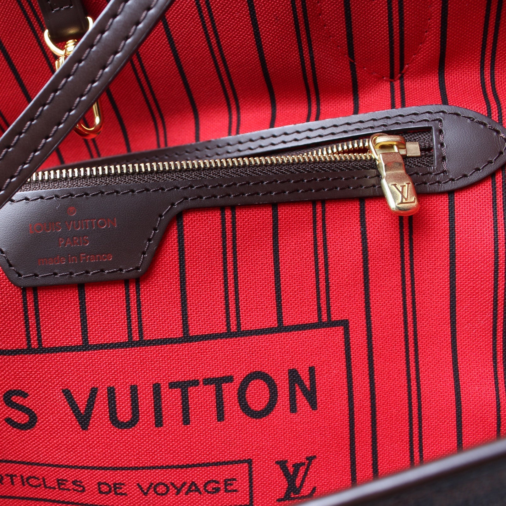 This Louis Vuitton Neverfull MM is guaranteed 100% . The exterior is in the classic Louis Vuitton Damier Ebene coated canvas.