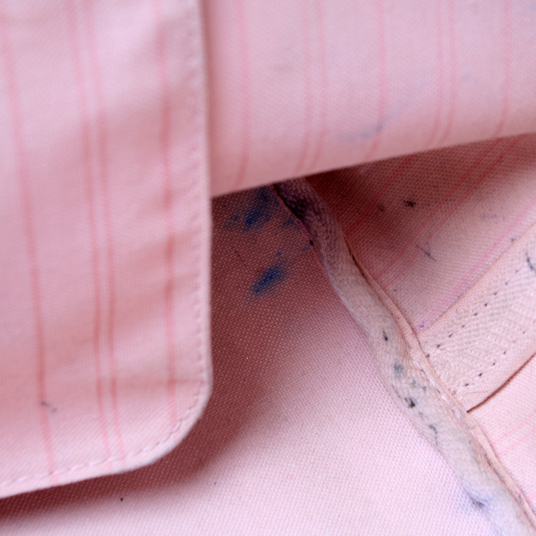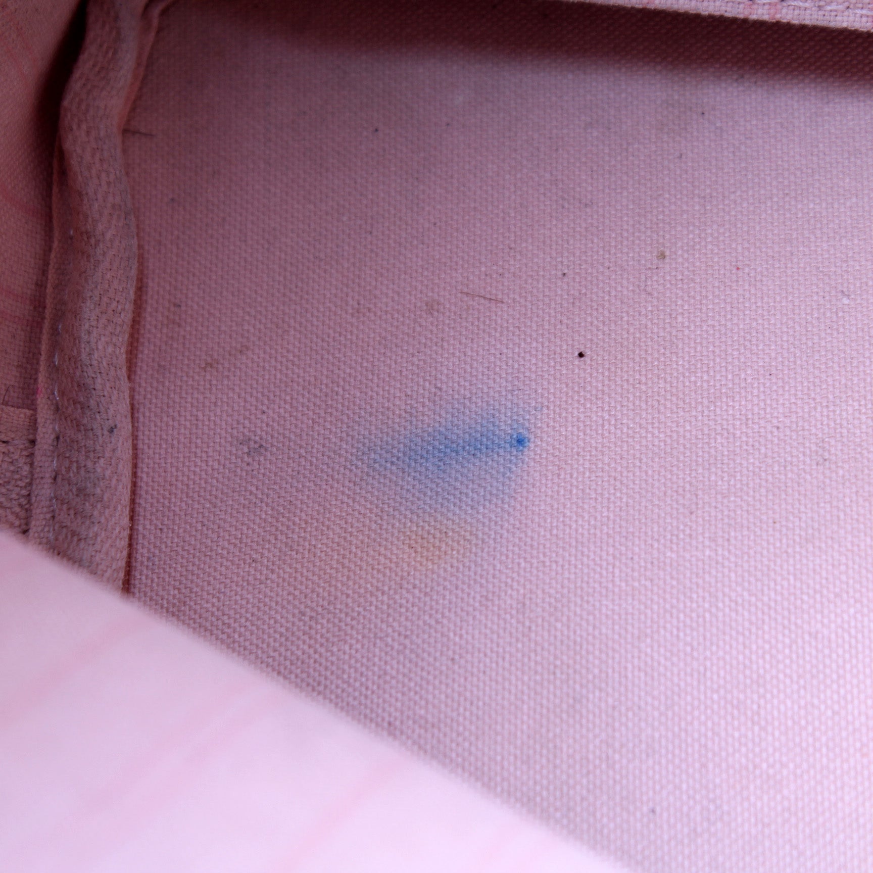 Interior: The interior is free of rips or tears. The interior features one zip closure pocket. There is discoloration throughout the interior .