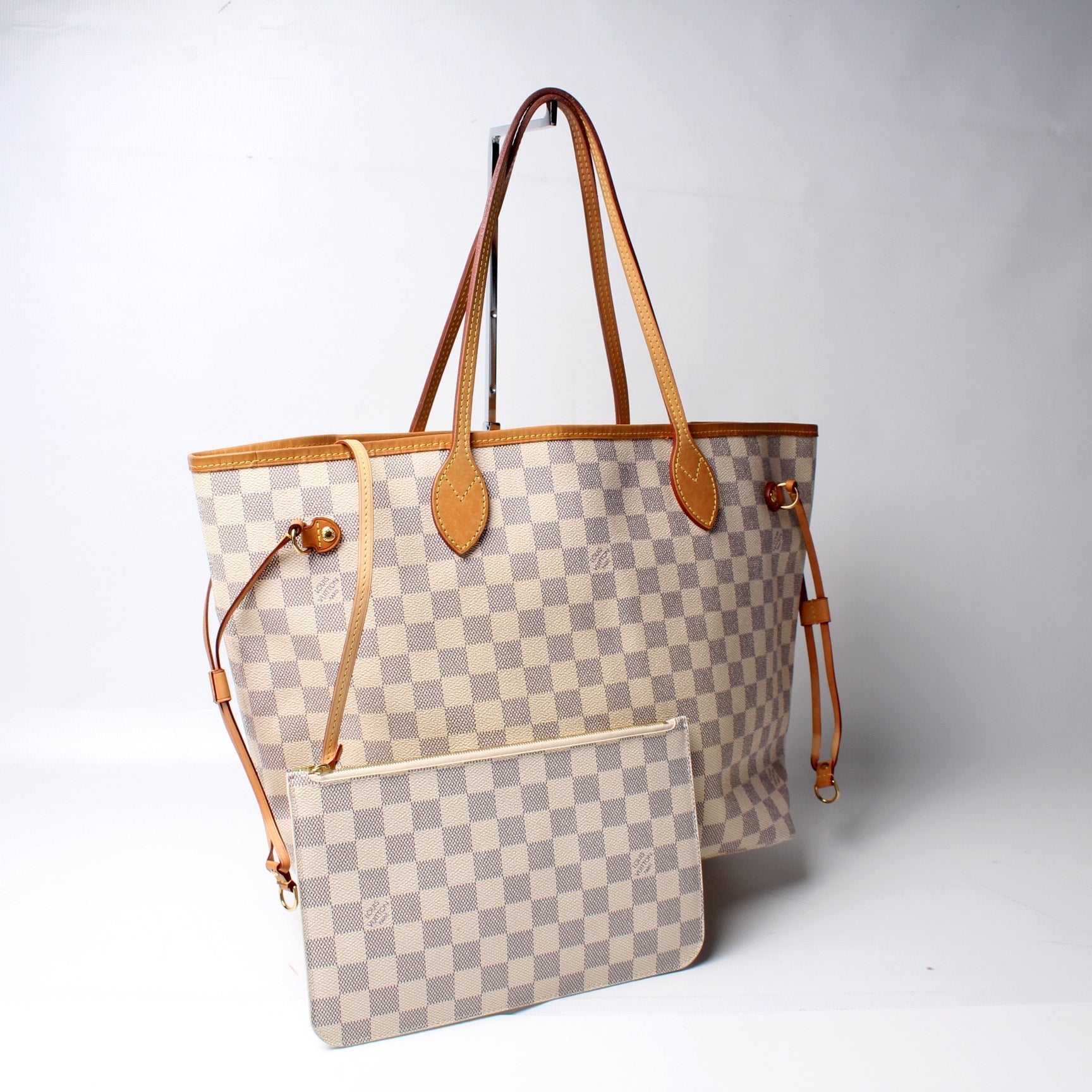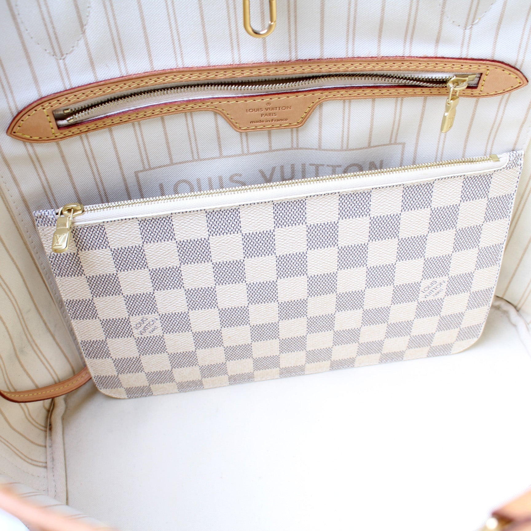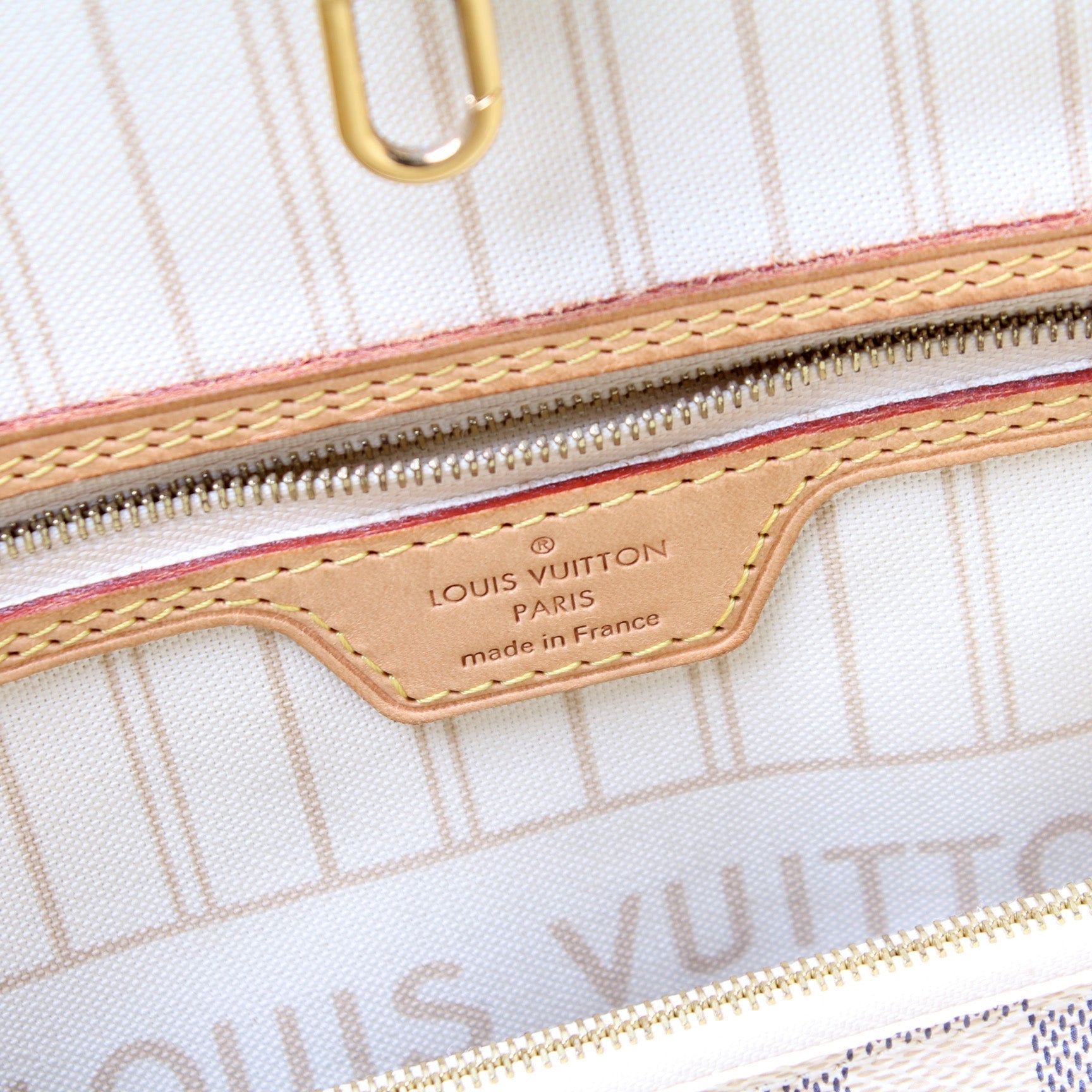 This Louis Vuitton Neverfull MM W/ Wallet is guaranteed 100% . The exterior is in the classic Louis Vuitton Damier Azur coated canvas.