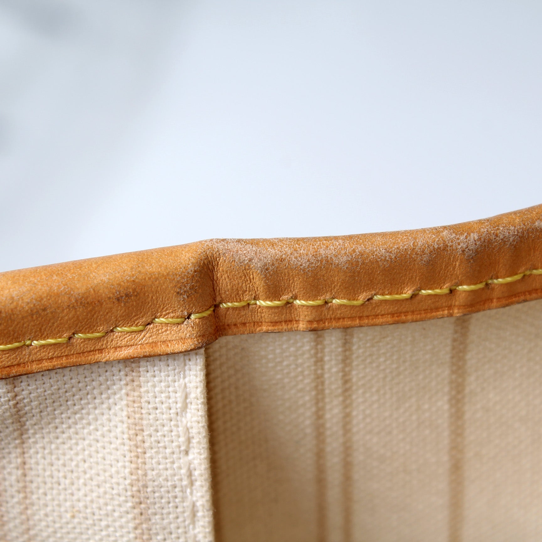 Exterior: The exterior coated canvas is free of any rips or cracks. The corners and leather detail show minor signs of wear.