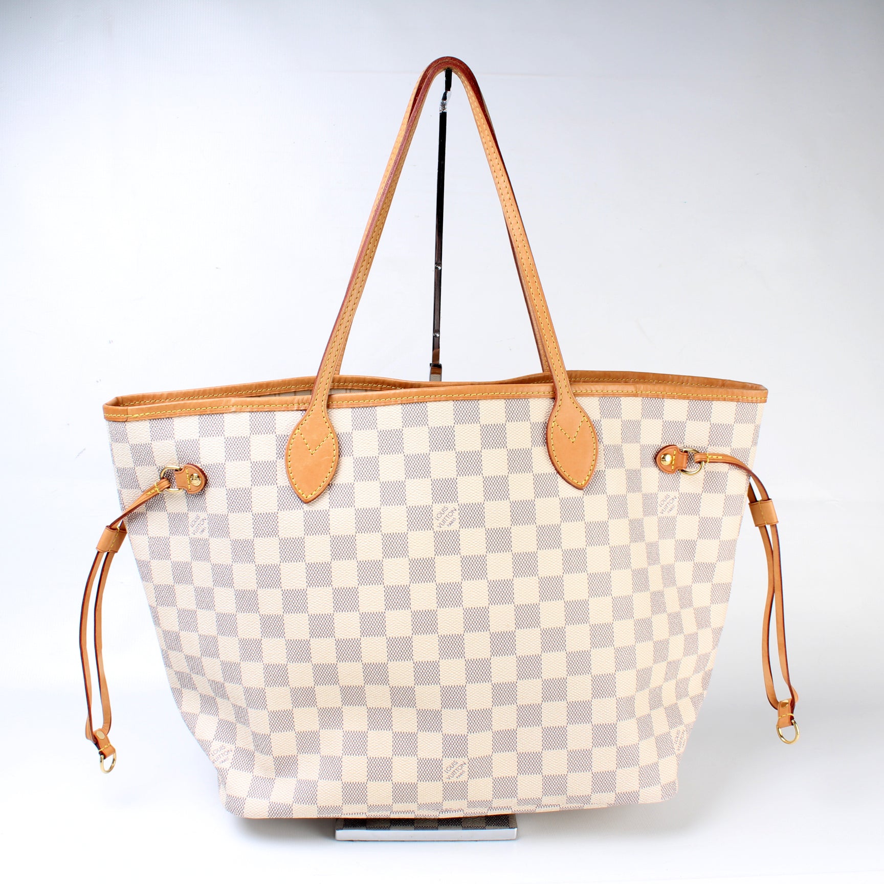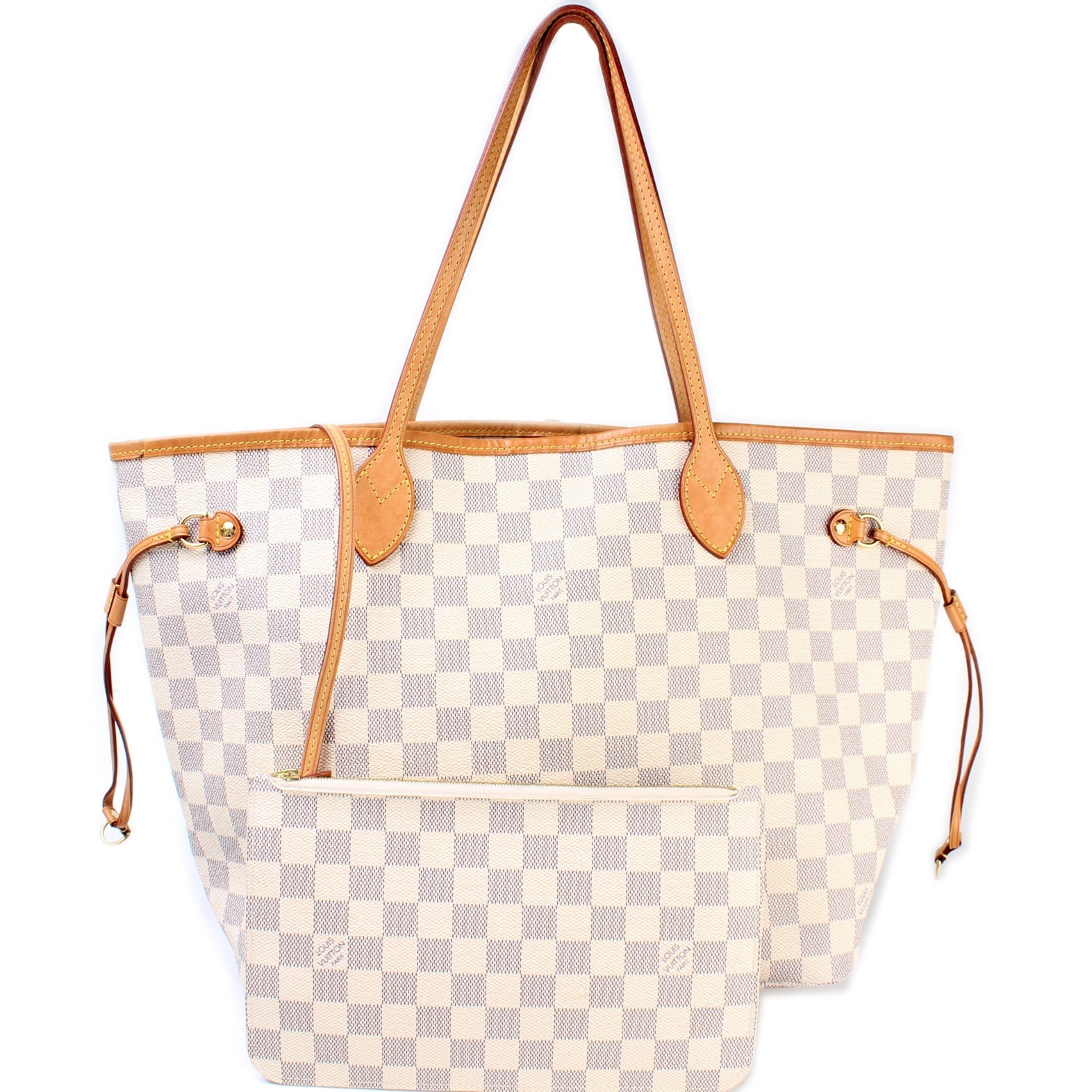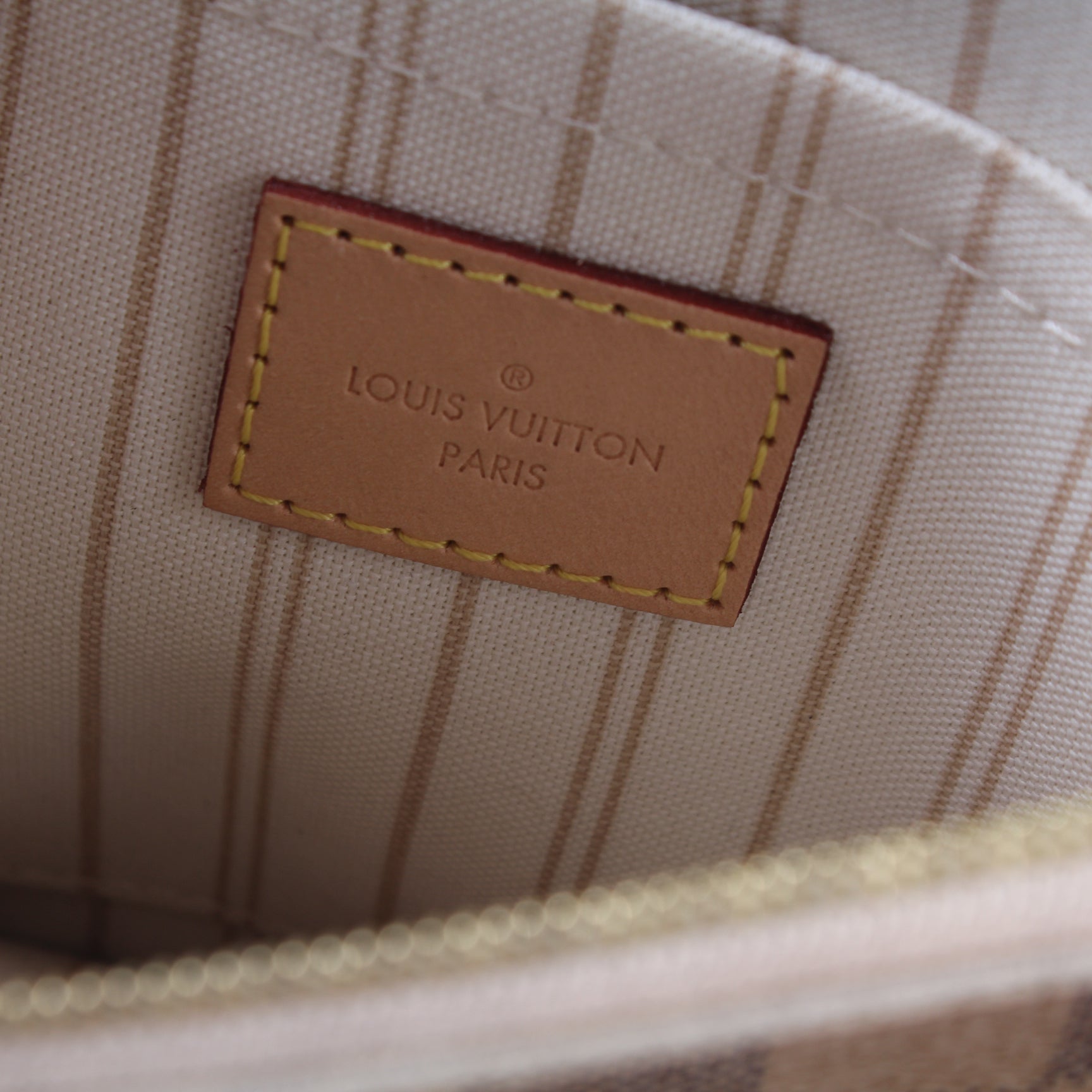 This Louis Vuitton Neverfull MM W/ Wallet is guaranteed 100% . The exterior is in the classic Louis Vuitton Damier Azur coated canvas.