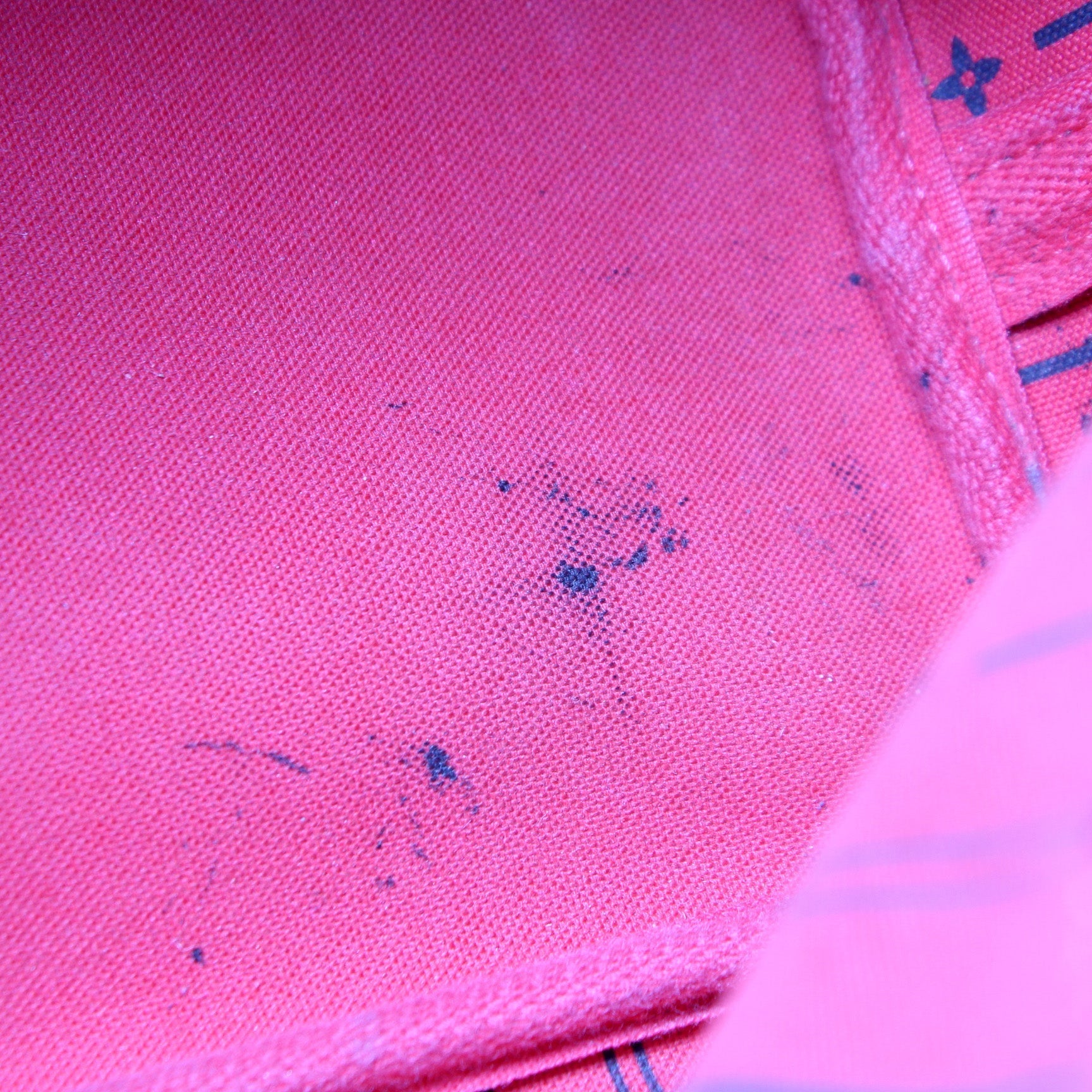 Interior: The interior is free of rips or tears. The interior features one zipper pocket. The interior has pen marks and stains as pictured.