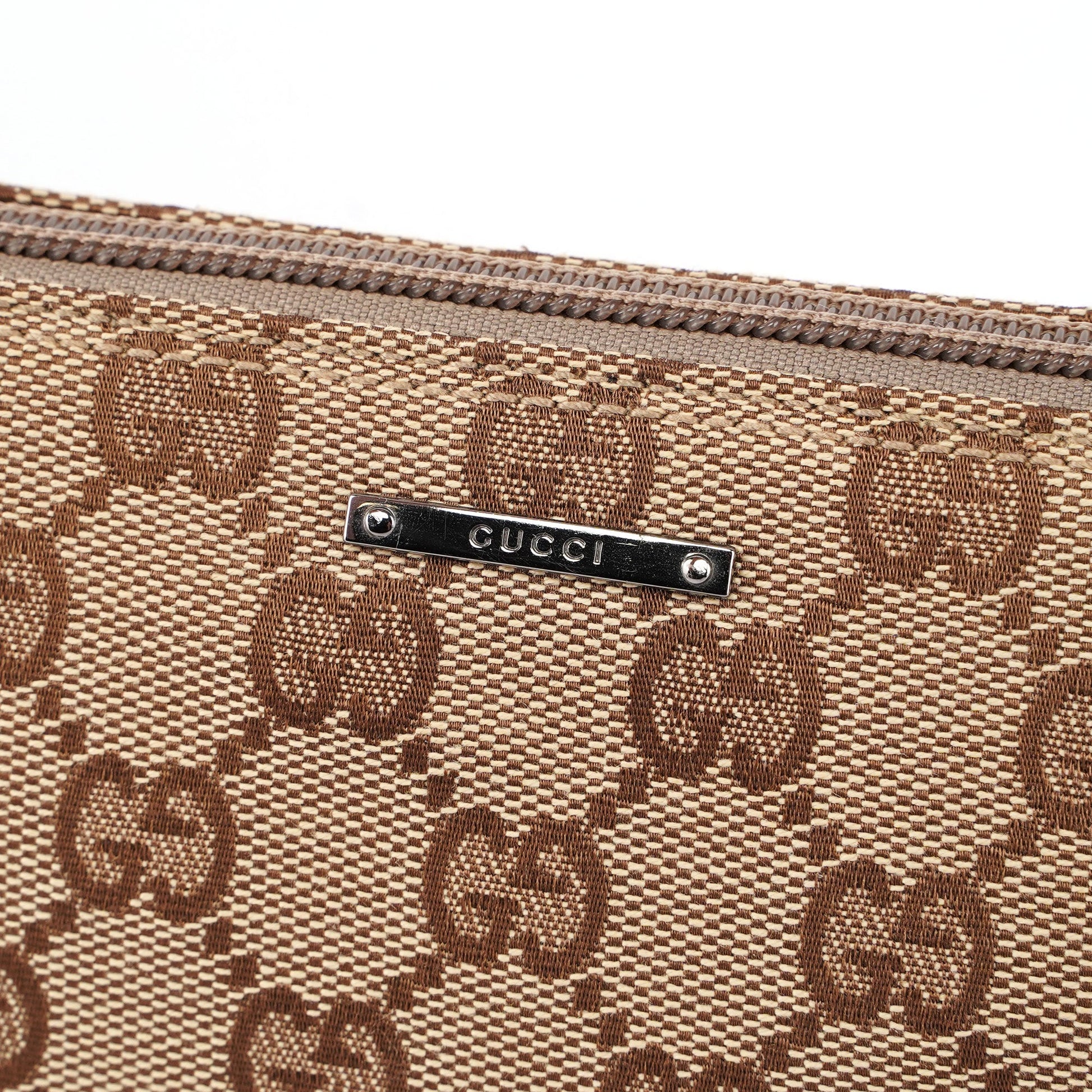 Explore timeless elegance with the Gucci GG Boat Pochette by Tom Ford, circa late 1990s. This exquisite piece combines beige GG canvas with turquoise leather trim and silver-tone hardware. Its secure zip closure and satin-lined interior offer luxury and practicality, while the subtle Gucci plaque adds a touch of heritage. A perfect blend of vintage charm and sophistication.