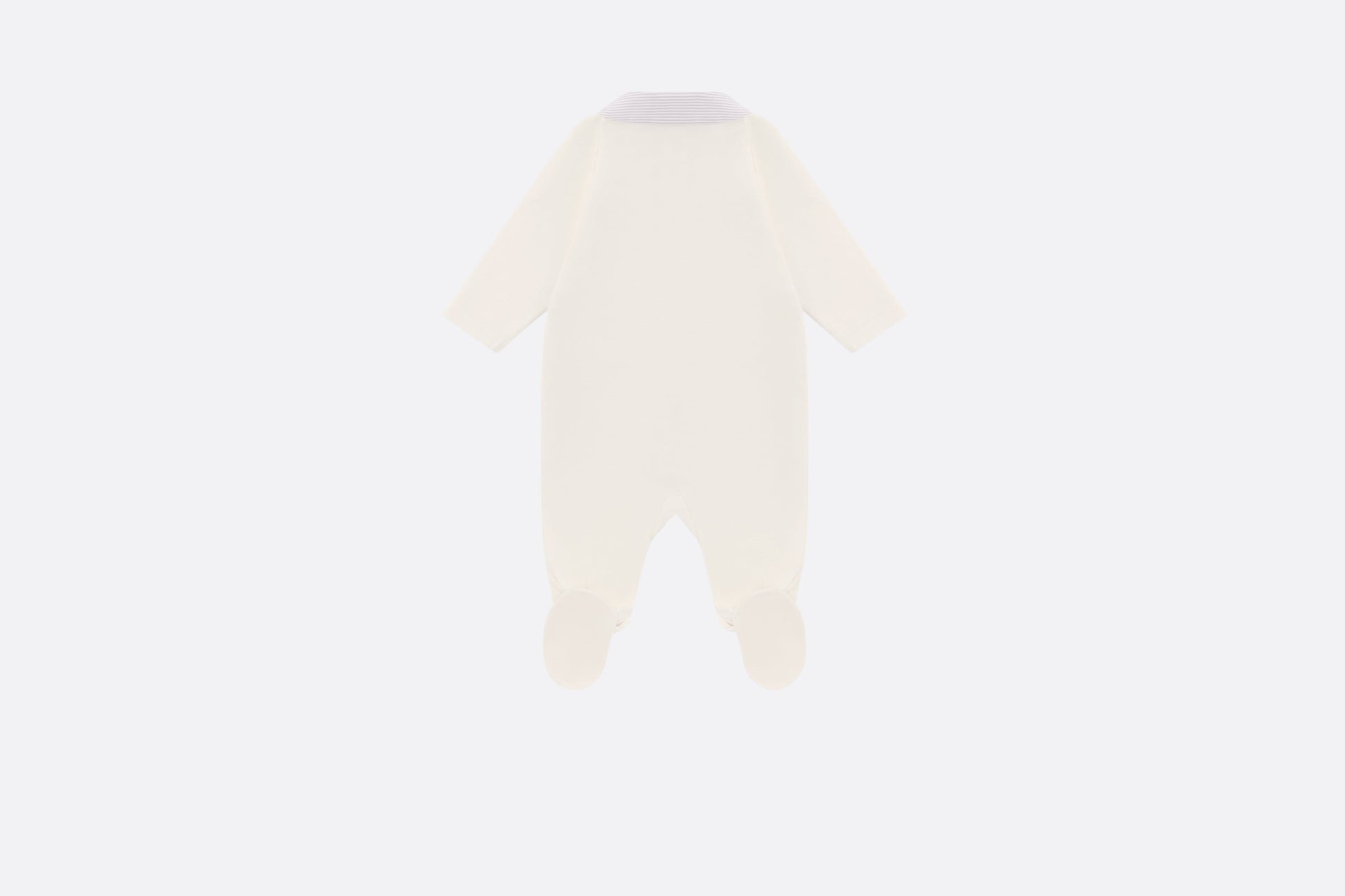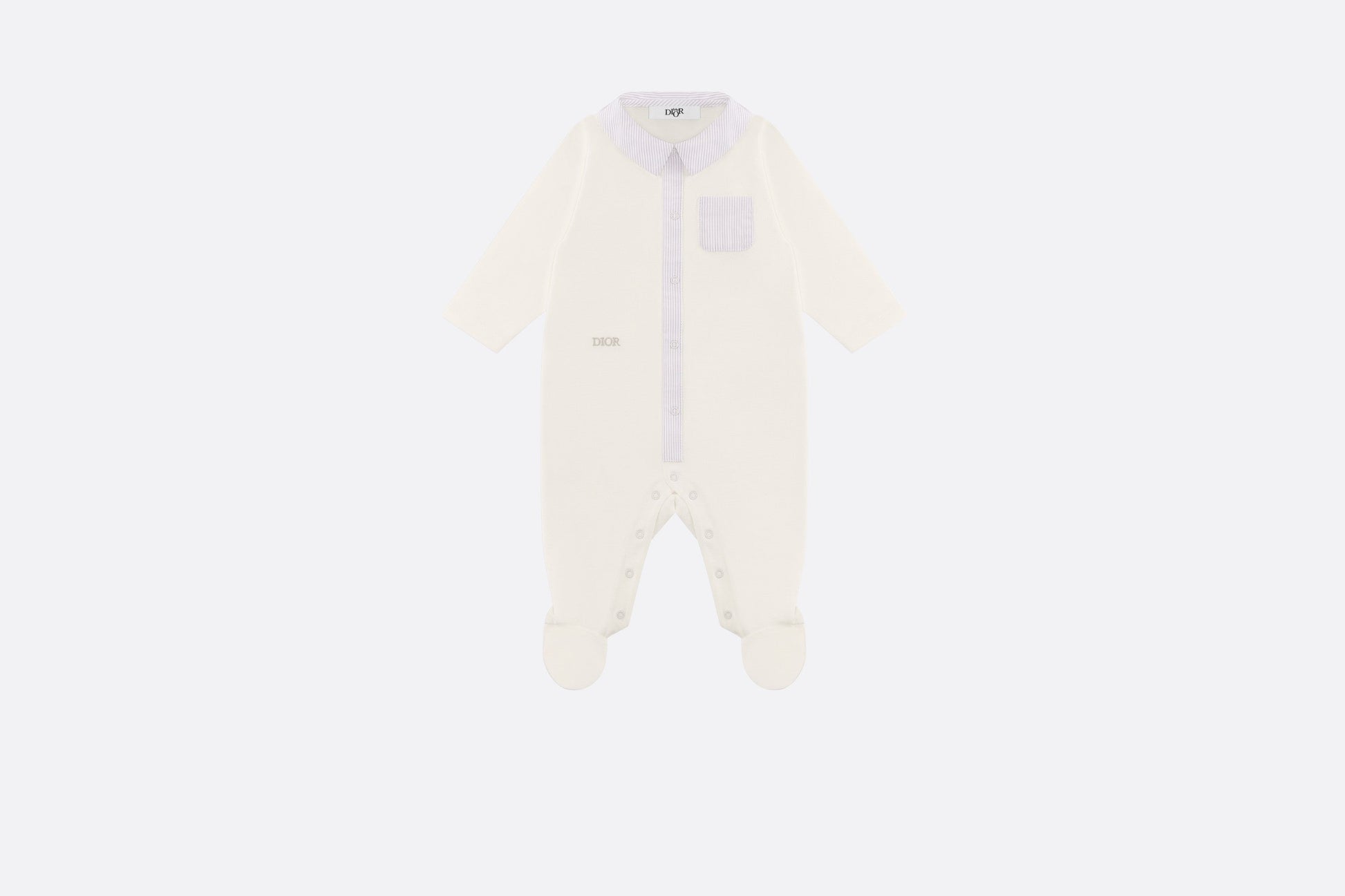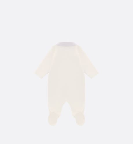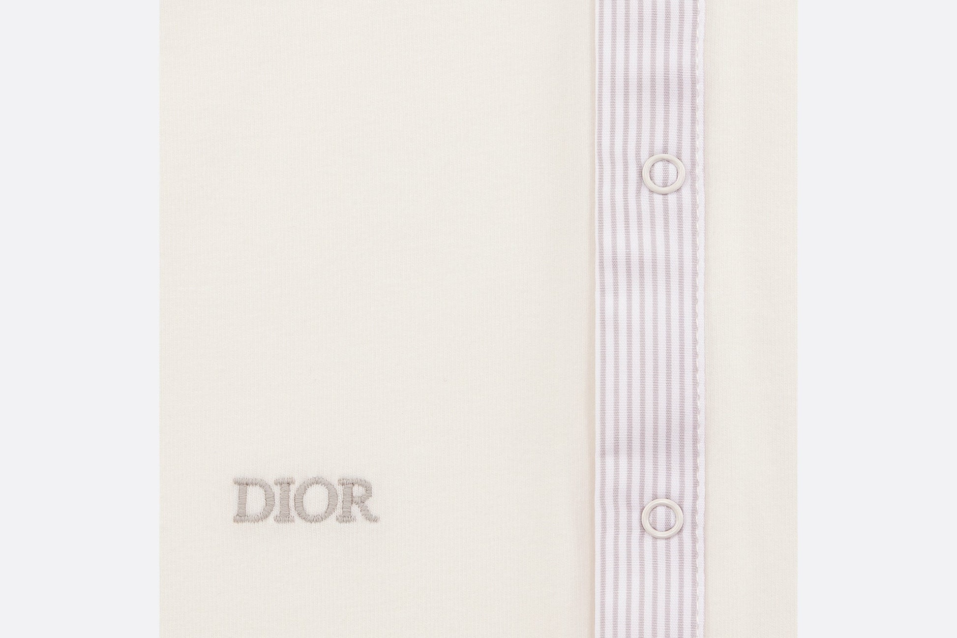 The newborn gift set is composed of pajamas, a bib and a beanie. Made from ivory cotton interlock and poplin with gray striped inserts, each piece is embellished with a beige Dior embroidery. Featuring snaps on the front and inseam for easy dressing, the pajamas are completed by a spread collar and patch pocket for a chic touch. Soft and comfortable, the pieces create an ideal newborn gift set.