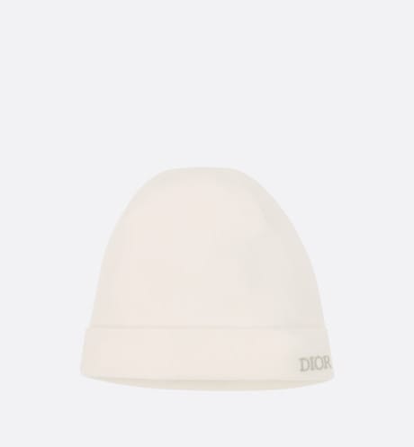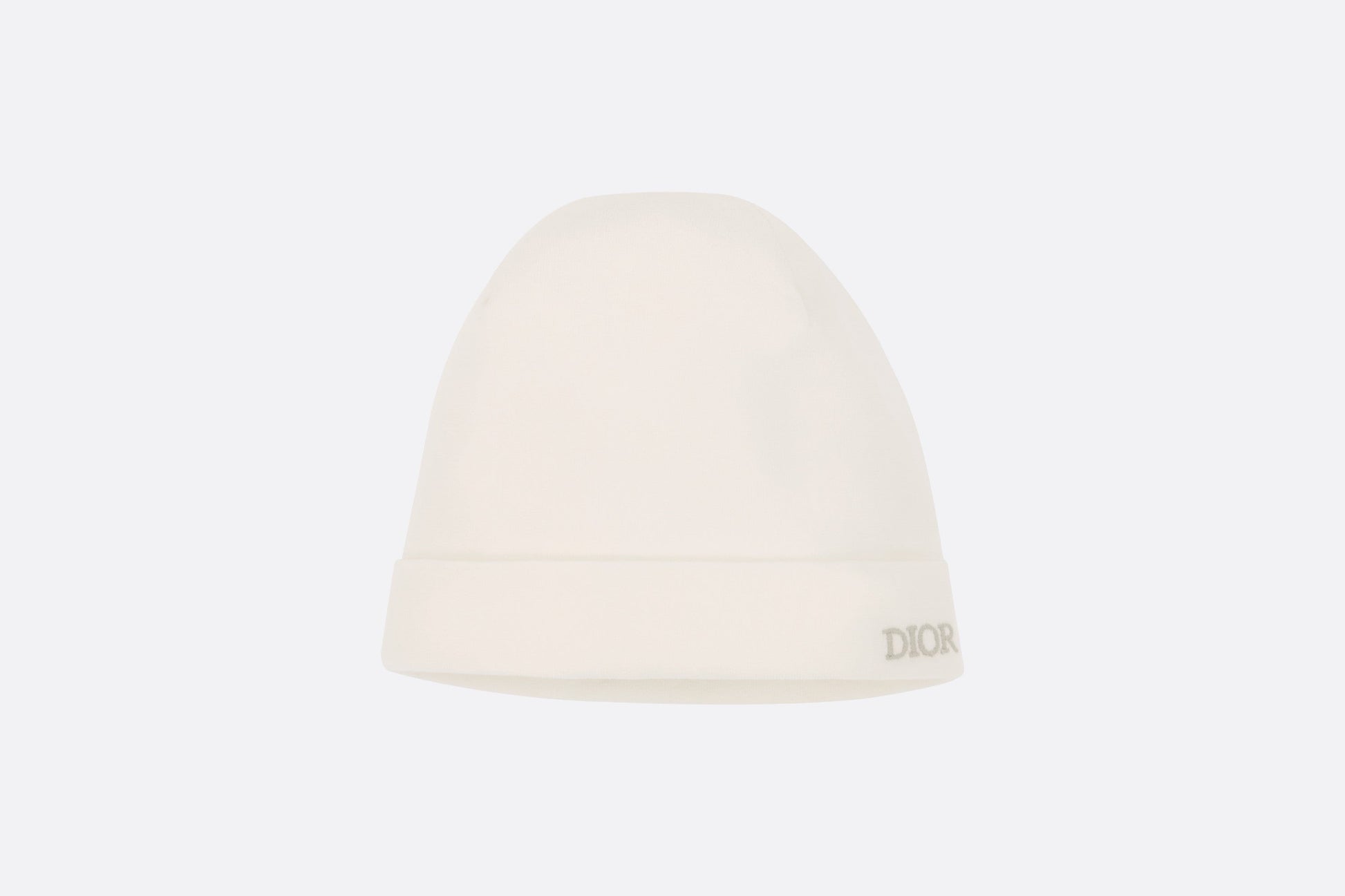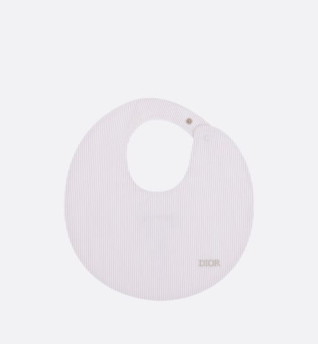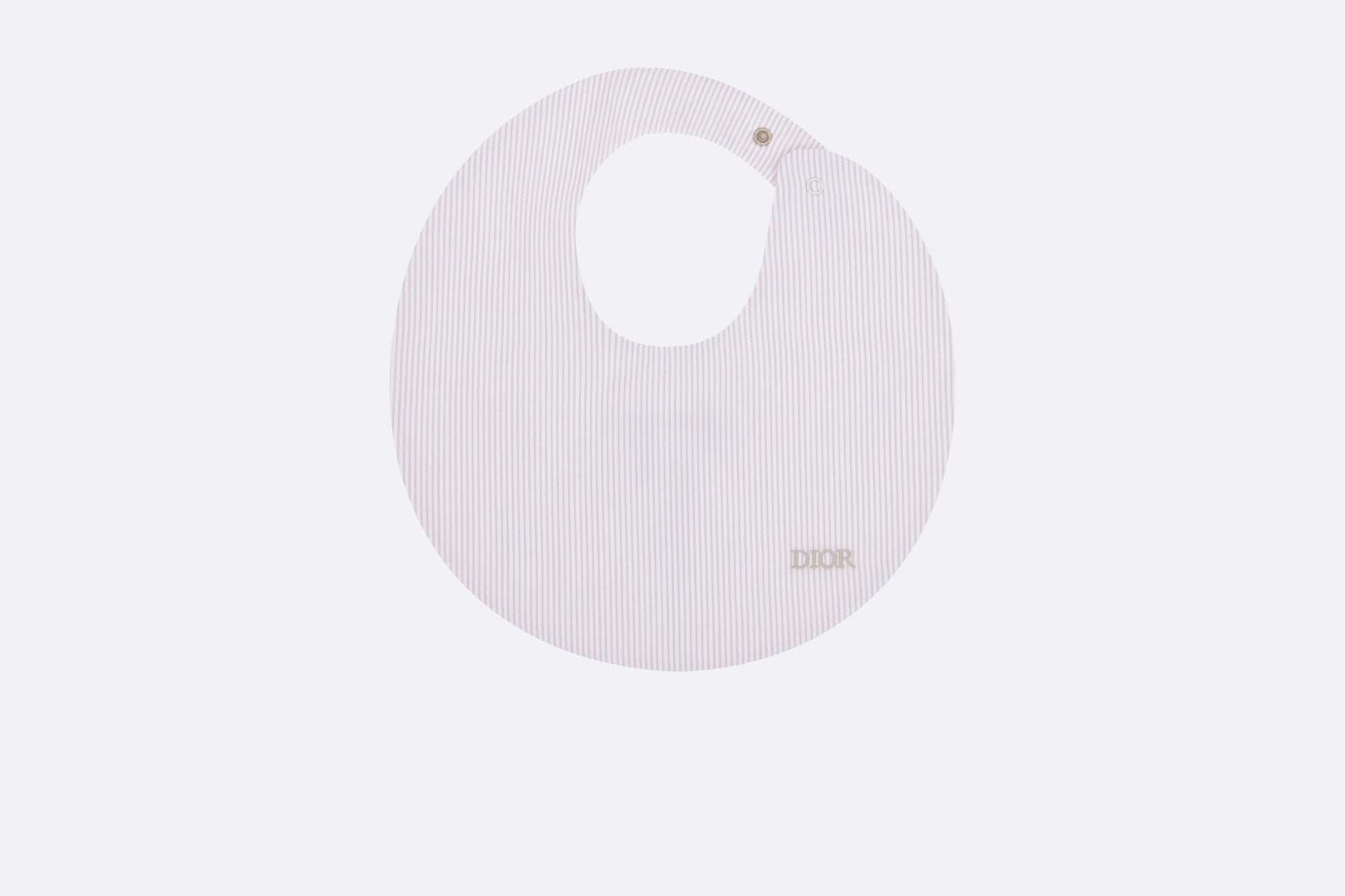 The newborn gift set is composed of pajamas, a bib and a beanie. Made from ivory cotton interlock and poplin with gray striped inserts, each piece is embellished with a beige Dior embroidery. Featuring snaps on the front and inseam for easy dressing, the pajamas are completed by a spread collar and patch pocket for a chic touch. Soft and comfortable, the pieces create an ideal newborn gift set.