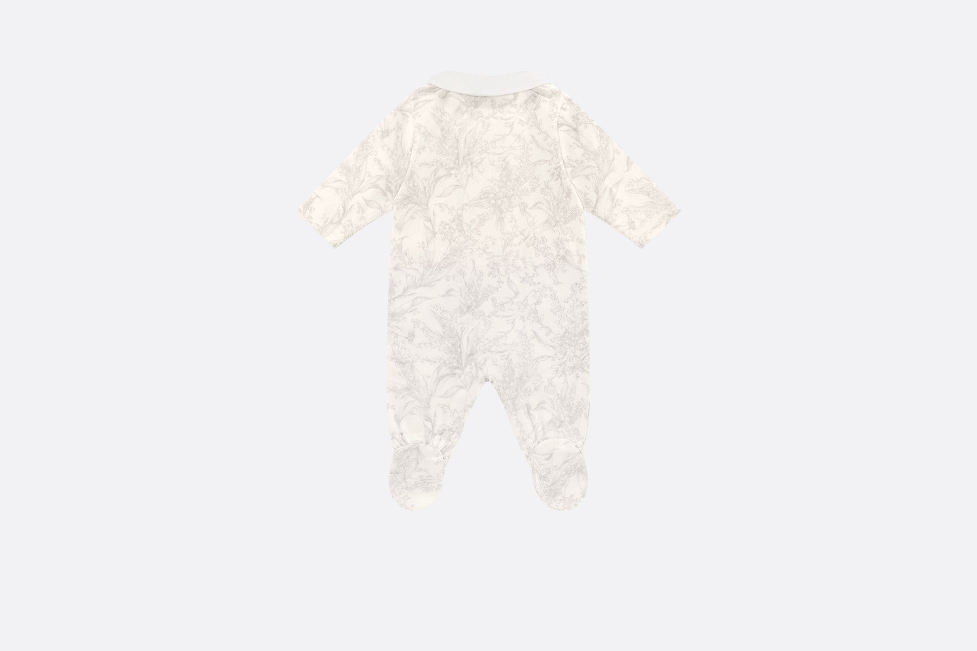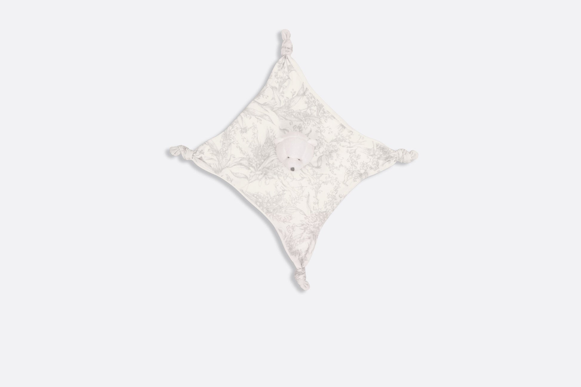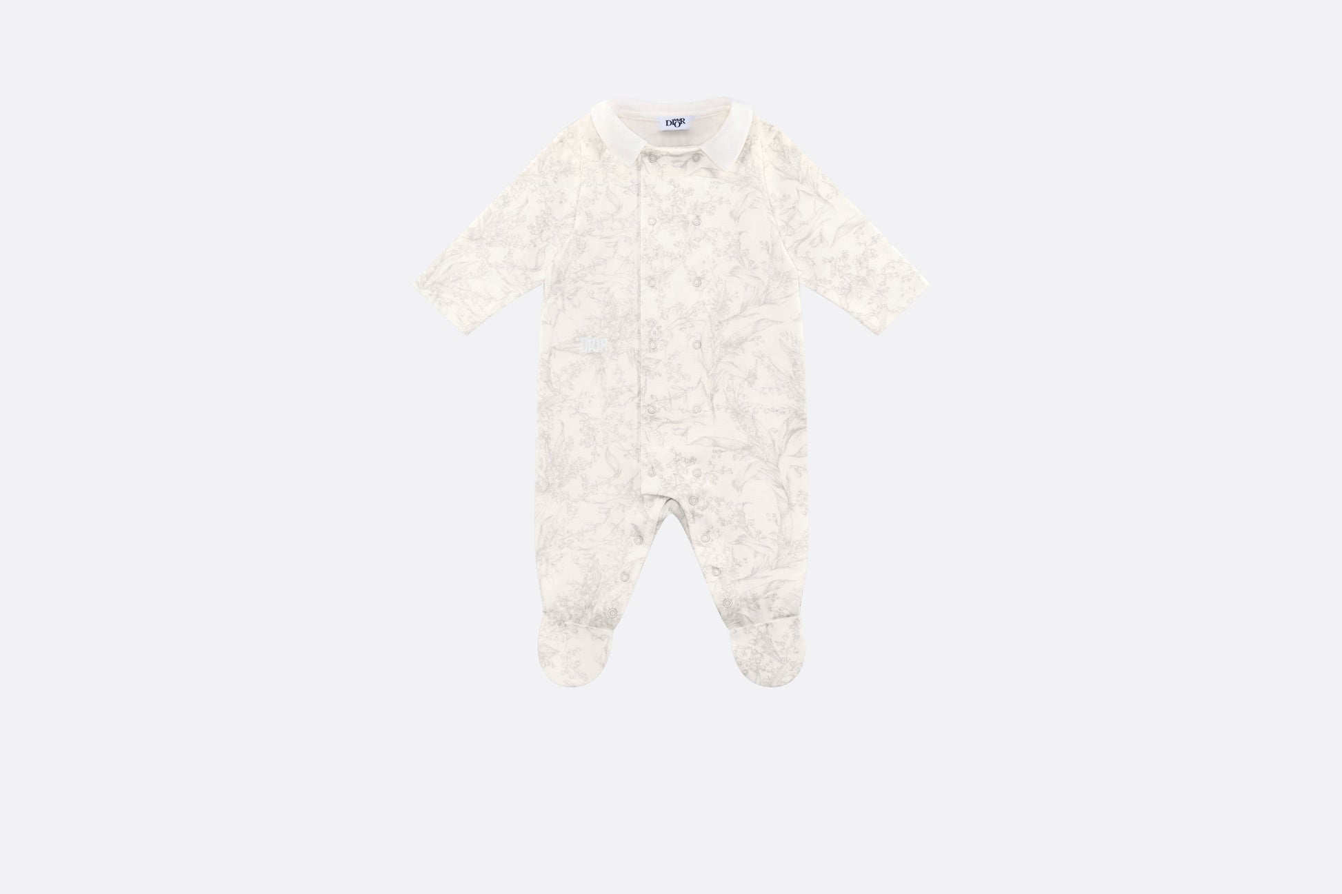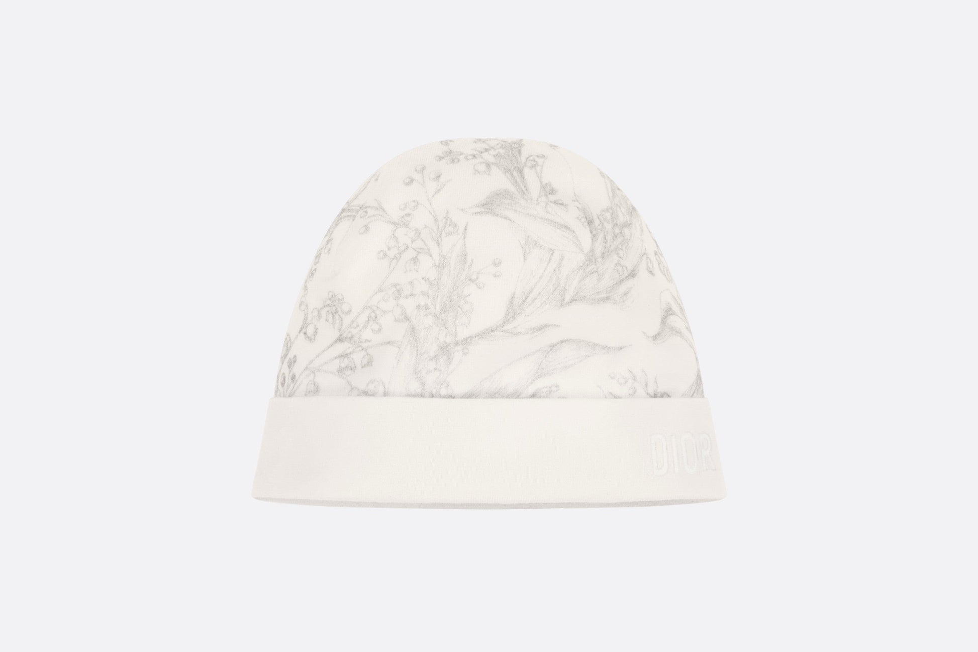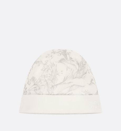 The newborn gift set is composed of pajamas, a beanie and a lovey blanket. Crafted in ivory cotton interlock, they showcase the delicate light gray Lily of the Valley motif, an homage to Mr. Dior's favorite flower and love of nature. Adorned with snaps on the front and inseam for easy dressing, the pajamas are completed by a spread collar for a chic touch. Enhanced by an ivory Dior embroidery on each piece, the set will make an ideal gift for newborns.