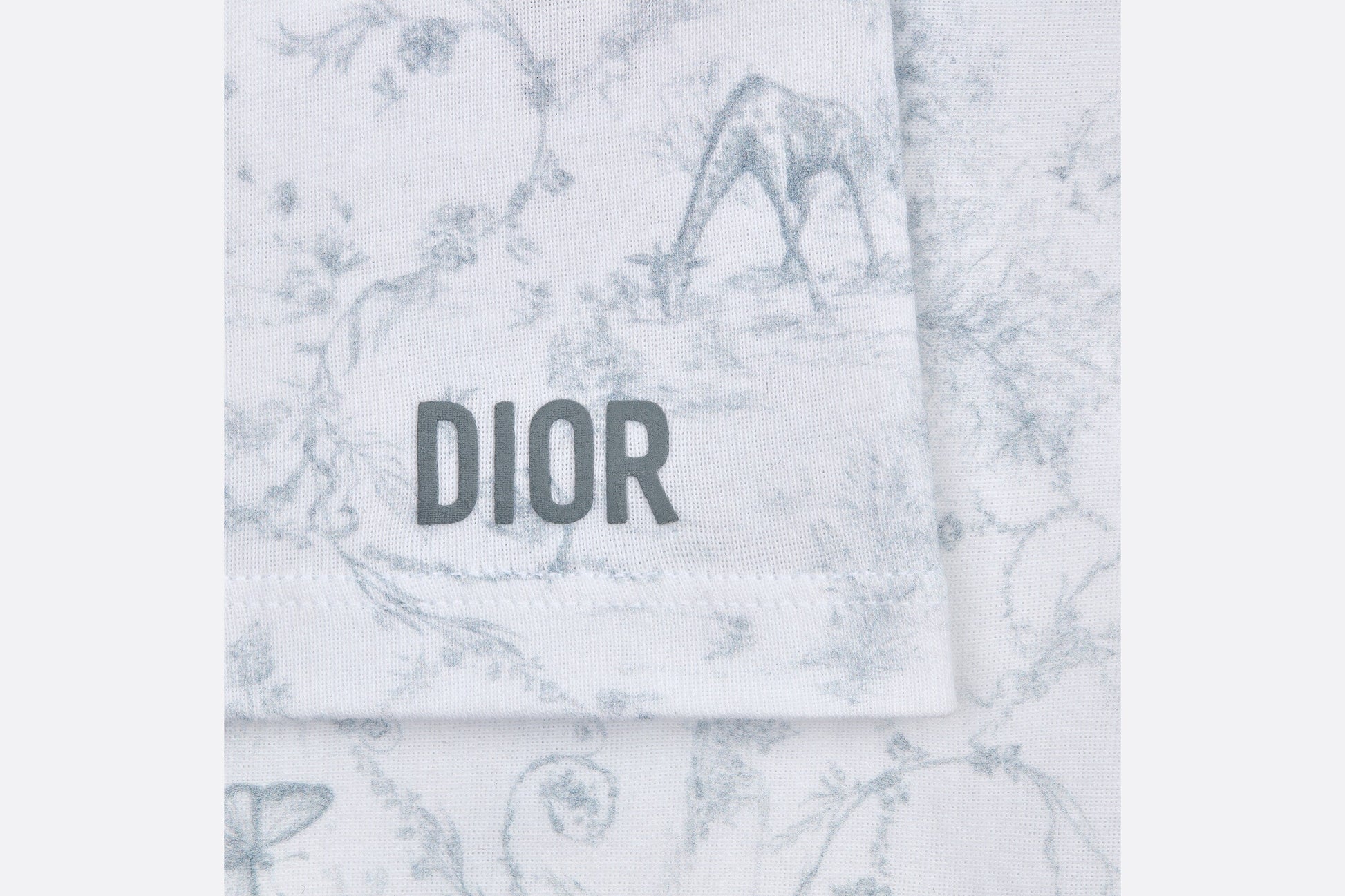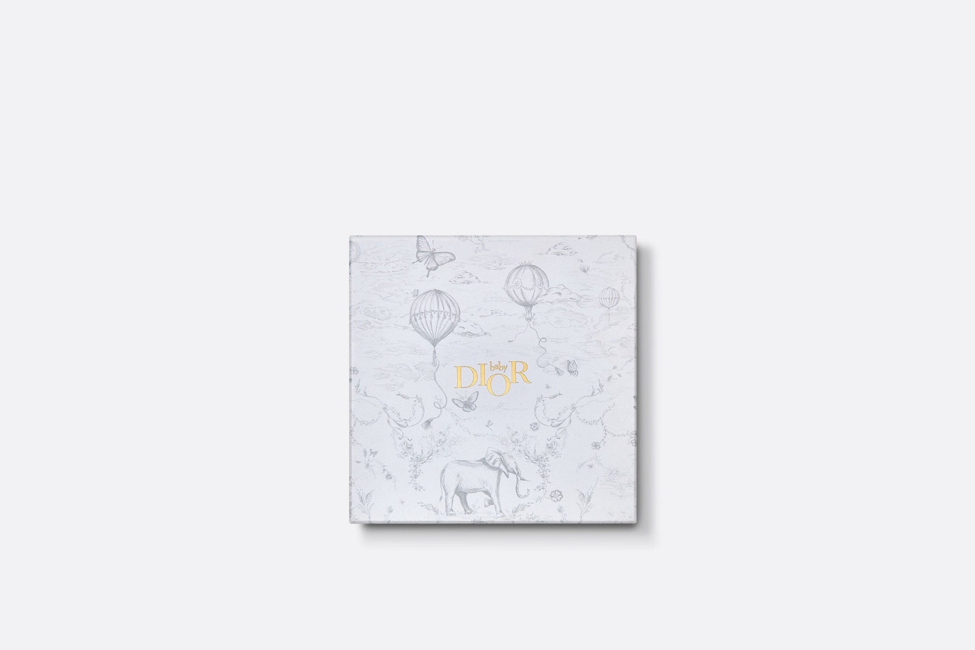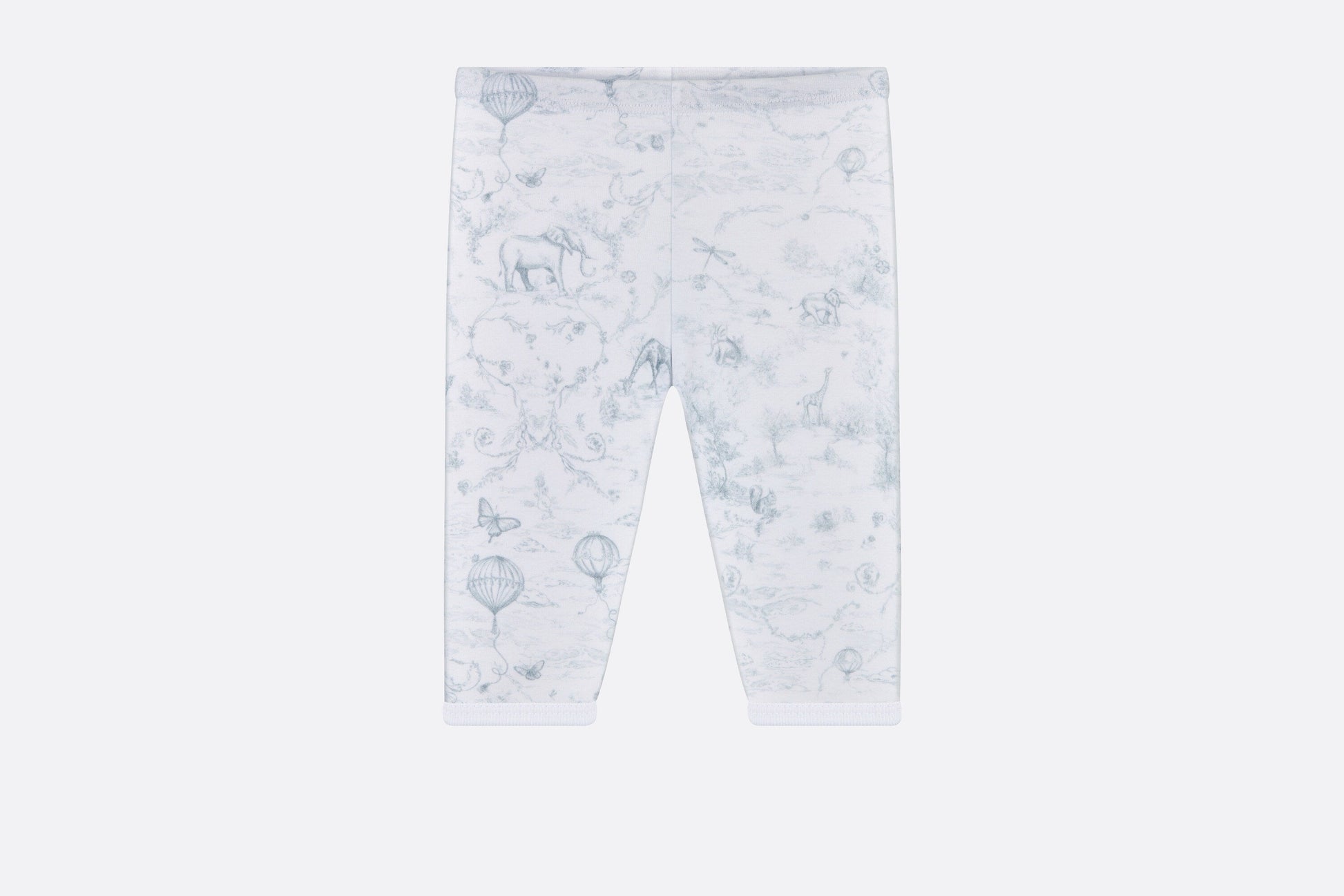 The newborn gift set revisits the House's iconic Toile de Jouy motif in light gray tones. Crafted in all-over printed ivory cotton jersey, the trio is composed of a bear stuffed toy, pants and a long-sleeved T-shirt enhanced by a tonal Dior screenprint. Featuring ribbed details and a stretch waist, the soft set will create an ideal gift for newborns.