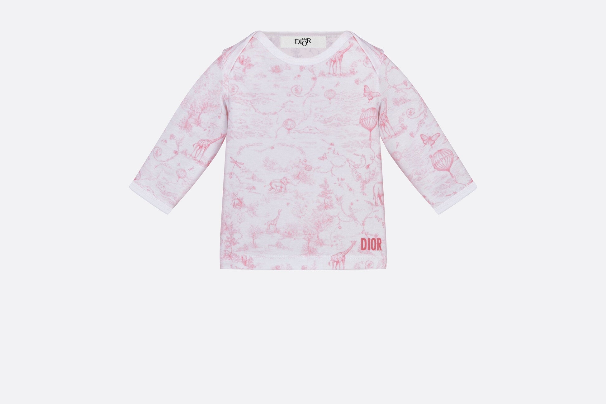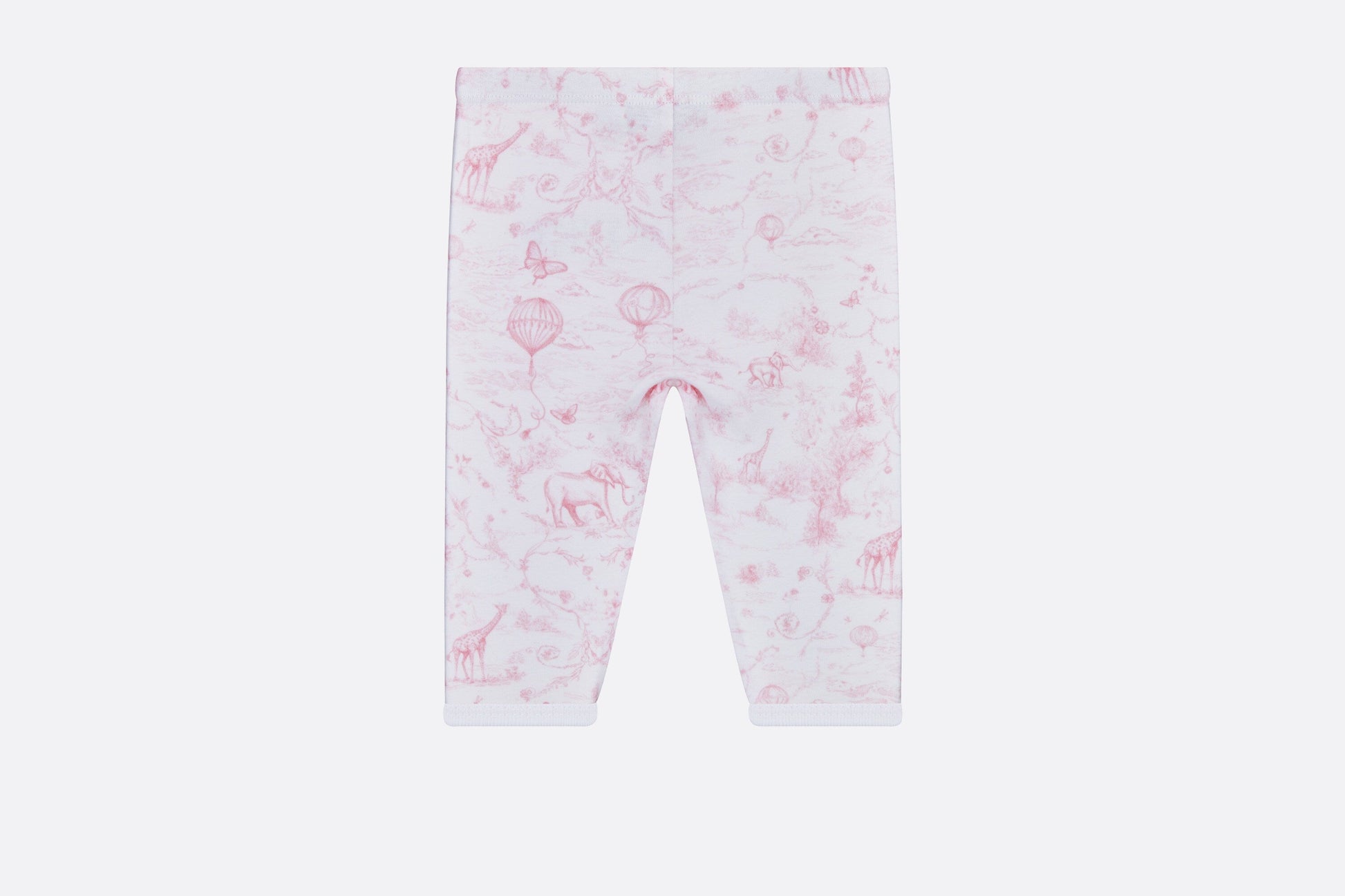 The newborn gift set revisits the House's iconic Toile de Jouy motif in pale pink tones. Crafted in all-over printed ivory cotton jersey, the trio is composed of a bear stuffed toy, pants and a long-sleeved T-shirt enhanced by a tonal Dior screenprint. Featuring ribbed details and a stretch waist, the soft set will create an ideal gift for newborns.