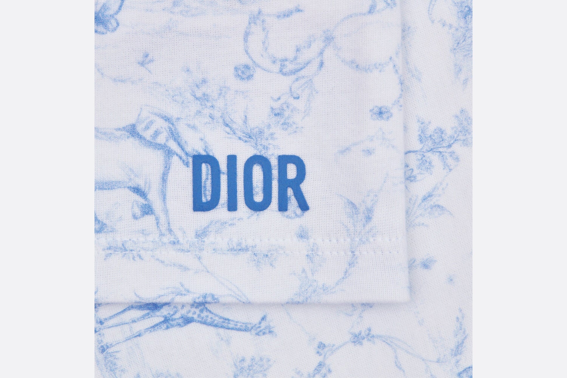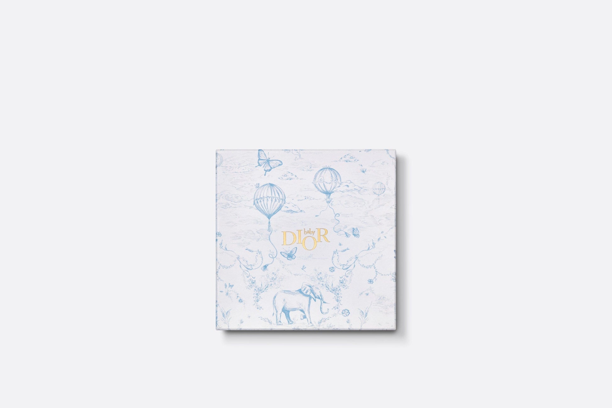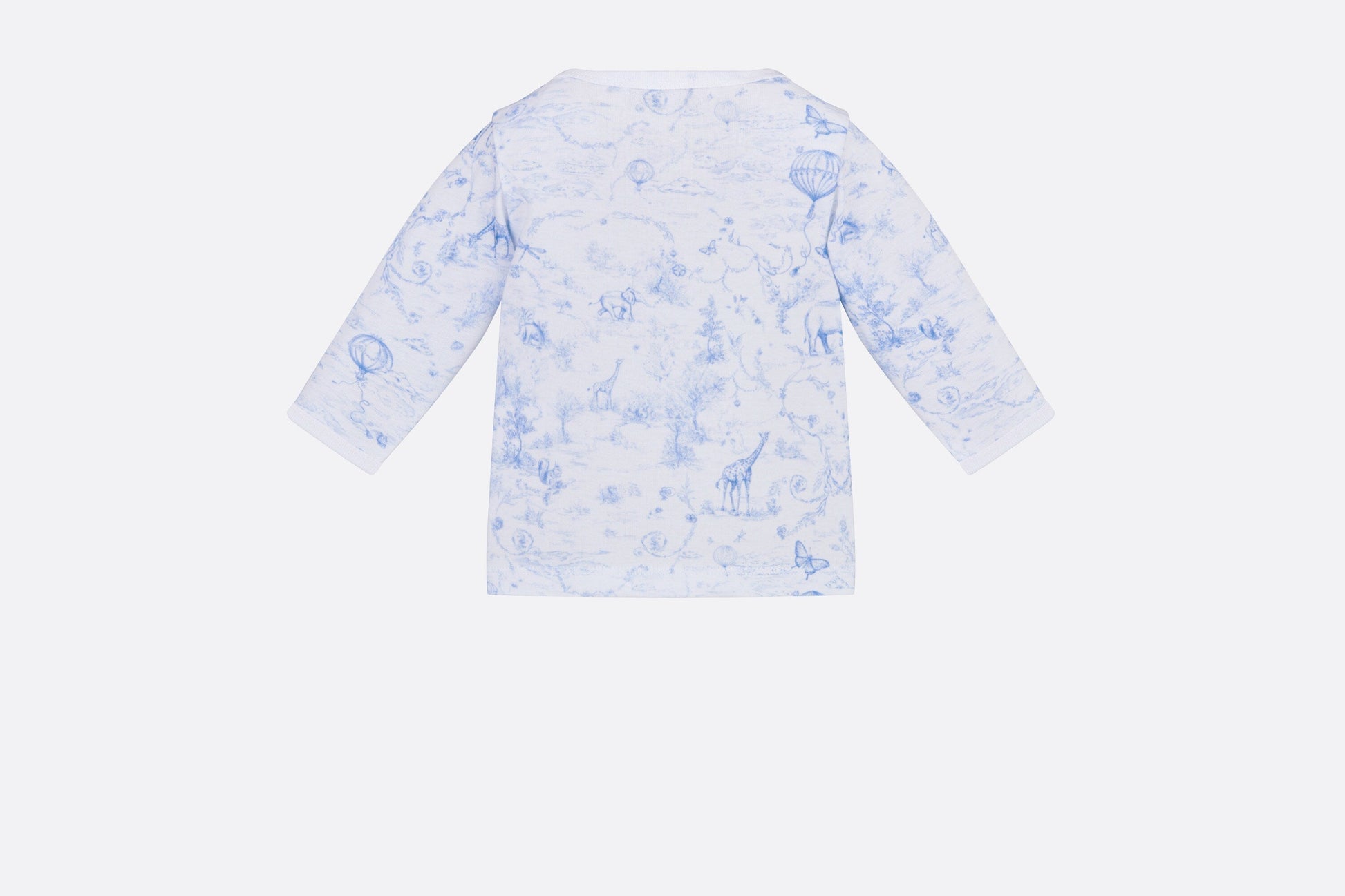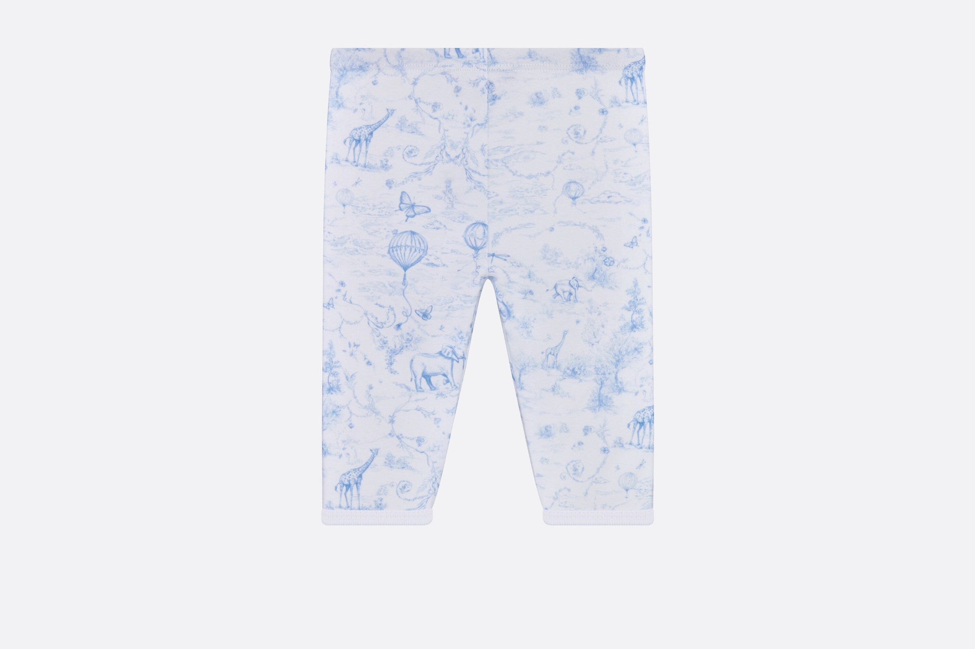 The newborn gift set revisits the House's iconic Toile de Jouy motif in sky blue tones. Crafted in all-over printed ivory cotton jersey, the trio is composed of a bear stuffed toy, pants and a long-sleeved T-shirt enhanced by a tonal Dior screenprint. Featuring ribbed details and a stretch waist, the soft set will create an ideal gift for newborns.