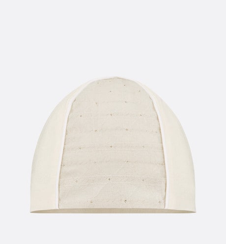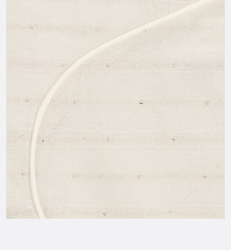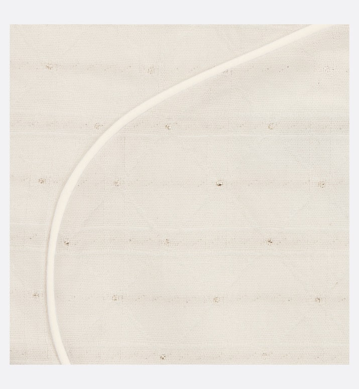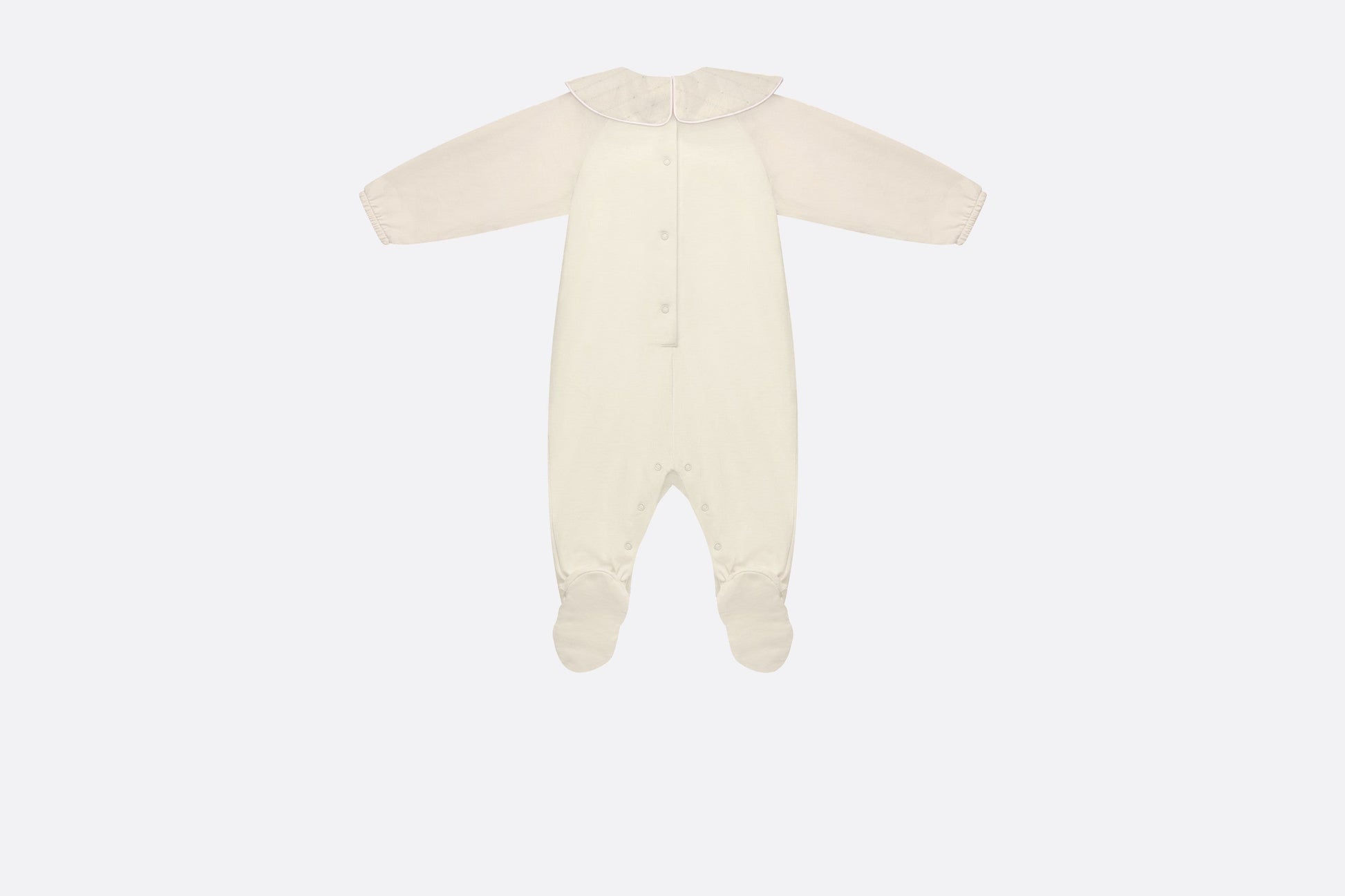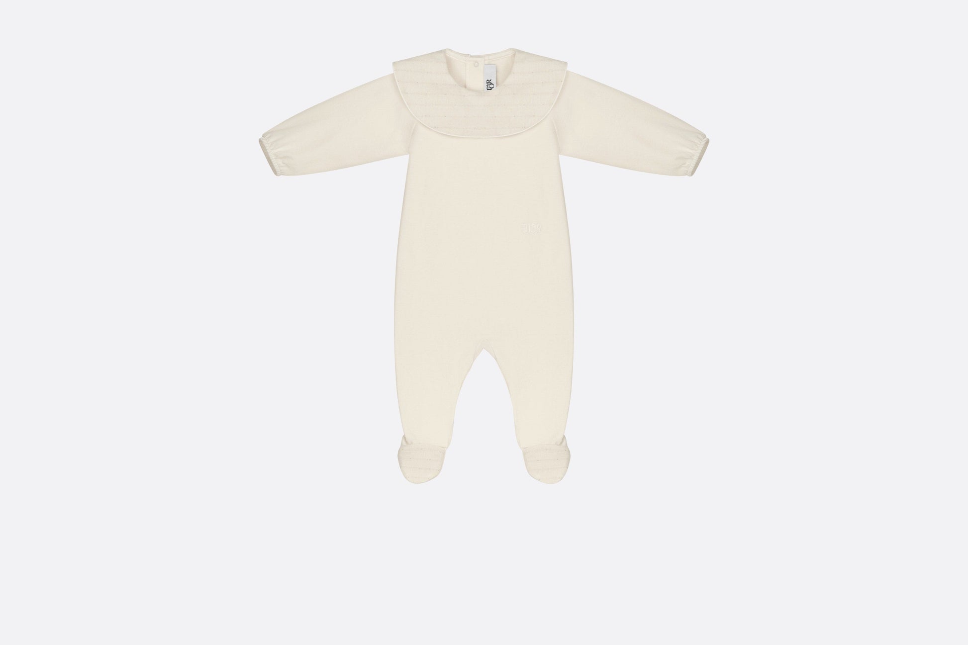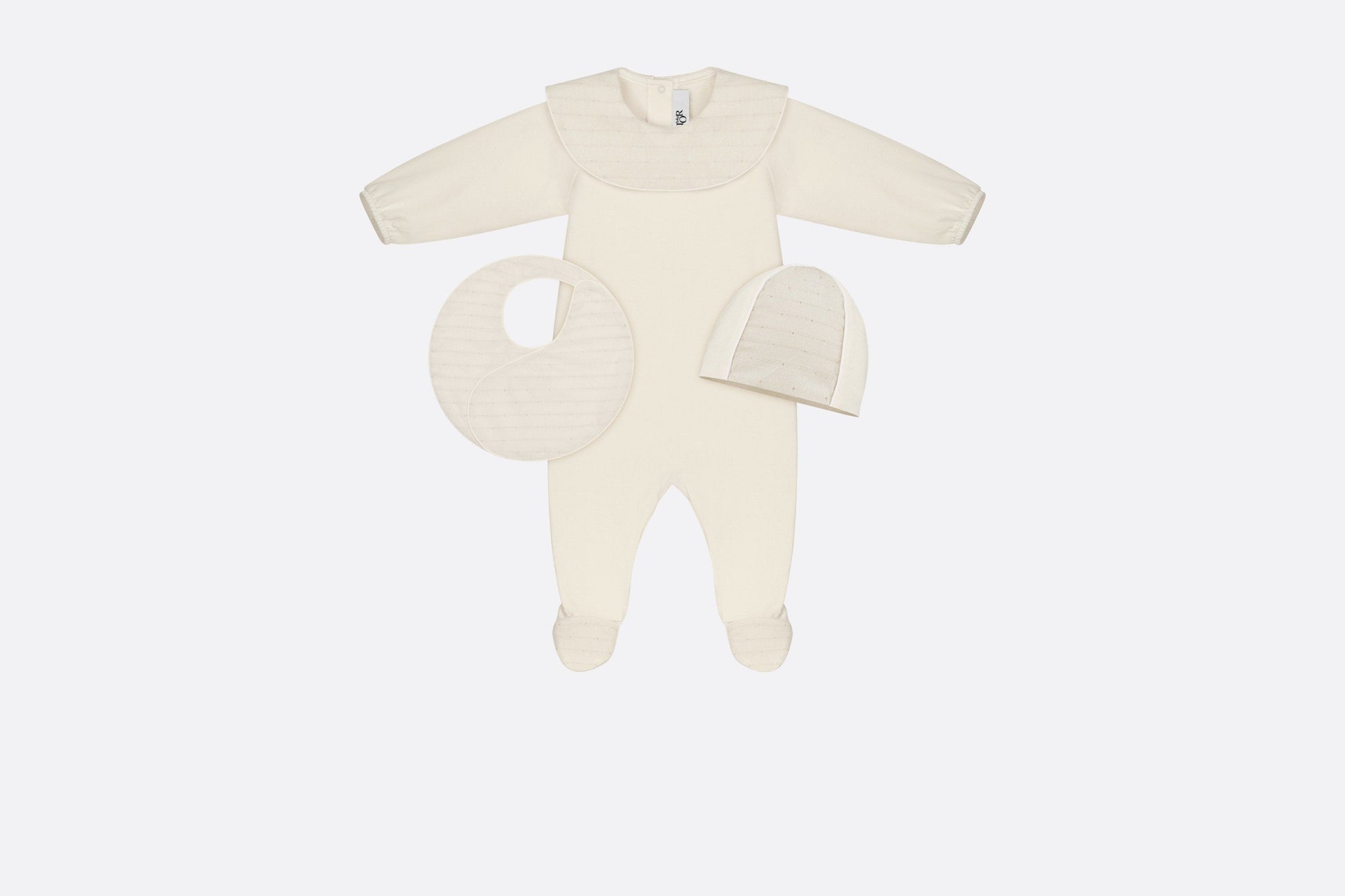 This season, the timeless newborn gift set is revisited with soft, round forms inspired by a pebble. Consisting of pajamas, a bib and a beanie, it showcases the House's hallmark Cannage motif in gold-tone metallic thread. Crafted in ivory jersey and cotton voile embellished with snap buttons for easy dressing, the pajamas feature a ruffled collar, as well as a tonal Dior embroidery on the front. A true ode to comfort, this gift set will make an iconic and precious newborn gift.
