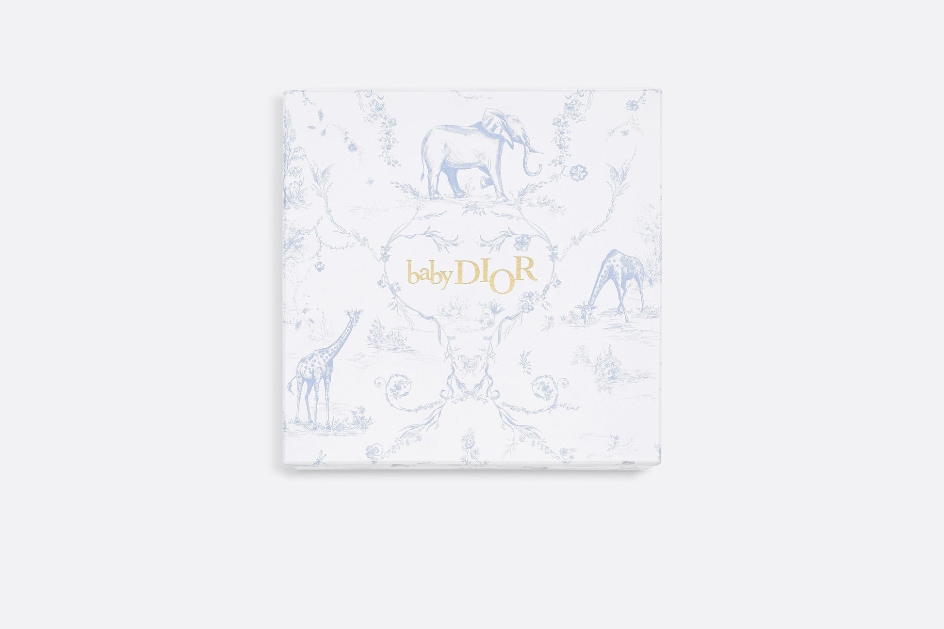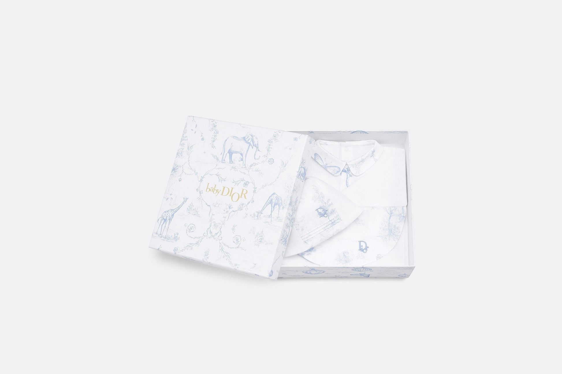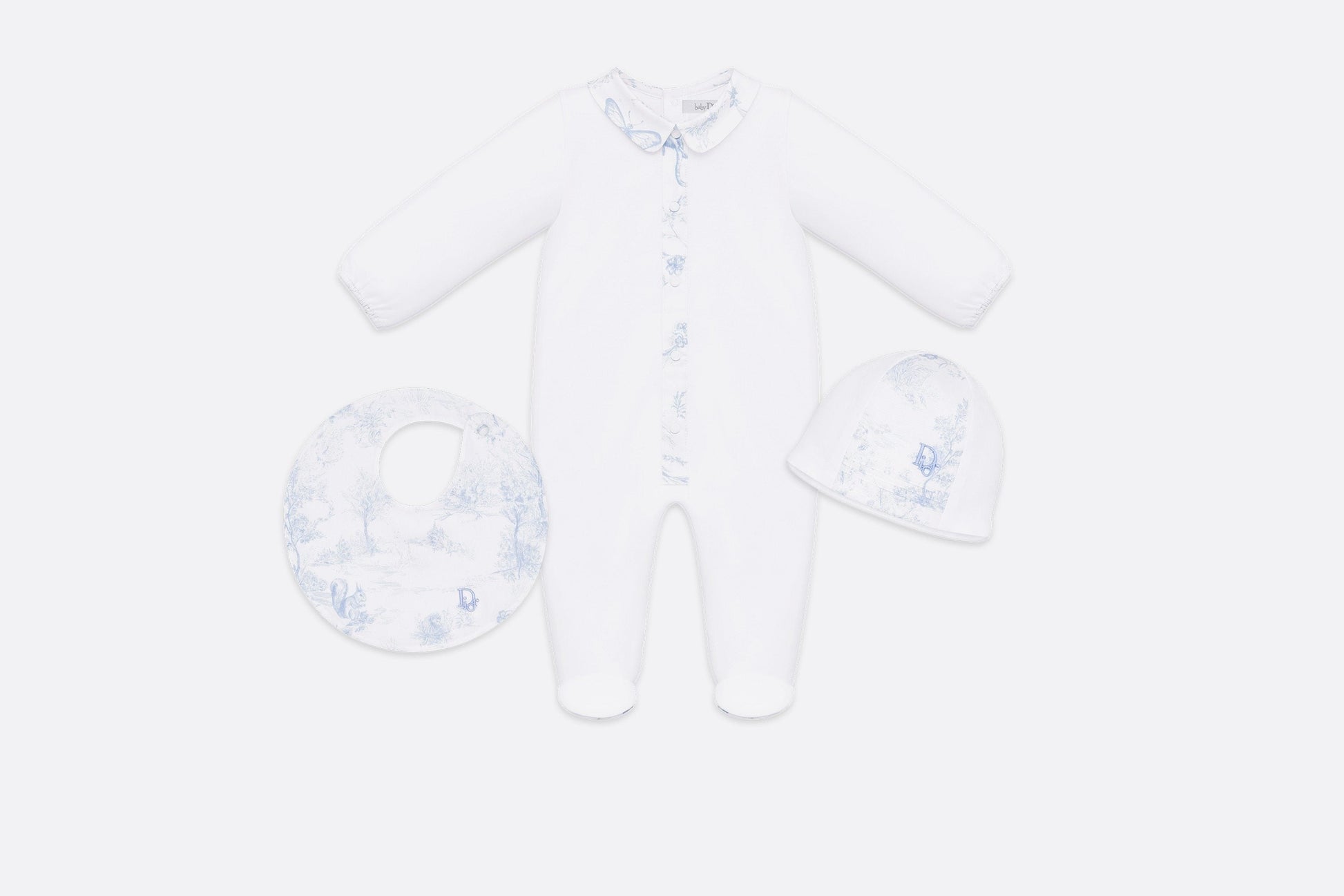 New-born gift set consisting of pyjamas, bib and bonnet in cotton satin with light blue ‘Toile de Jouy’ print and white cotton interlock, with light blue ‘Dior Oblique’ embroidery.
