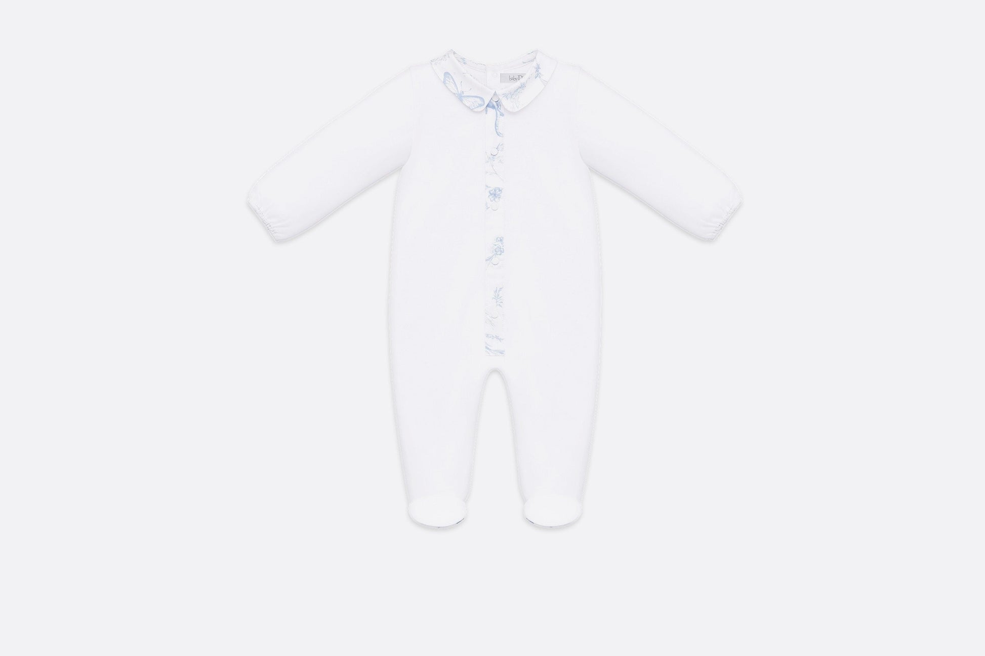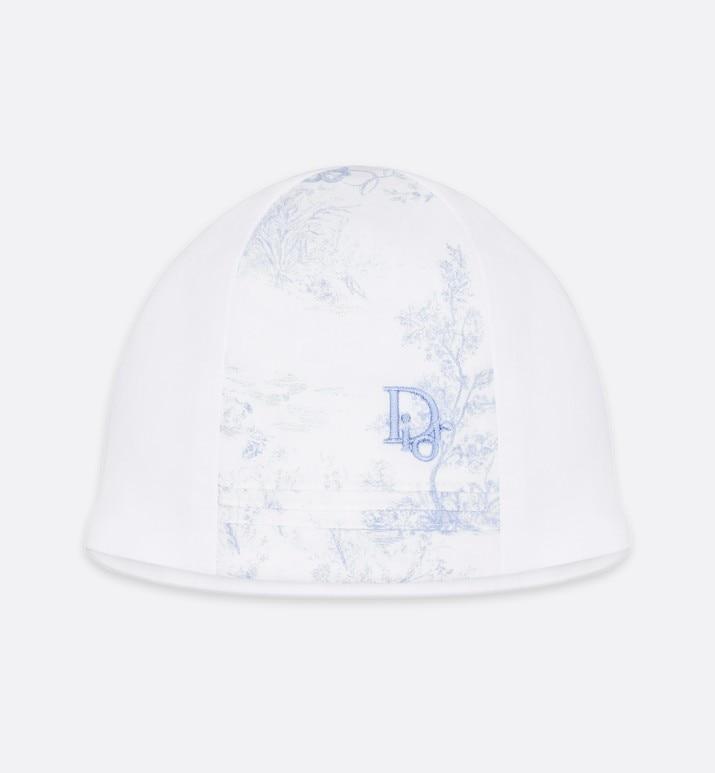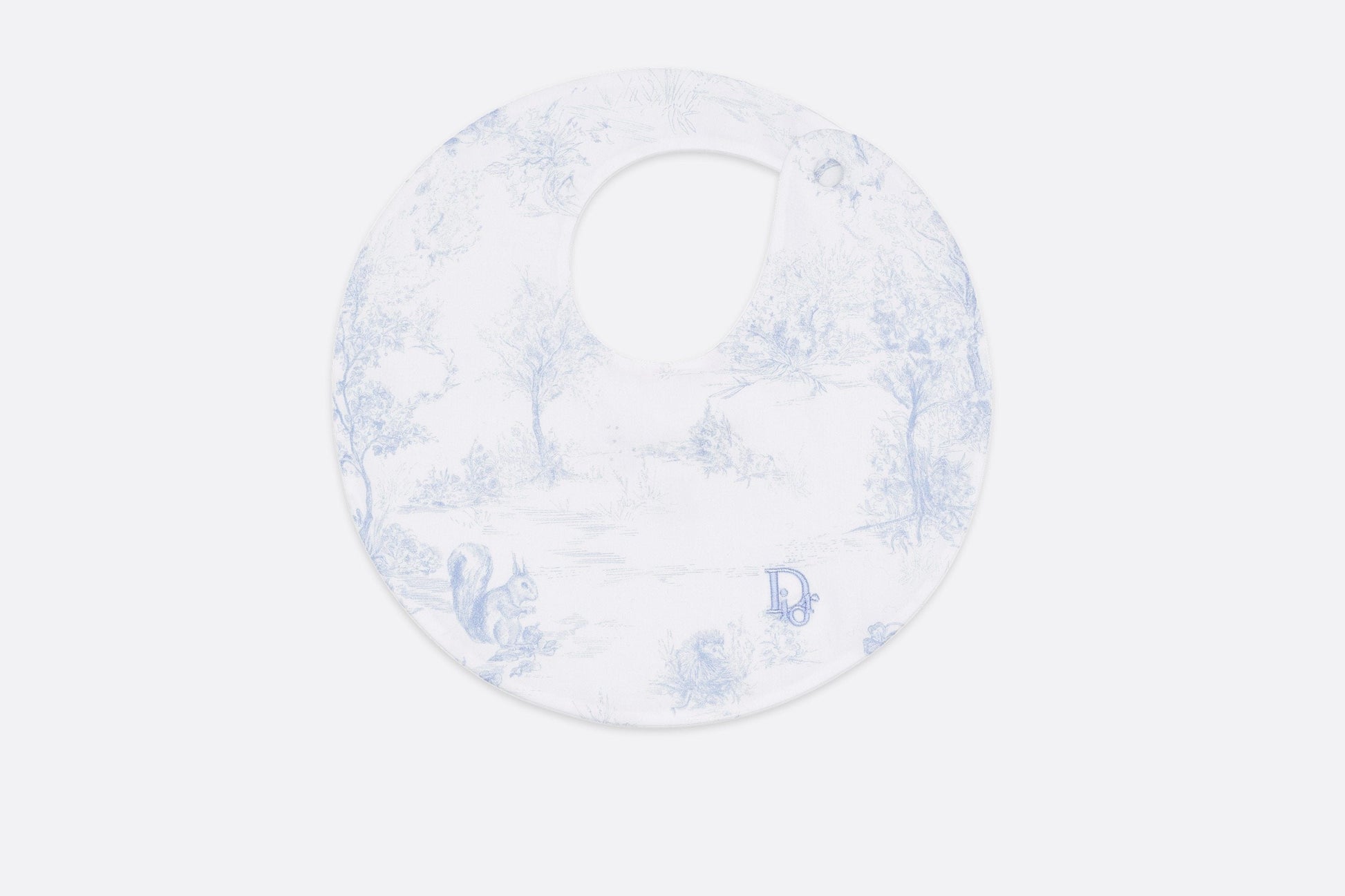 New-born gift set consisting of pyjamas, bib and bonnet in cotton satin with light blue ‘Toile de Jouy’ print and white cotton interlock, with light blue ‘Dior Oblique’ embroidery.