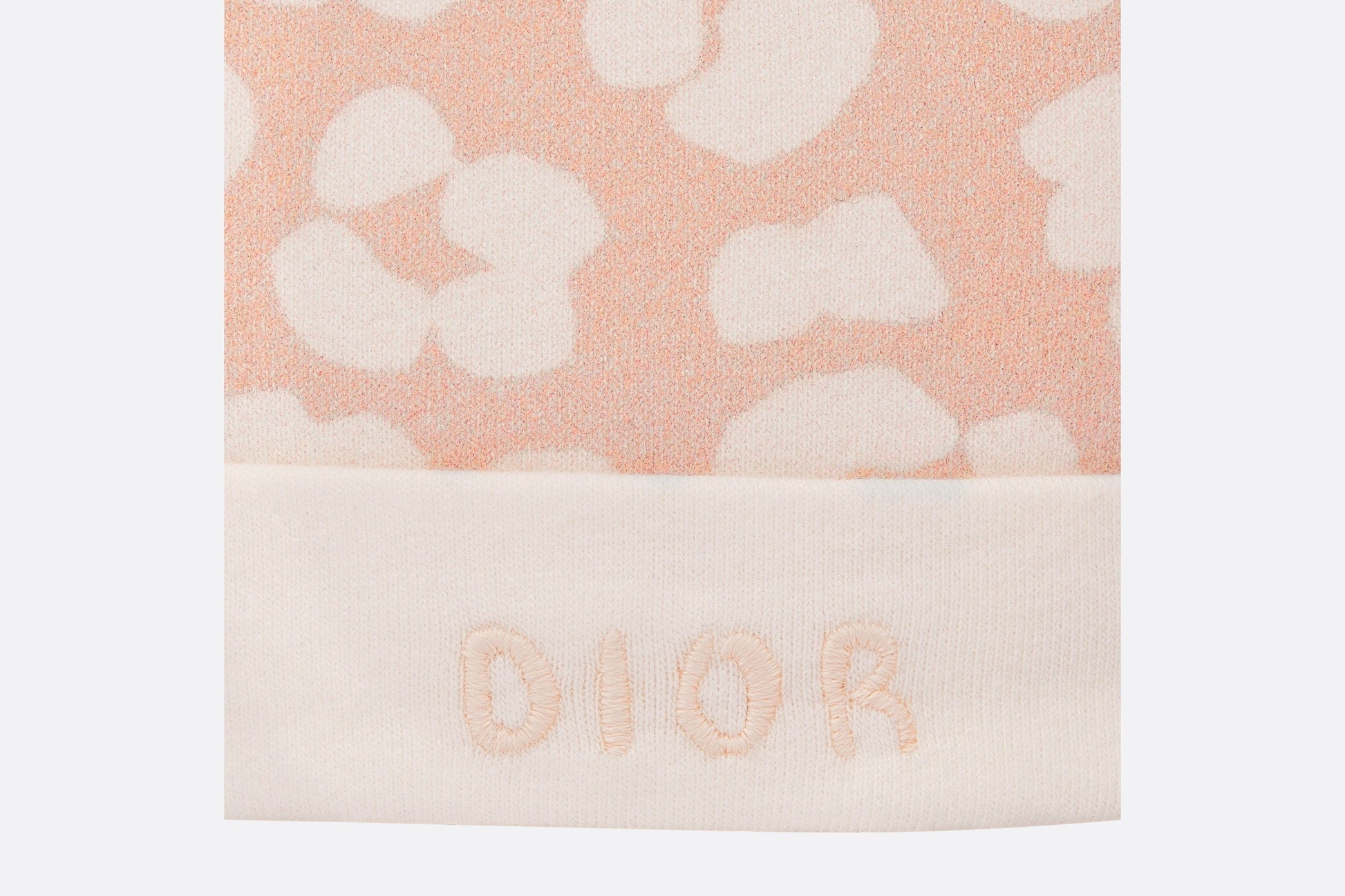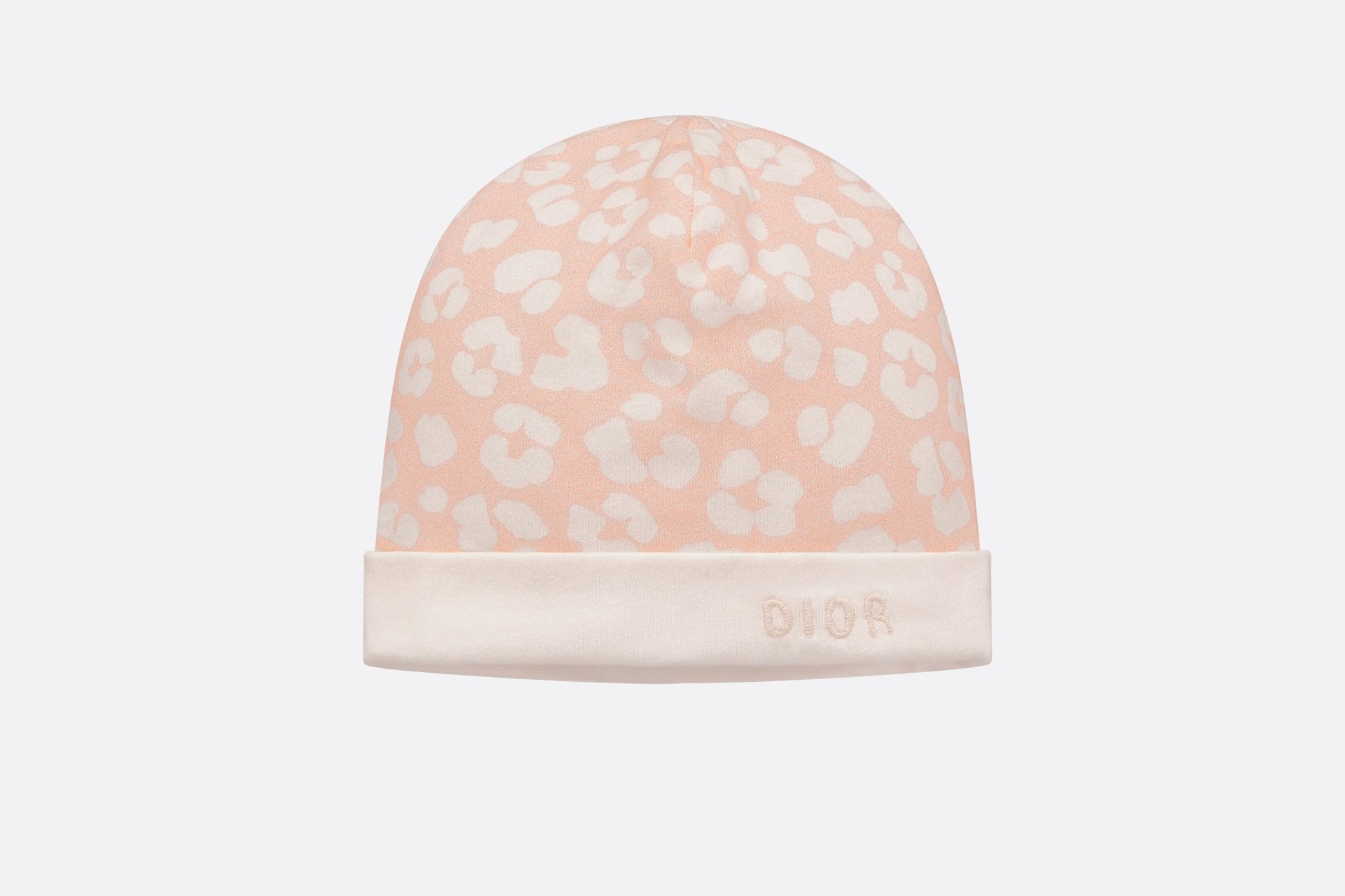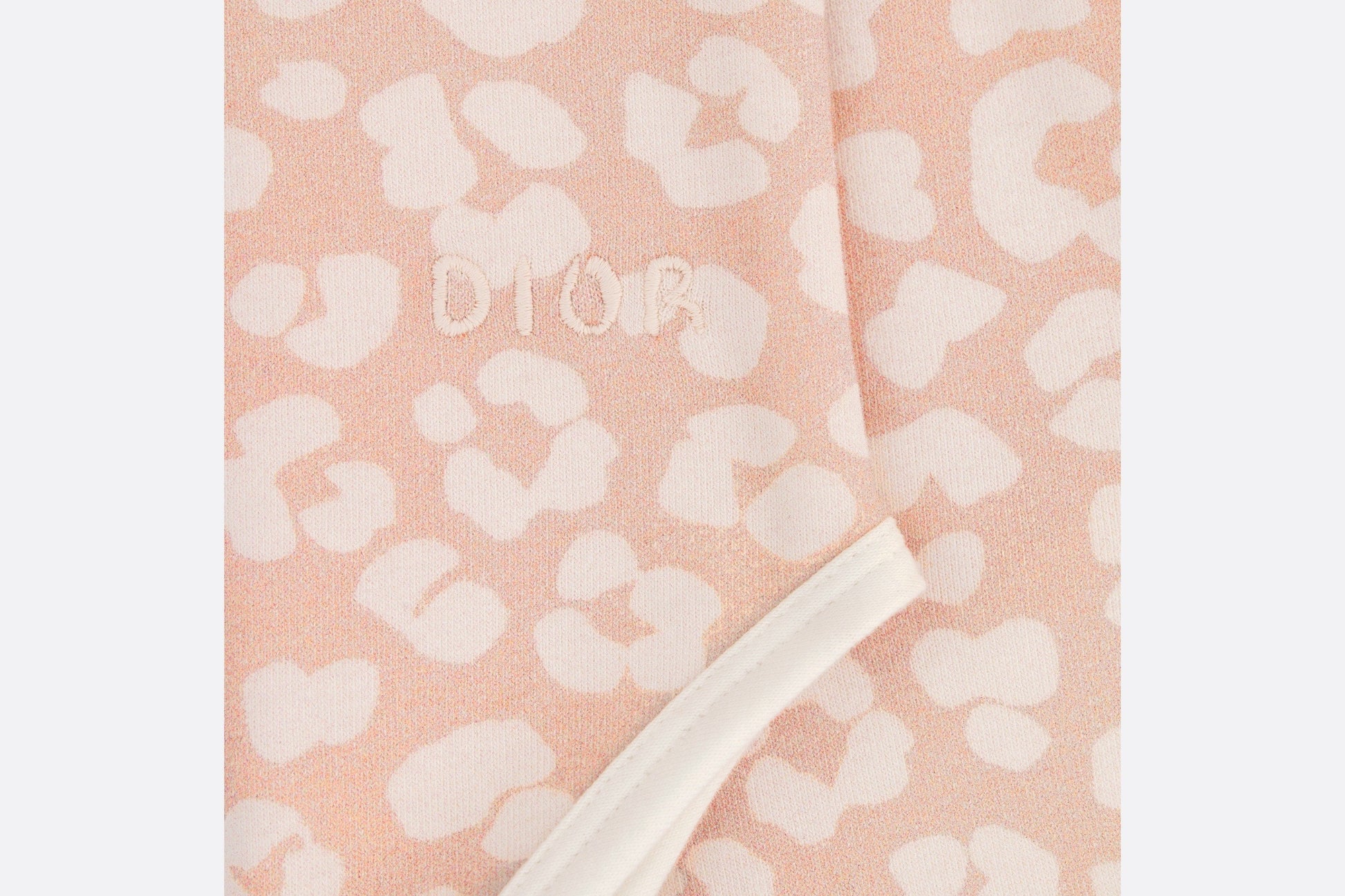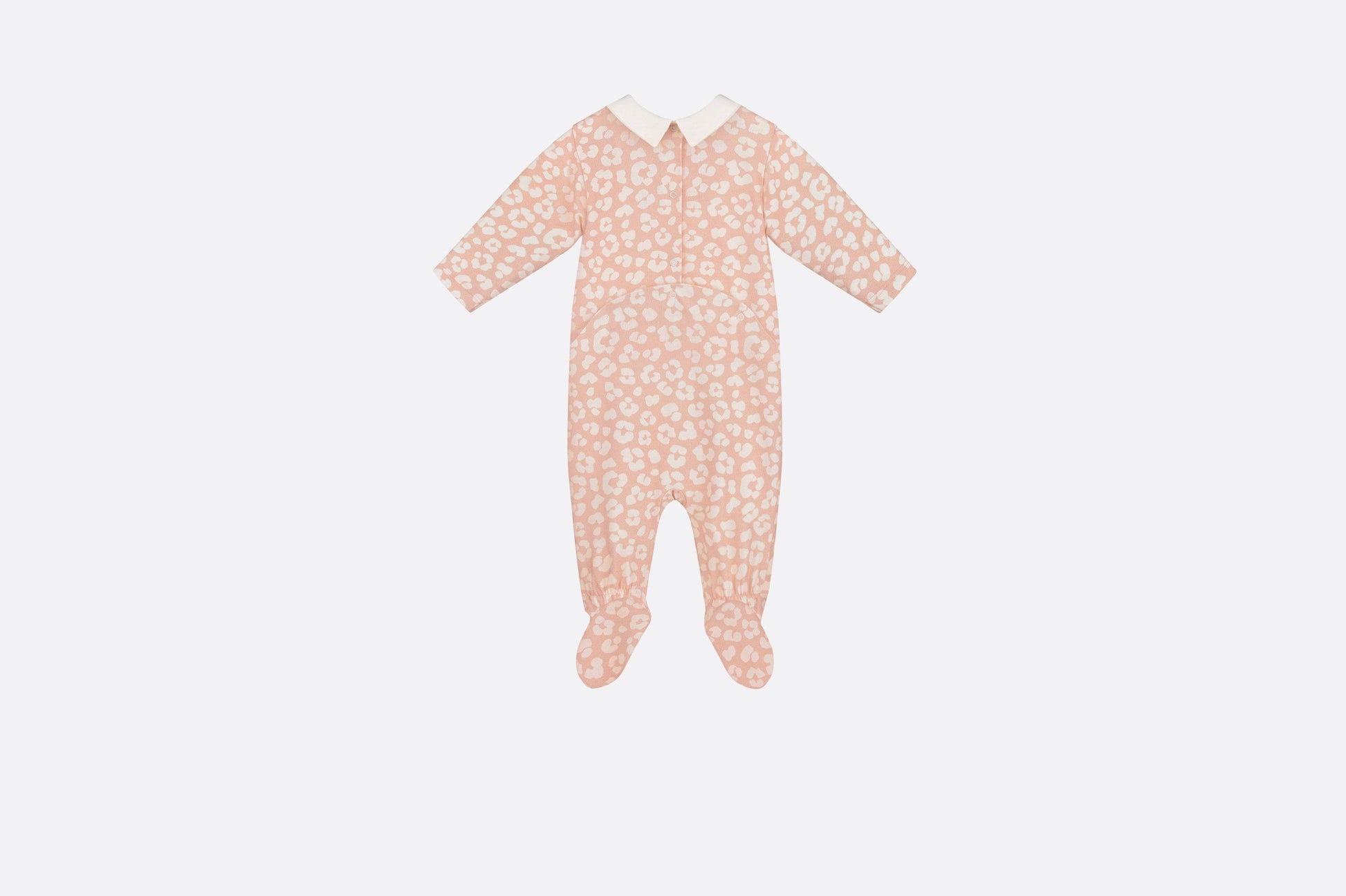 The newborn gift set honors House heritage with a graphic leopard motif. Crafted in pink cotton jersey with an all-over pale pink print, the set is composed of a long-sleeved onesie, pajamas and a beanie. Enhanced by a snap placket for easy dressing, the pajamas and onesie are completed with an ivory spread collar for a chic touch. Adorned with a pale pink revisited Dior embroidery and leopard spots on each piece, the soft set will make an ideal gift for newborns.