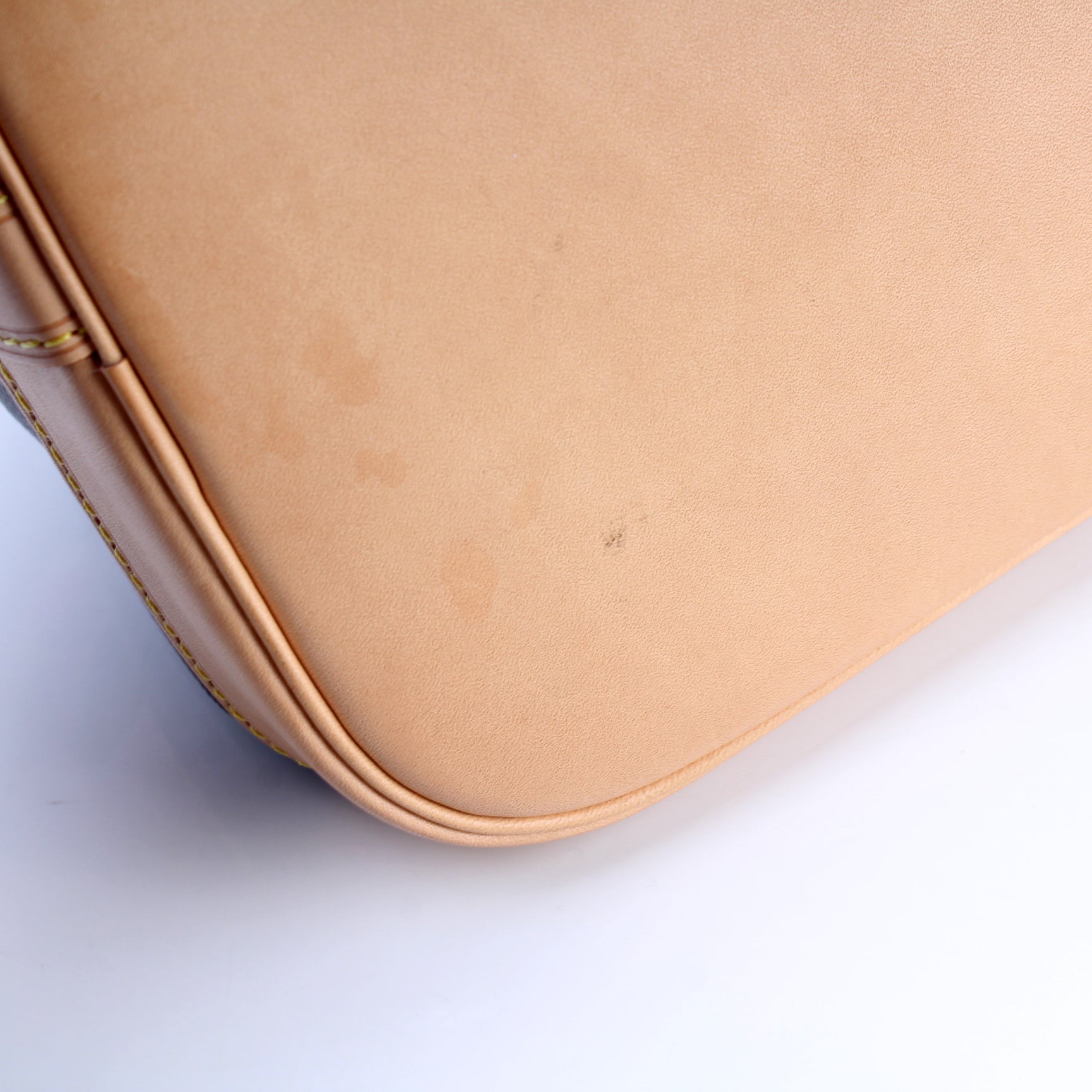 Exterior: The exterior coated canvas is free of any rips or cracks. The leather base shows minor discoloration.