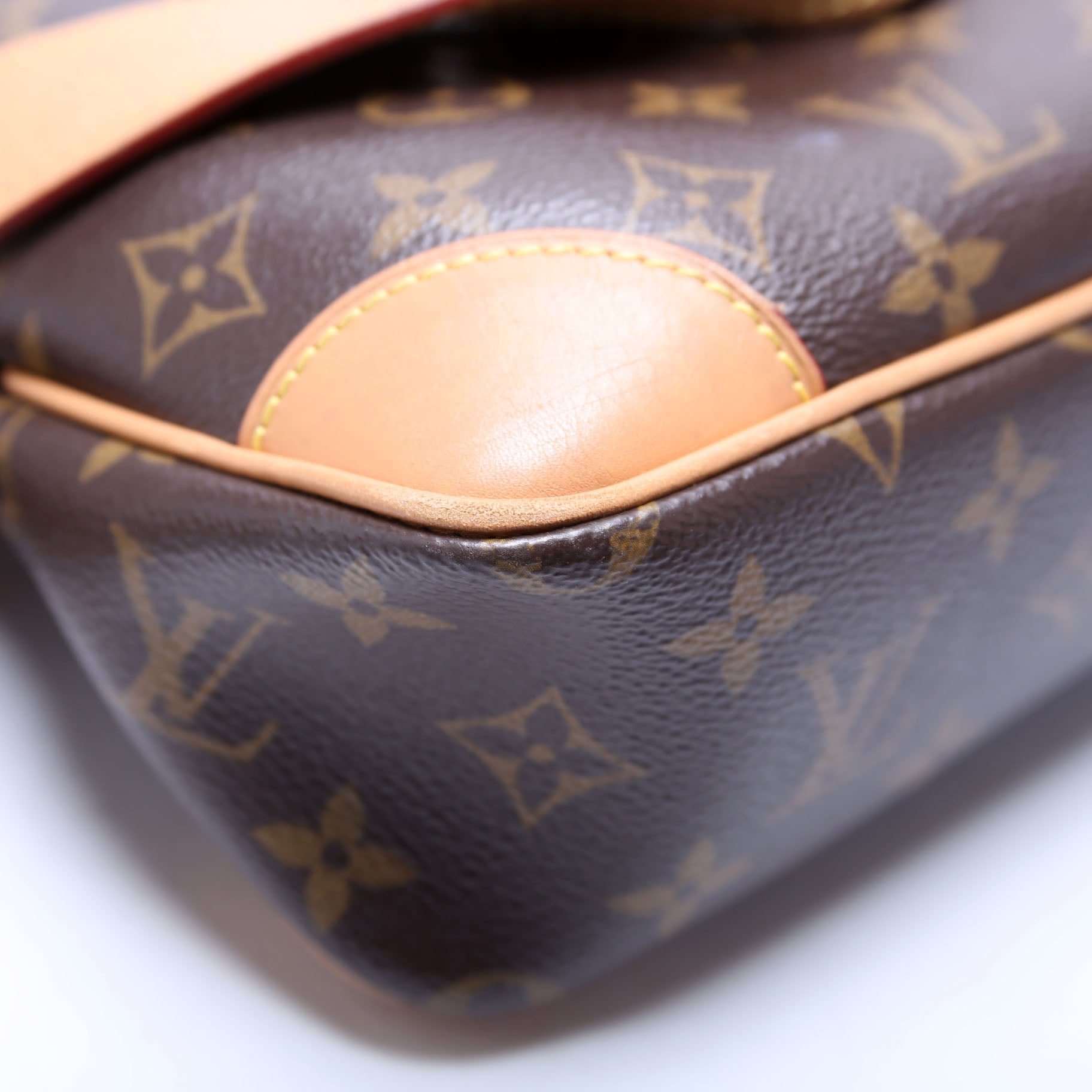 Exterior: The exterior Monogram coated canvas is free of any rips or cracks. The canvas shows minor fading throughout. The leather shows wear and discoloration throughout. The corners show wear and rubbing. The exterior features one magnetic closure pocket.