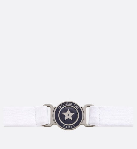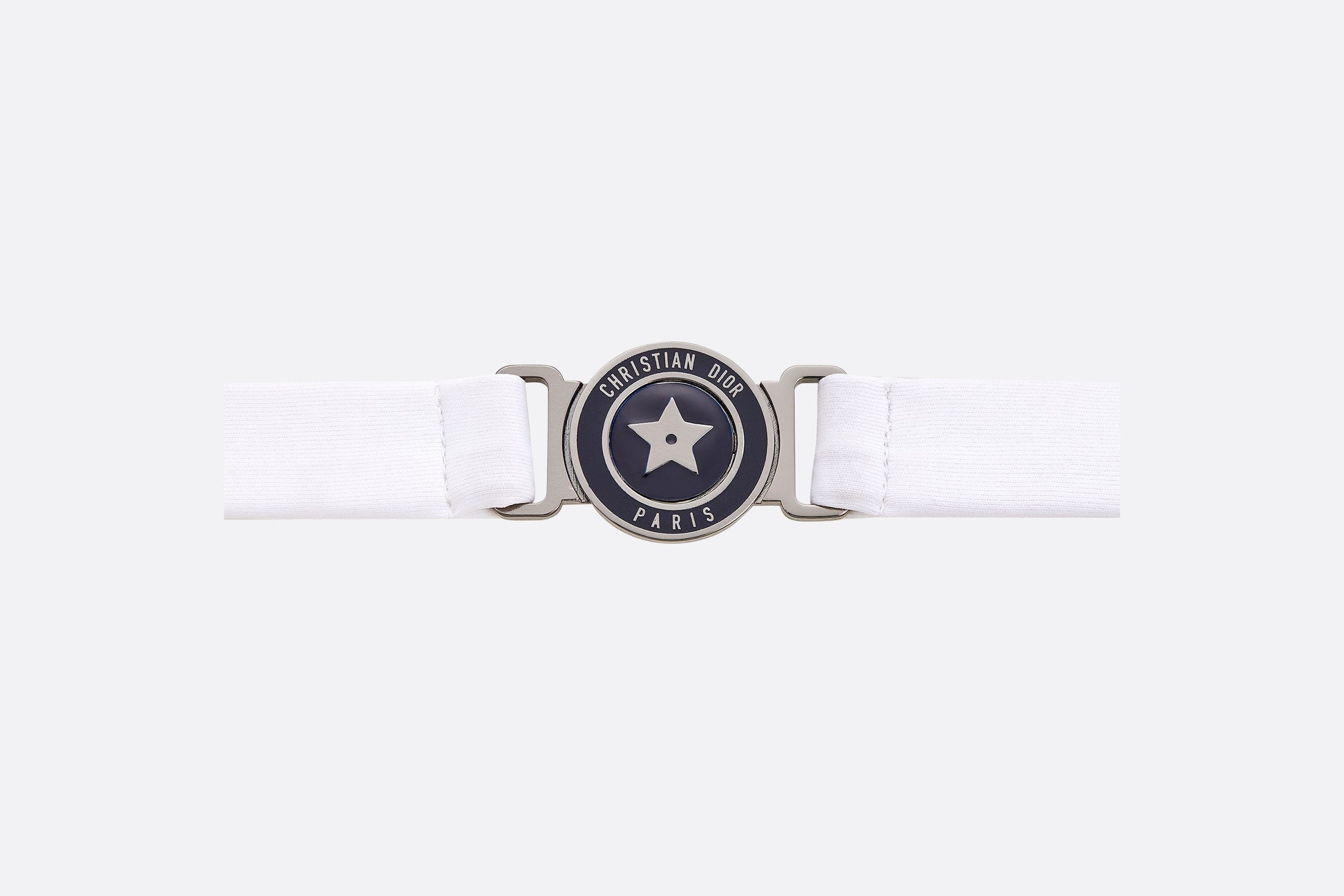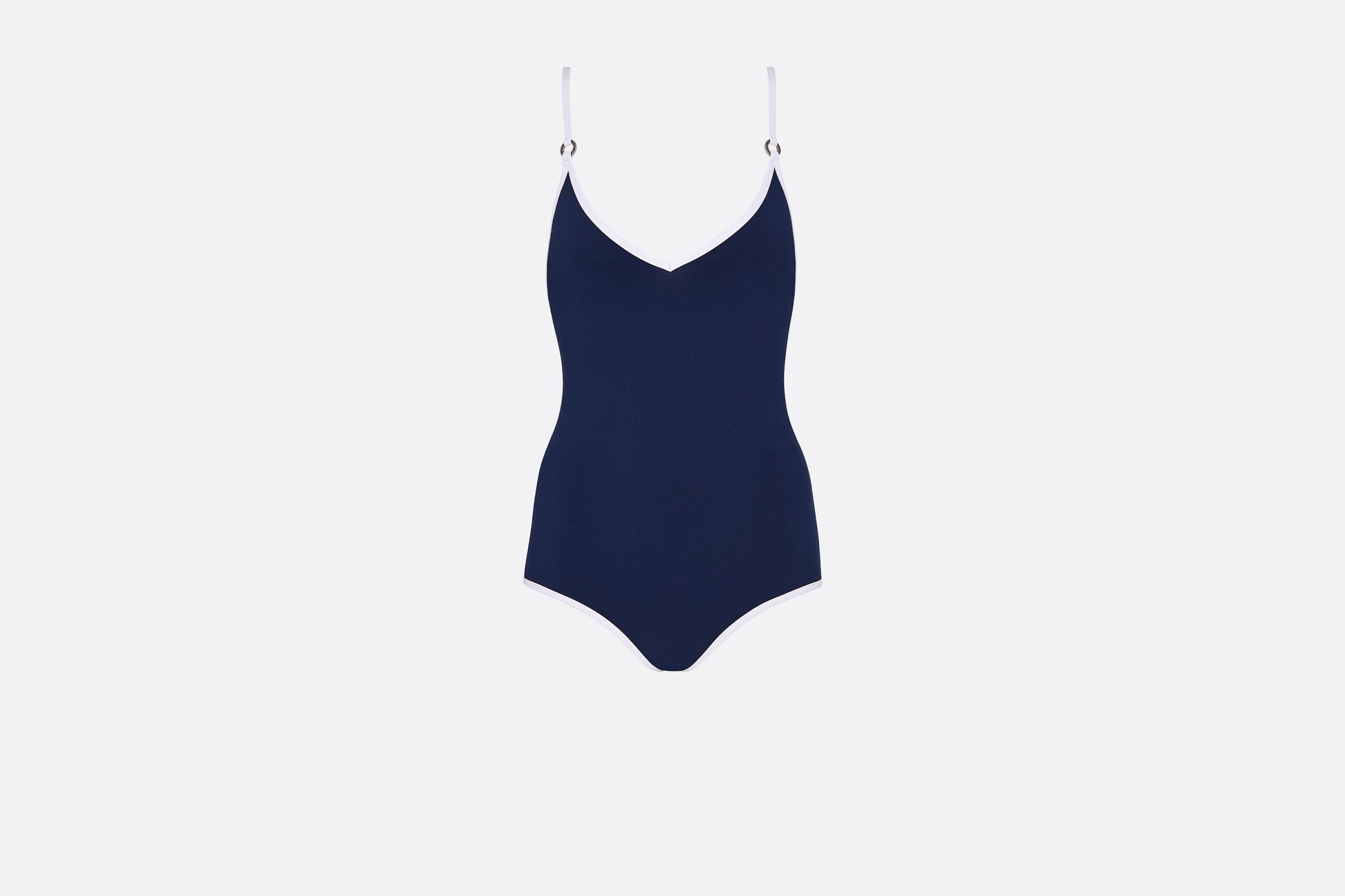 The one-piece swimsuit celebrates the House's timeless codes of elegance. Crafted in blue technical fabric with contrasting edges, it features a V-neck with thin straps that reveal a metal ring. The swimsuit may be worn with a Dior sarong to complete an elegant look.