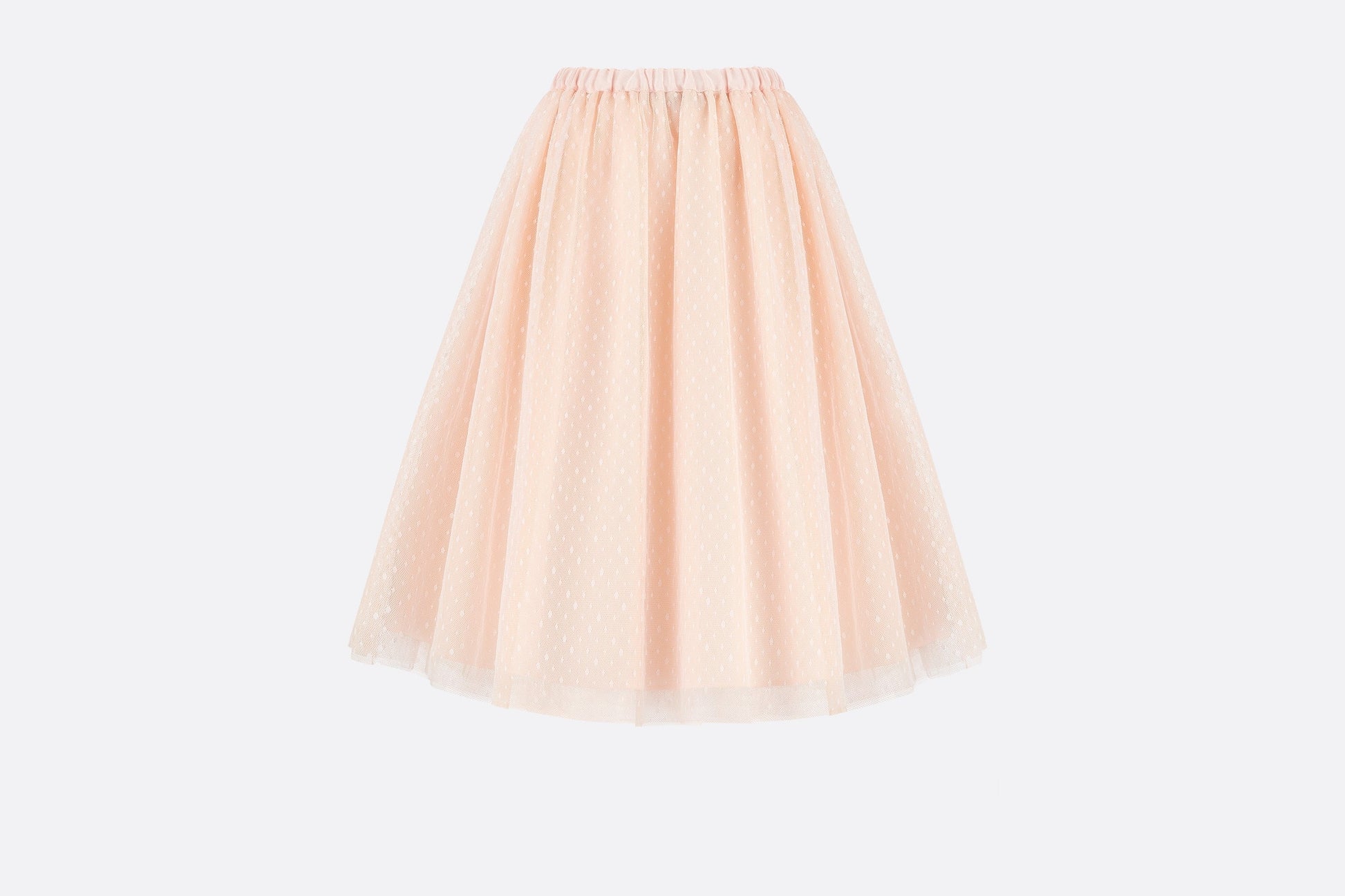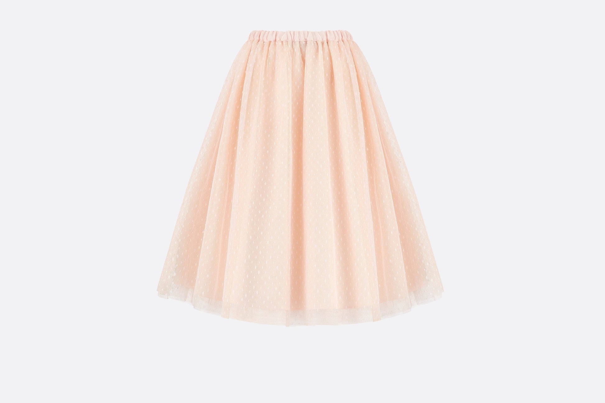 The long skirt is created from gently pleated pale pink polka dot plumetis tulle. It skims the ankles and is fully lined with an underskirt of tonal cotton chiffon. Elegant finishings include an elasticated waistband of grosgrain ribbon and a subtly embroidered 'DIOR' signature at the hem. This skirt can be paired with a blouse and the Miss B ballerinas for a special occasion.