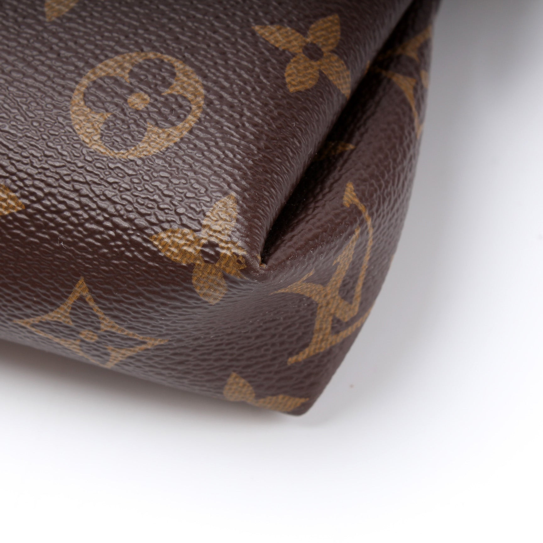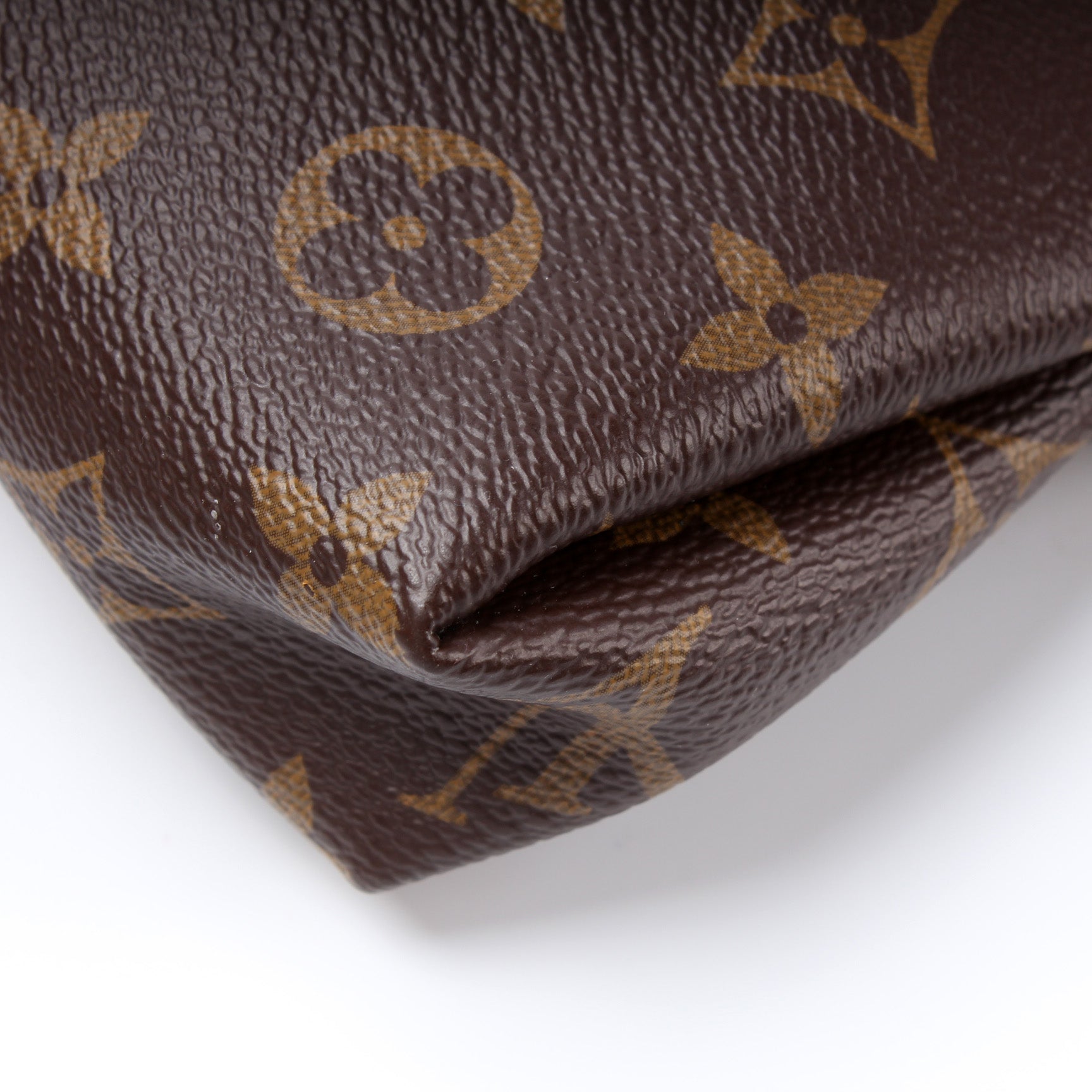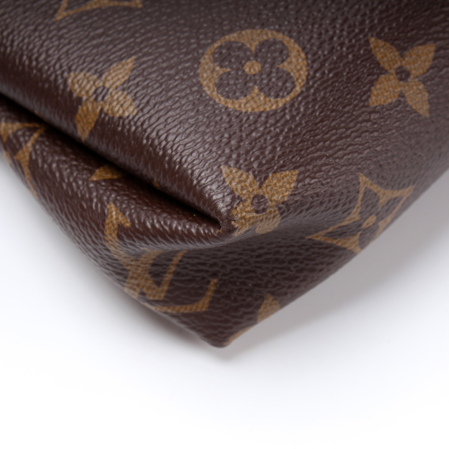 Exterior: The exterior coated canvas is free of any rips or cracks. The corners have light rubbing. The pipping has minor signs of wear. The exterior features one open pocket.