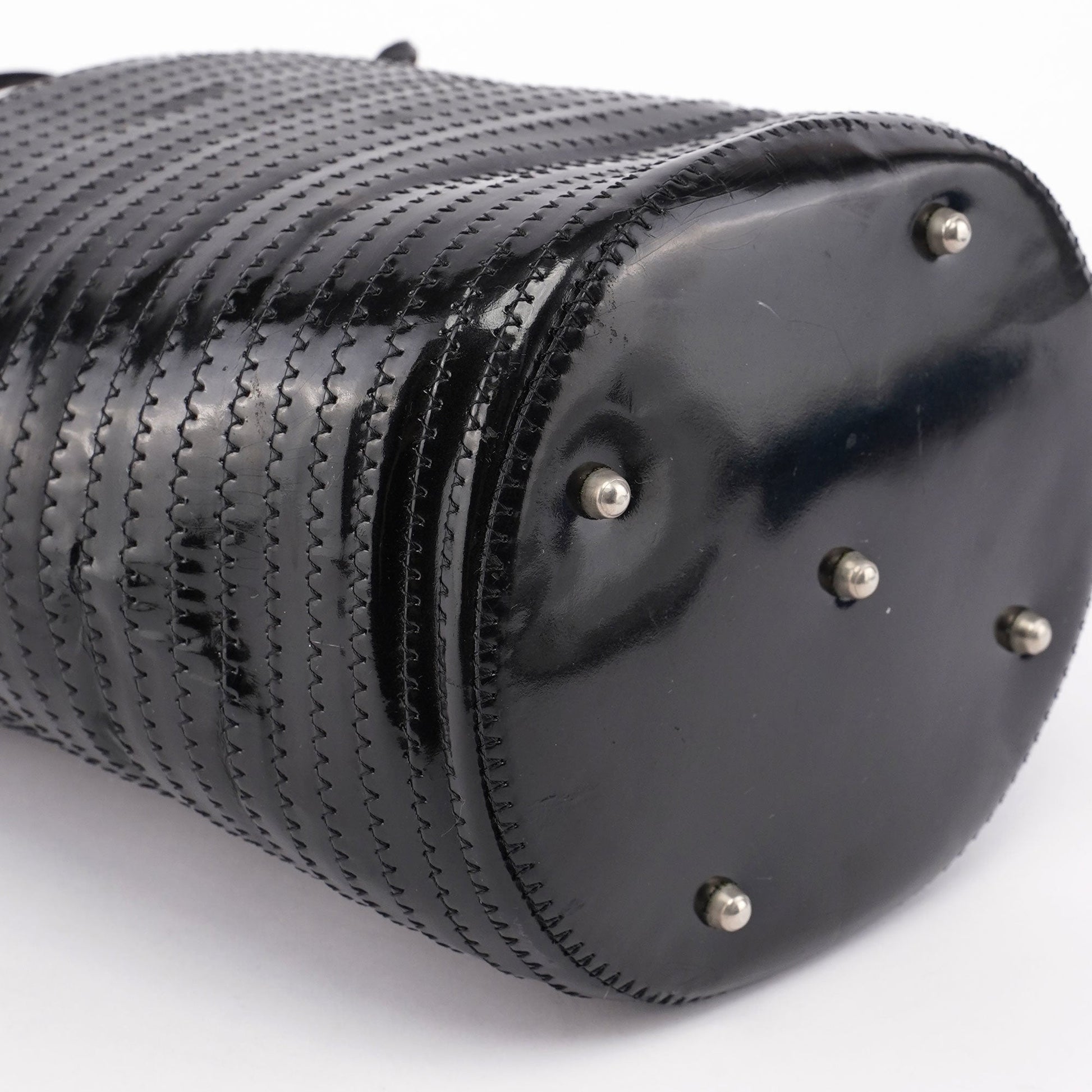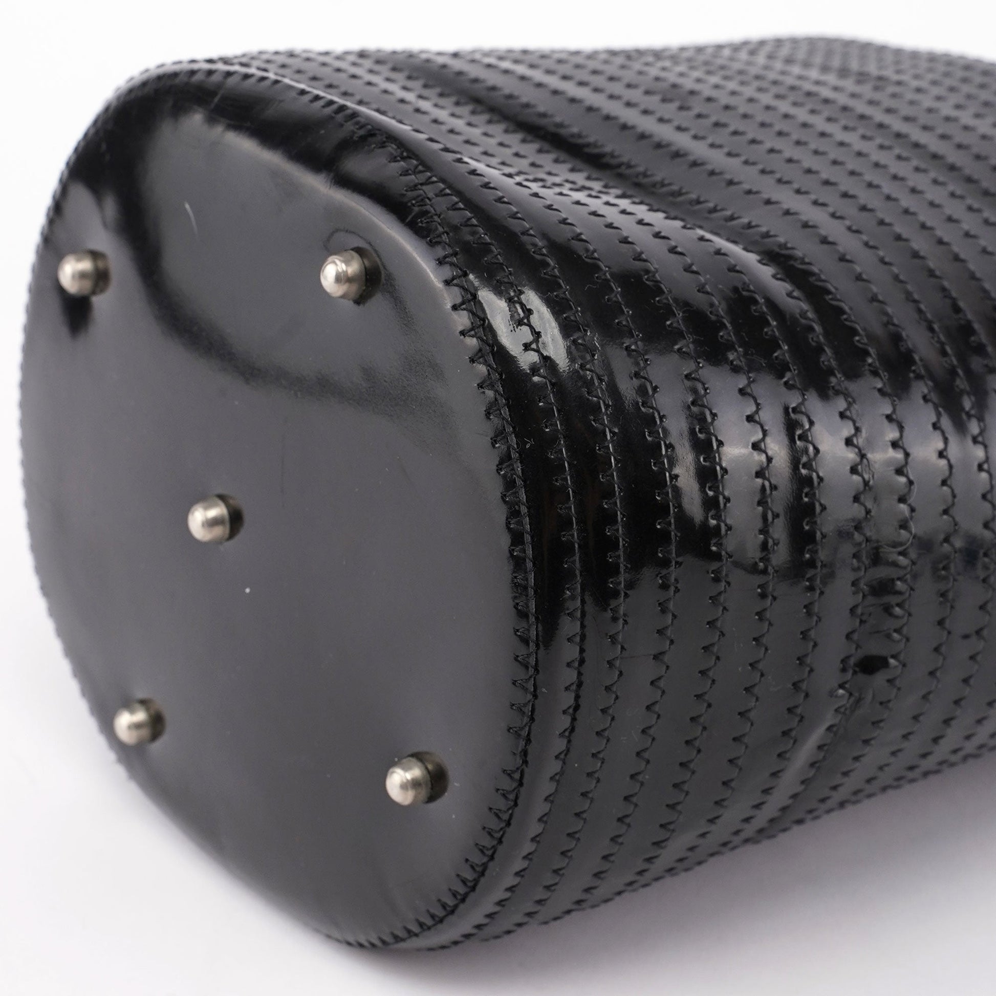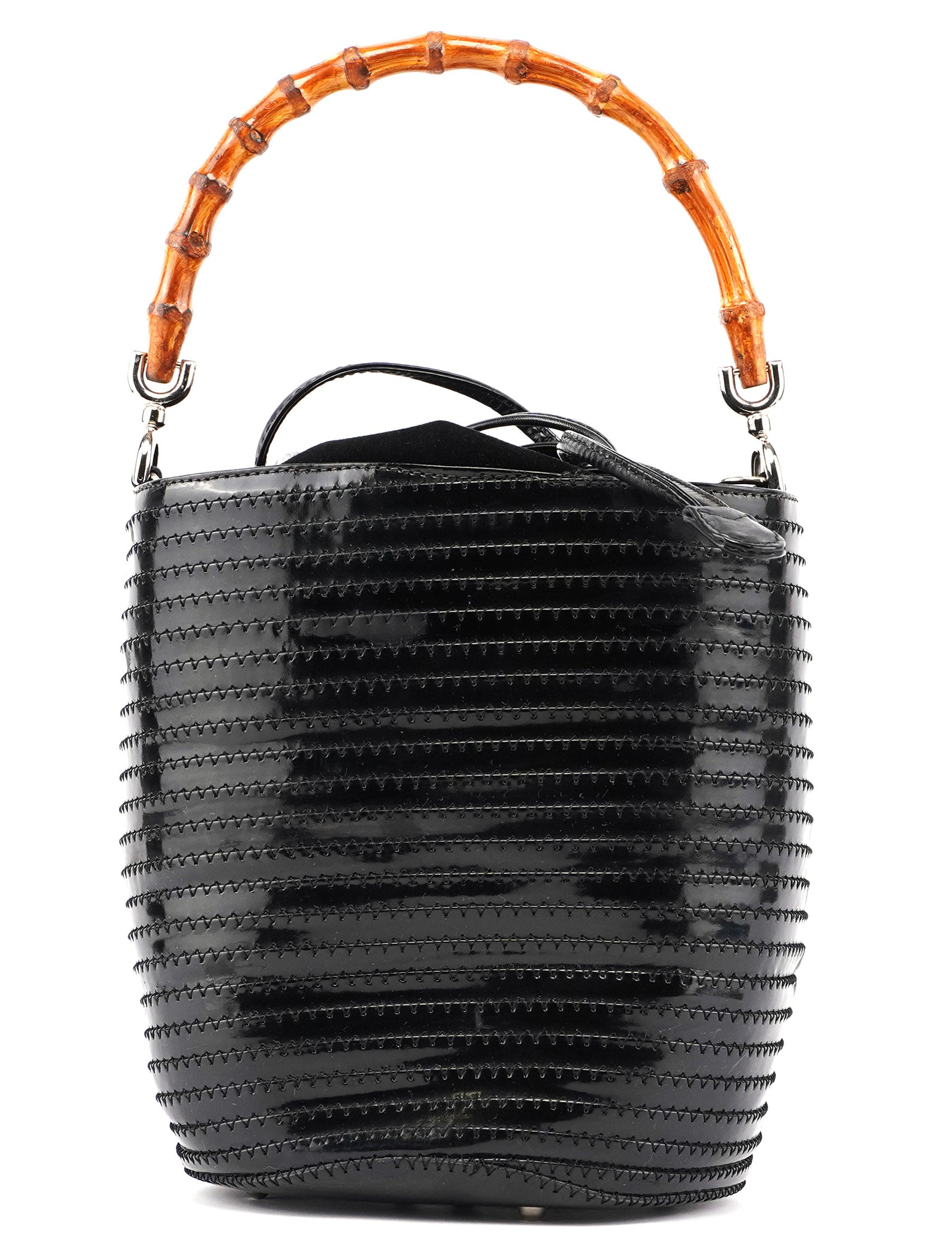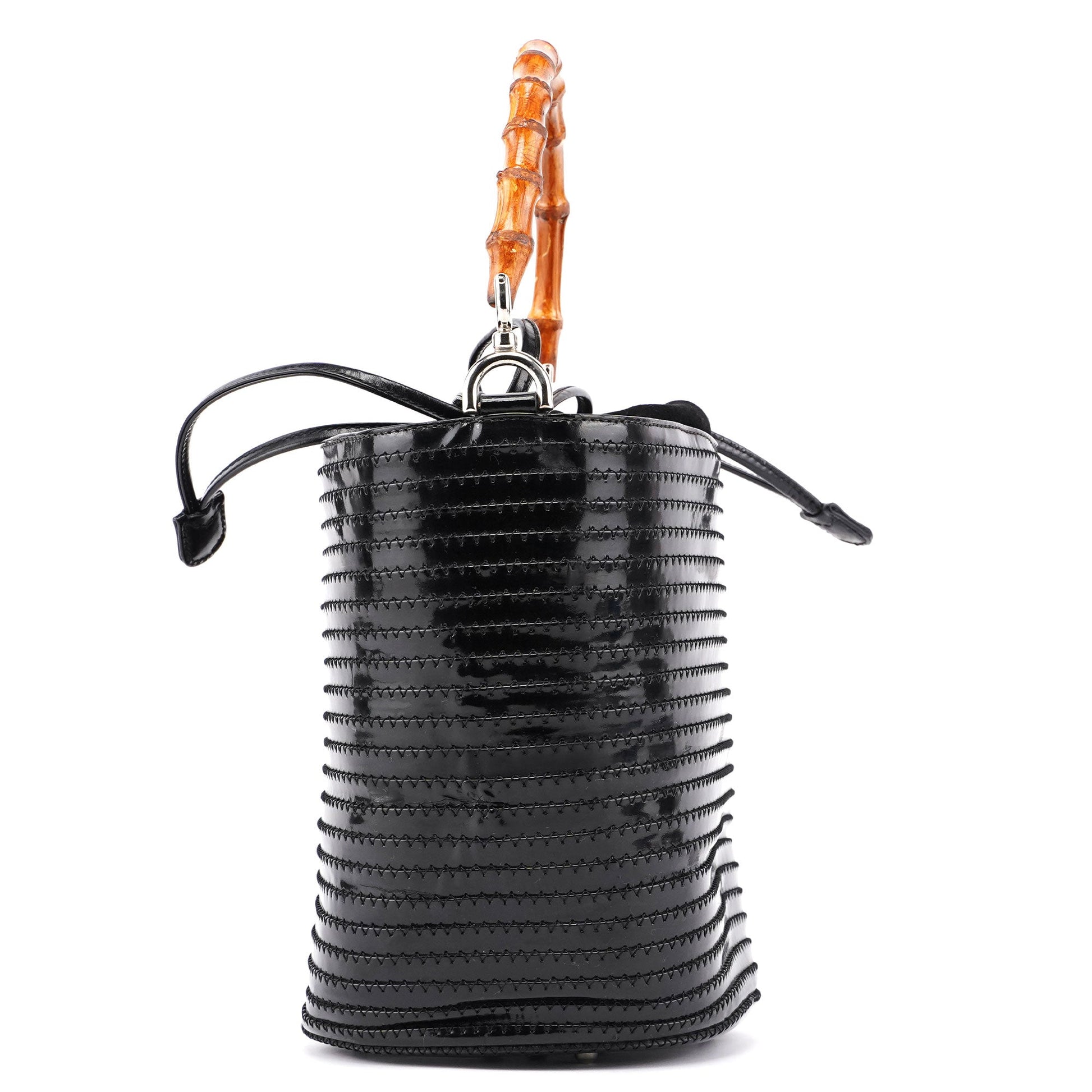 Handcrafted from black quilted patent leather, this Gucci Bamboo bucket bag by Tom Ford from the 1990s features black suede trim, a drawstring closure, classic bamboo handle, and silver-tone hardware. The interior is lined in calfskin leather and includes a zipper pocket, showcasing timeless elegance.