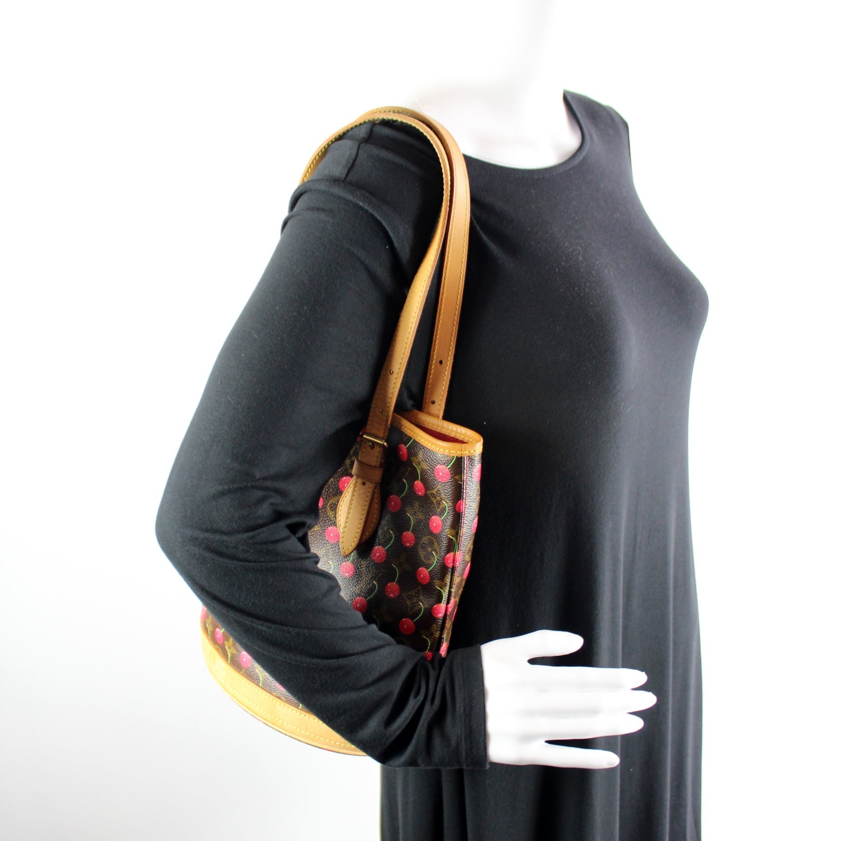 This Louis Vuitton Petit Bucket is guaranteed 100% . The exterior is in the classic Louis Vuitton Monogram/Cerises coated canvas.